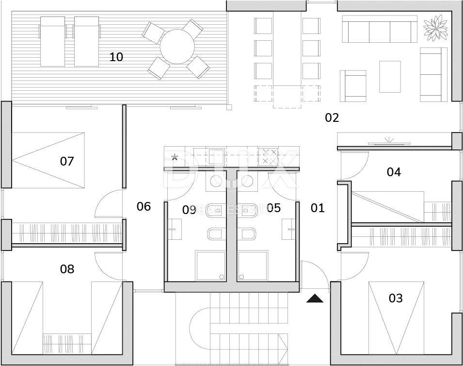 Krovnoj terasi pristupa se dalje stubištem, a s koje se proteže predivan pogled na more i ostatak naselja, isti prostor je moguće po željama budućih vlasnika urediti.