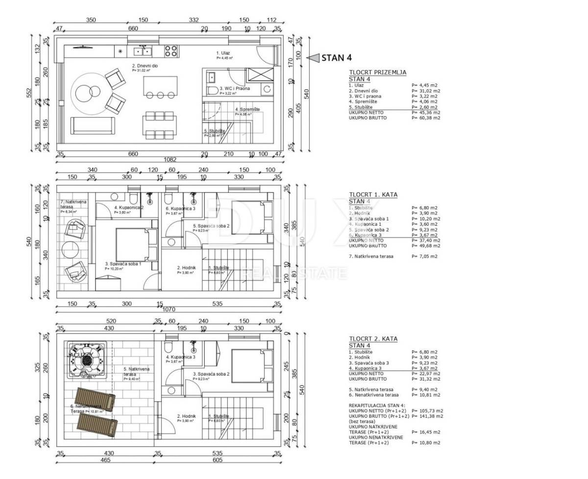 U prizemlju se nalazi prostrani dnevni boravak, blagovaonica i kuhinja u open space konceptu s neometanim pogledom, jedan wc, praonica, spremište i izlaz na terasu s sunčalištem i bazenom, savršenim za opuštanje i uživanje. Na prvom katu su dvije spavaće sobe, svaka s vlastitom kupaonicom, pri čemu jedna soba ima izlaz na natkrivenu terasu od 6,34 m2, idealnu za večernje opuštanje uz romantične zalaske sunca.