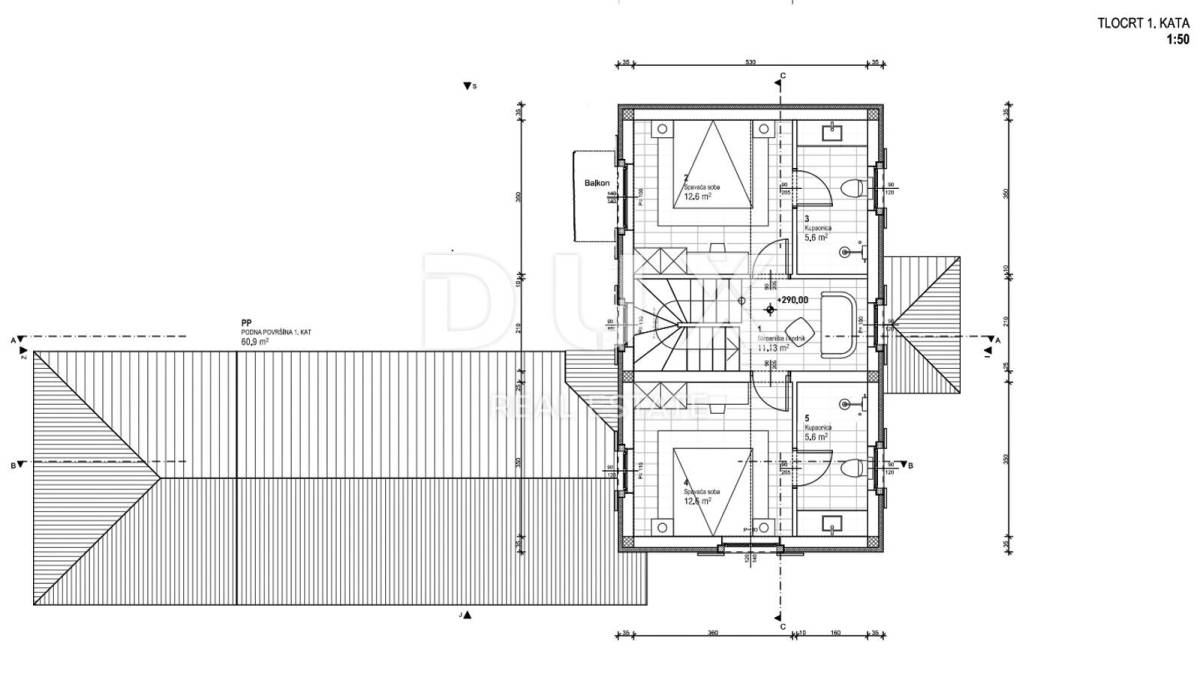 Kuća bezvremenske arhitekture, dijelom obložena kamenom s rustikalnim škurama je koncipirana kao jedna stambena jedinica koja se proteže na dvije etaže; prizemlje i kat.