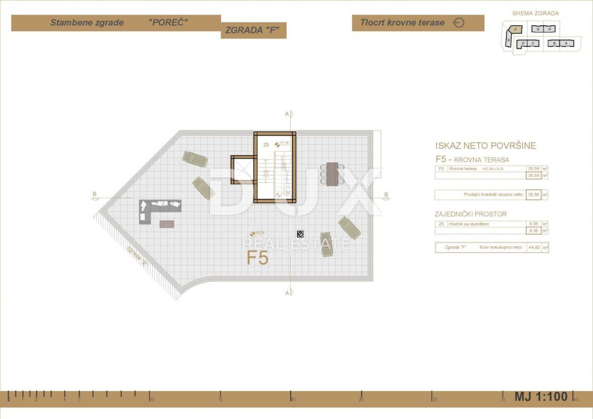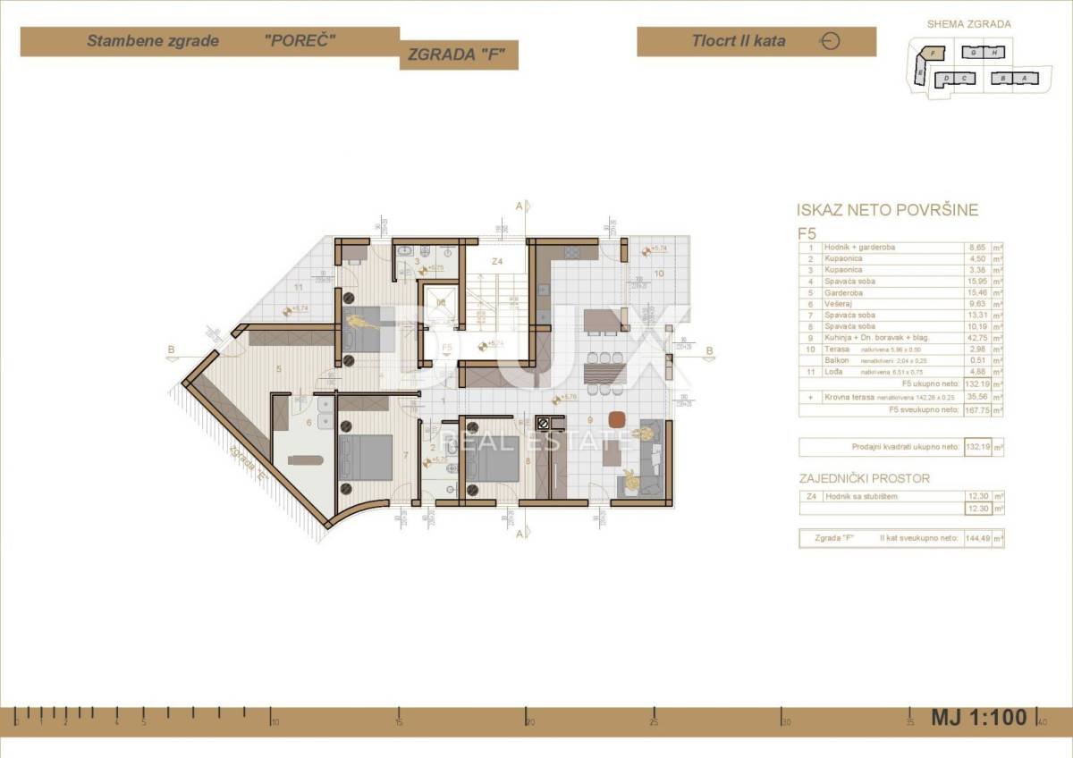 Stan F5- PENTHOUSE - nalazi se na drugom katu zgrade, ukupne stambene površine 132,19 m2 sastoji se od hodnika, dvije kupaonice, četiri spavaće sobe, garderobe, praonice, kuhinje, dnevnog boravka i blagovaone te terase, balkona i lođe. Stanu pripada i nenatrkivena krovna terasa od 142,26 m2 (po koeficijentu od 25% ispada 35,56 m2). Na krovnoj terasi jesu sve instalacije (struja i voda).