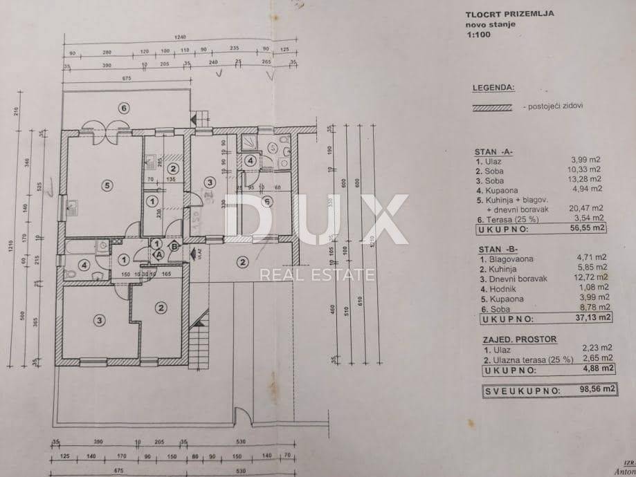 Cijelo prizemlje ukupne površine 98 m2 koja u naravi čini dva zasebna stana, jedan površine 56 m2 i drugi površine 37 m2. Stanovi imaju zasebne ulaze i predstavljaju samostalne uporabne cjeline. Oba je stana potrebno renovirati.