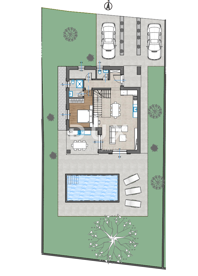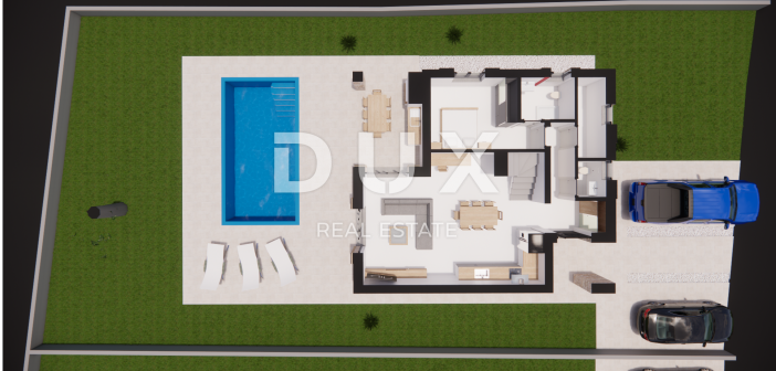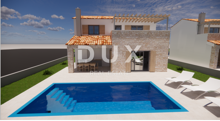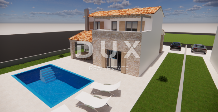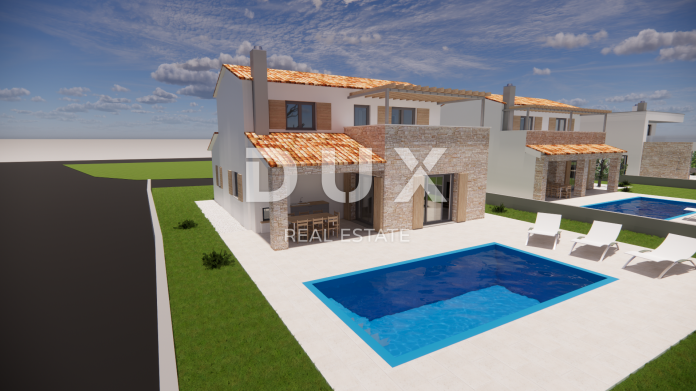 U mirnom ruralnom mjestu na rubu naselja nalazi se ova prekrasna vila okružena zelenilom i opuštajućem prirodnom okruženju. Vila ima ukupnu stambenu površinu 135 m2, a nalazi se na okućnici površine 553 m2. Sastoji se od prizemlja i kata. Prizemlje otvorenog koncepta sastoji se od dnevnog boravka i kuhinje sa blagavaonicom, spavaće sobe sa kupaonicom, gostinjskog wc-a, tehničke sobe, hodnika i stepeništa koji vodi na prvi kat. Na prvom katu se nalaze dvije spavaće sobe sa svojom kupaonicom te izlazom na terasu. Dvorište se sastoji od bazena površine 32 m2 sa sunčalištem i 2 parkirna mjesta. Biti će ugrađeno podno grijanje s dizalicom topline. Svaka prostorija će imati klima uređaj. Sanitarije će biti od njemačkog proizvođaća Hansgrohe, a ugradbeni wc kotlići marke Geberit.