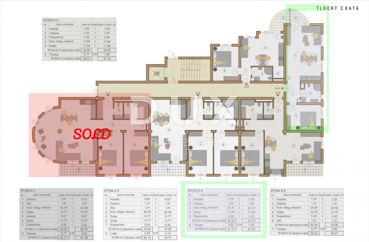 Tako u ovoj zgradi s ponosom predstavljamo stanna 2. katu koji se sastoji od ukupnih 46.53m2 NETO iskoristive površine.