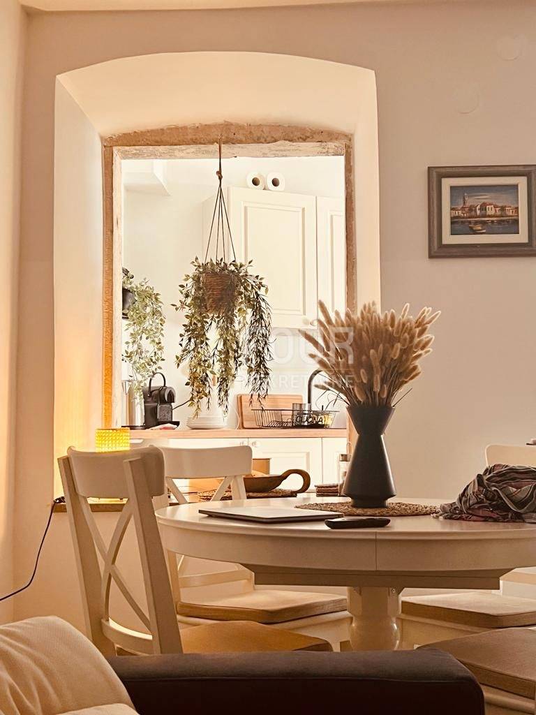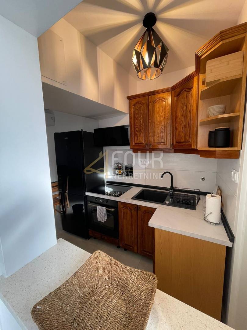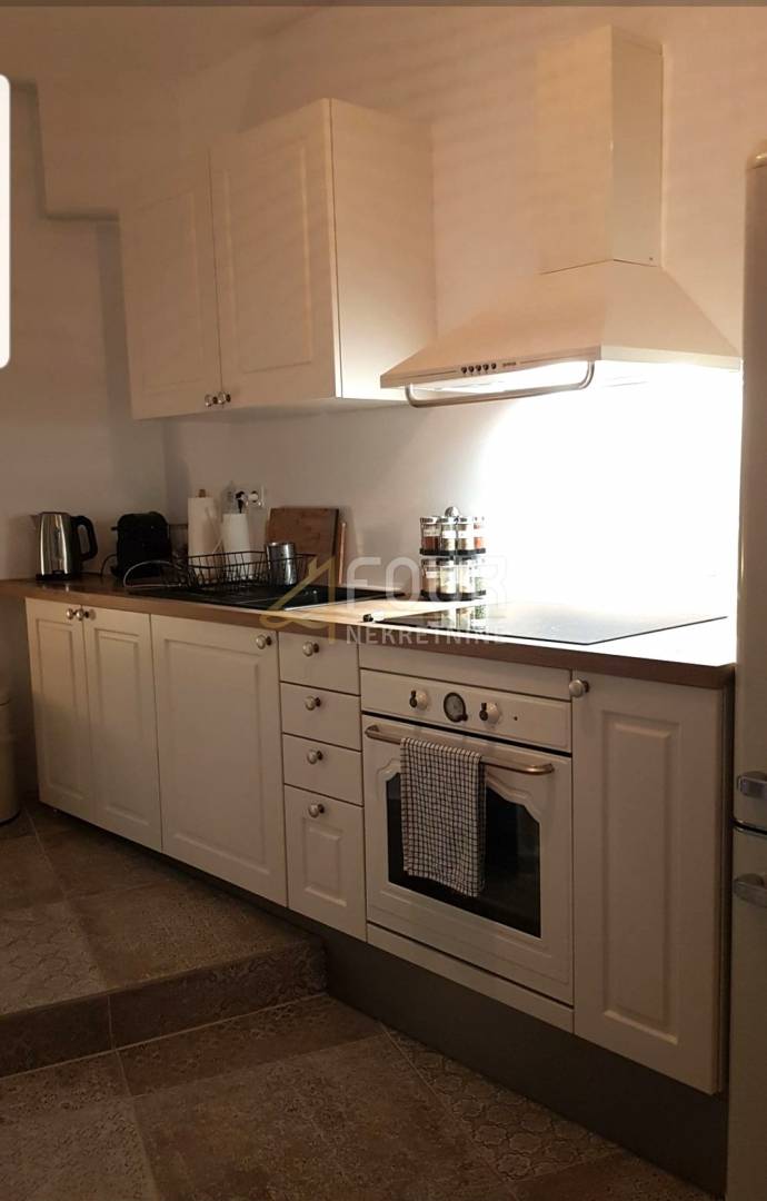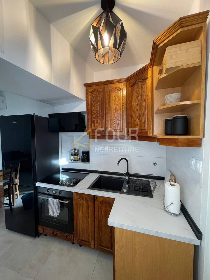 Kompletno je namješten i spreman za useljenje, a sastoji se od manjeg predsoblja, funkcionalne kuhinjice izrađene od punog hrasta, ugodnog dnevnog boravka s velikom kožnom kutnom garniturom te dvije spavaće sobe, pri čemu se do druge spavaće sobe prolazi kroz prvu.