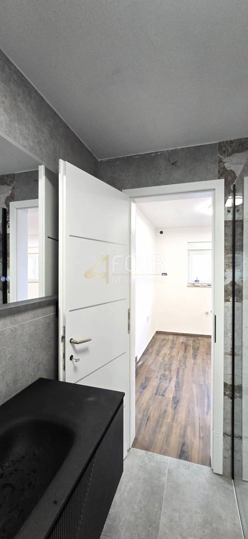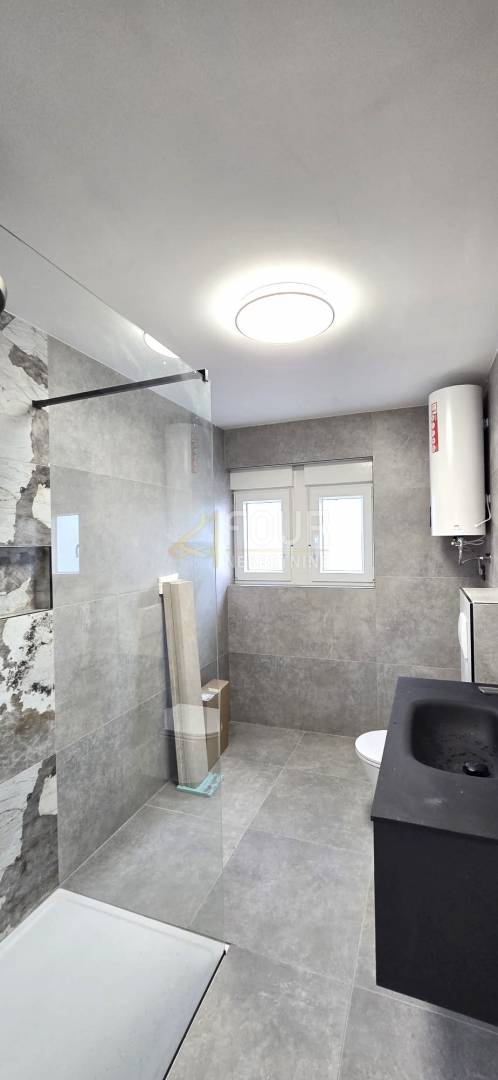 U potpunosti je renoviran, uključujući instalacije struje i vode, kupaonicu i keramiku, opremljen je PVC stolarijom, protuprovalnim vratima te grijanjem na struju. Iz stana se izlazi na prostranu terasu površine približno 30 m2, koja je zajednička s ostalim stanovima, ali je dogovorena podjela tako da svakom stanu pripada oko 30 m2, uz mogućnost fizičkog odvajanja. S terase se pruža otvoren pogled na more, što ovu nekretninu čini posebno atraktivnom.