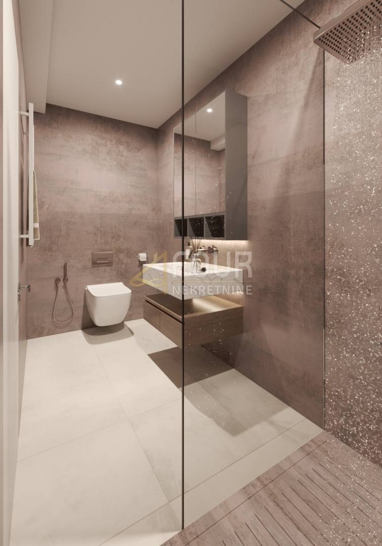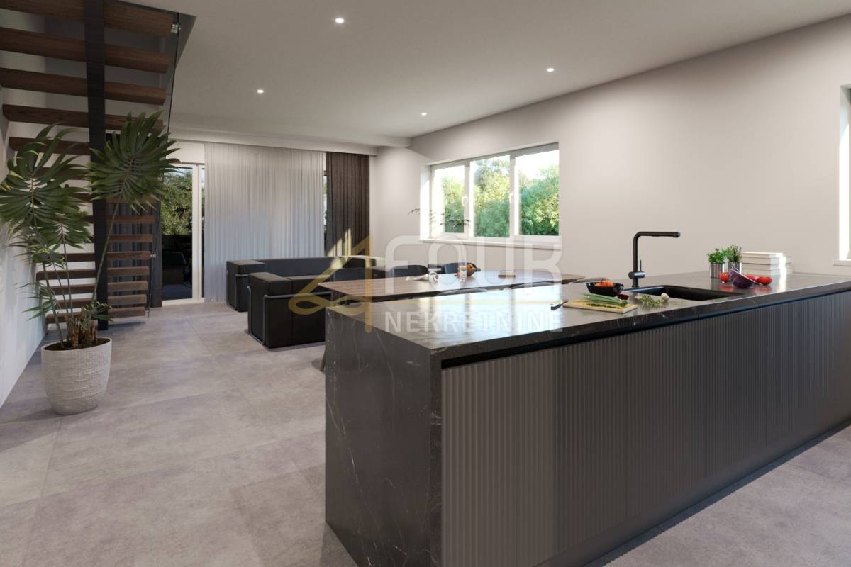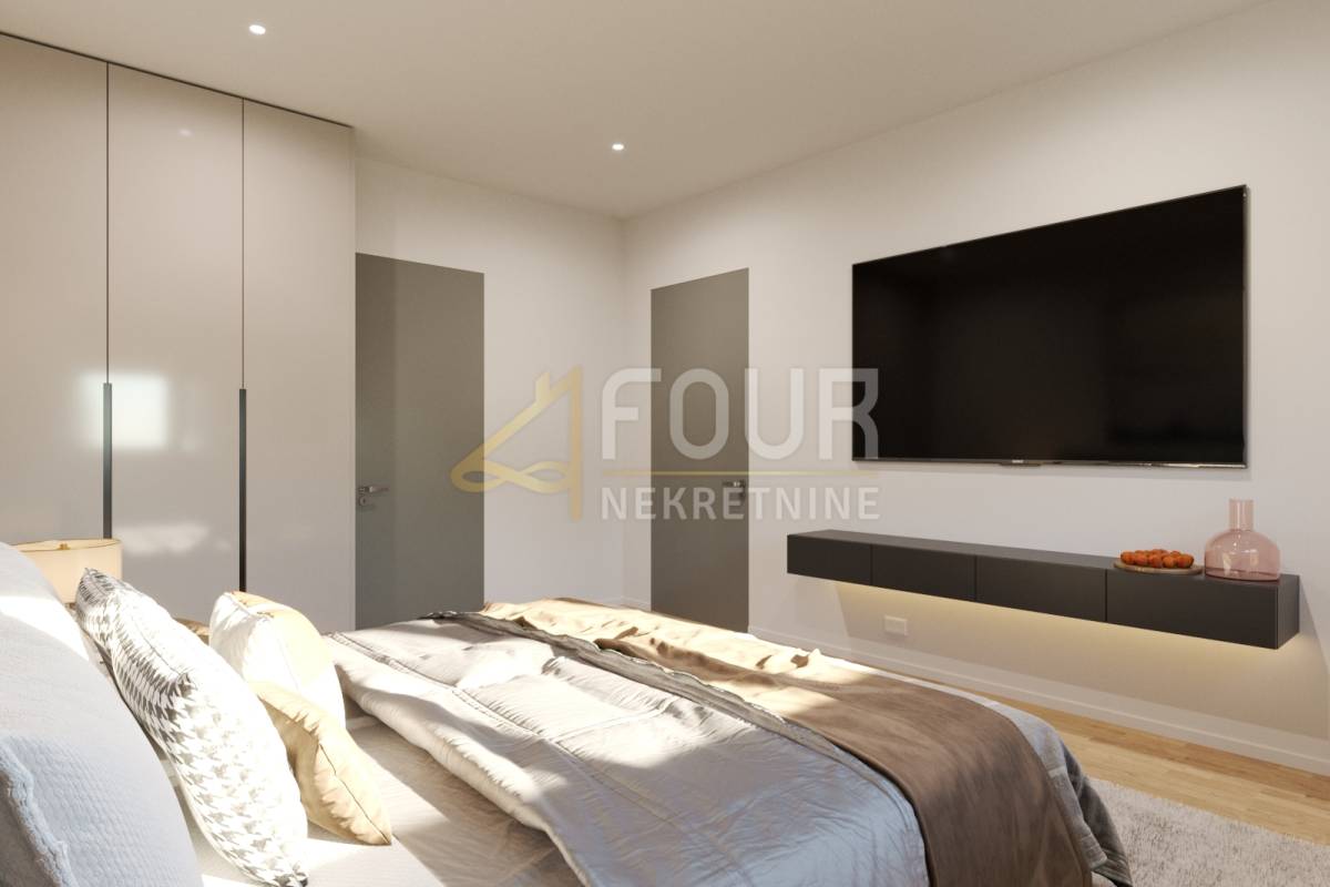 Prva etaža osmišljena je kao prostrani dnevni i spavaći dio, s velikim dnevnim boravkom povezanim s kuhinjom, dvije spavaće sobe, dvije kupaonice, dodatnim gostinjskim WC-om, ulaznim hallom, predsobljem i utility prostorijom. Iz dnevnog dijela izlazi se na balkon koji pruža ugodan prostor za opuštanje. Gornja etaža dodatno naglašava komfor stana te uključuje prostrani prostor predviđen za rekreaciju ili dodatni dnevni boravak, dvije velike spavaće sobe, kupaonicu te izlaz na veliku terasu koja pruža dodatnu privatnost i mogućnost uživanja na otvorenom.