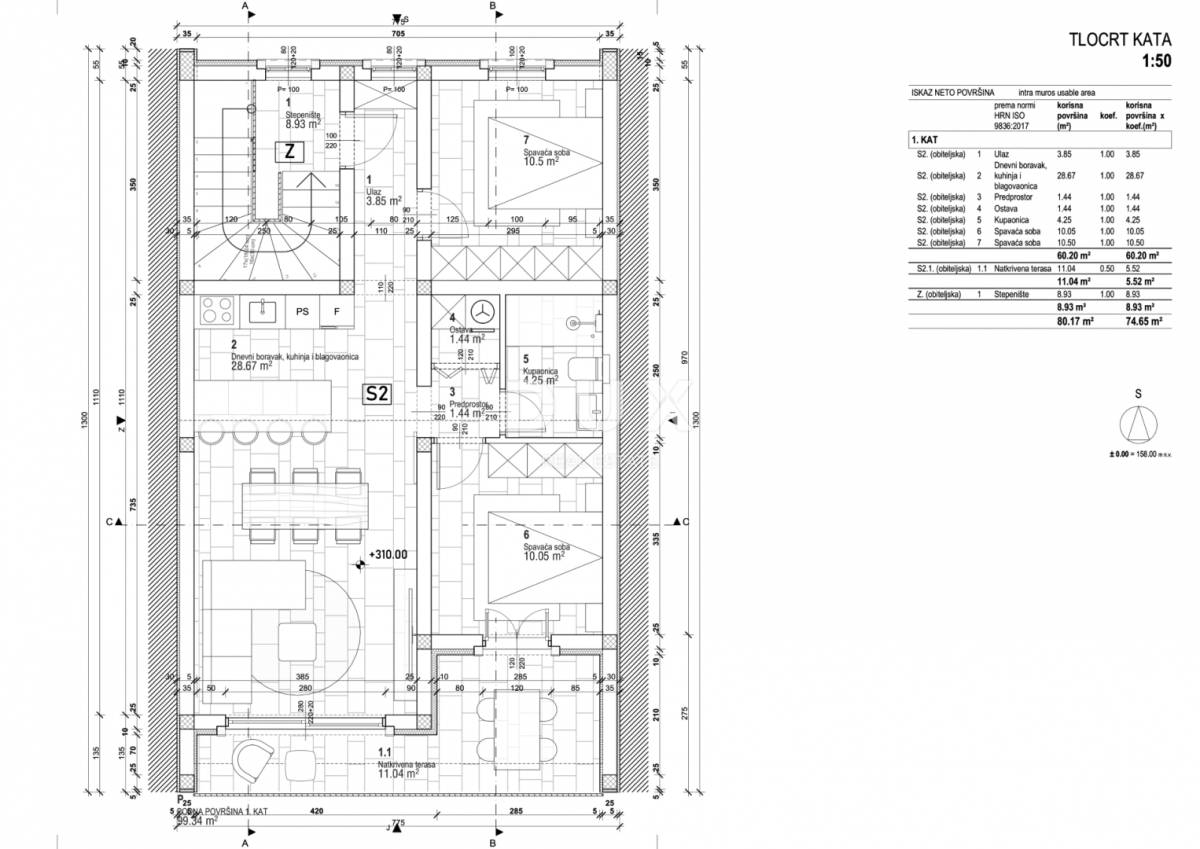 Neto kvadratura s obračunatim koeficijentima iznosi 65,72 m² dok neto kvadratura bez obračunatog koeficijenta iznosi 71,24 m² a uključuje stambeni dio površine 60,20 m² i natkrivenu terasu površine 11,04 m².