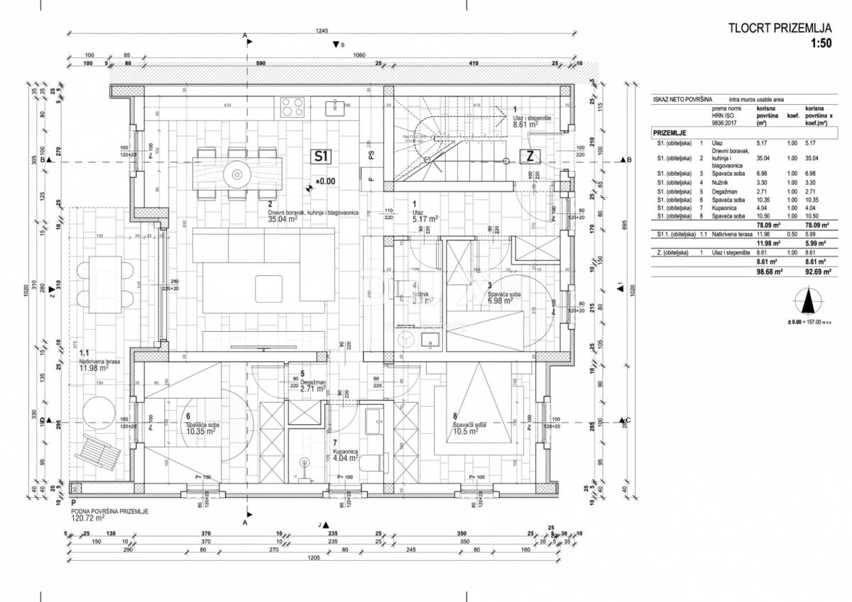 Neto kvadratura s obračunatim koeficijentima iznosi 84,08 m² dok neto kvadratura bez obračunatog koeficijenta iznosi 90,07 m² a uključuje stambeni dio površine 78,09 m² i natkrivenu terasu površine 11,98 m².