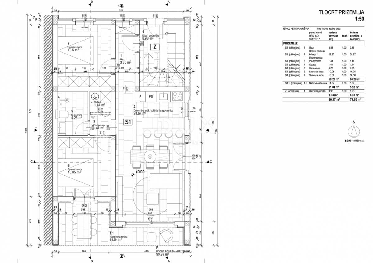 Neto kvadratura s obračunatim koeficijentima iznosi 65,72 m² dok neto kvadratura bez obračunatog koeficijenta iznosi 71,24 m² a uključuje stambeni dio površine 60,20 m² i natkrivenu terasu površine 11,04 m².