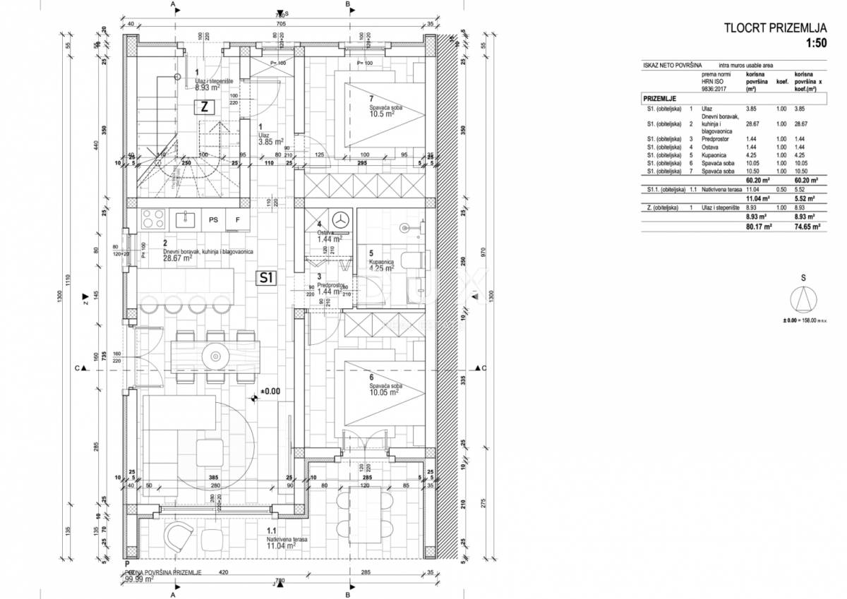 Neto kvadratura s obračunatim koeficijentima iznosi 65,72 m² dok neto kvadratura bez obračunatog koeficijenta iznosi 71,24 m² a uključuje stambeni dio površine 60,20 m² i natkrivenu terasu površine 11,04 m².