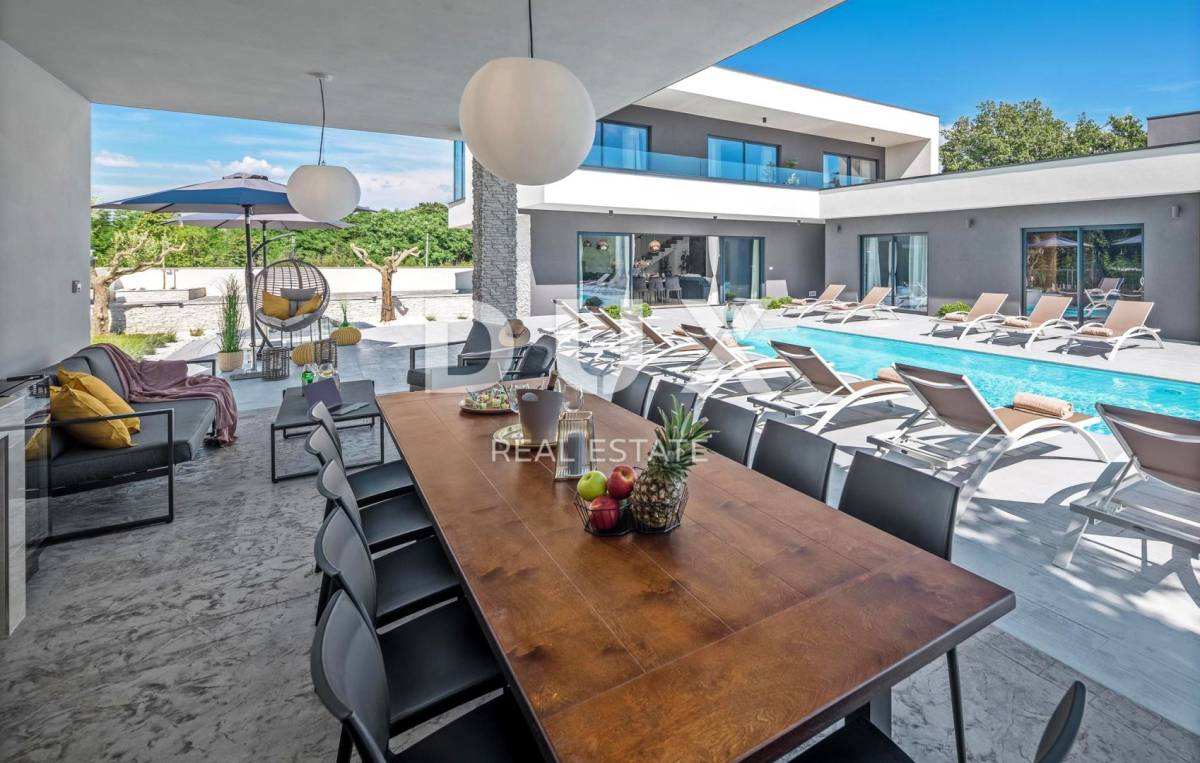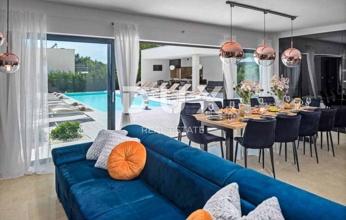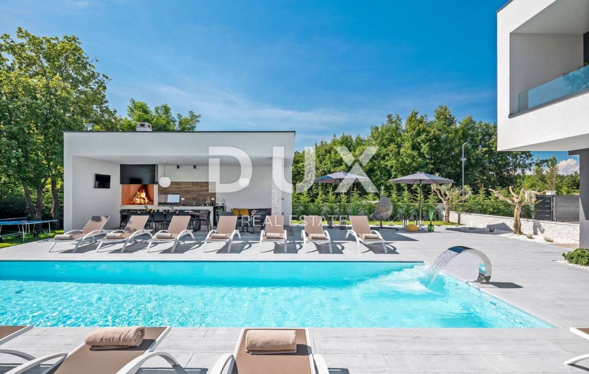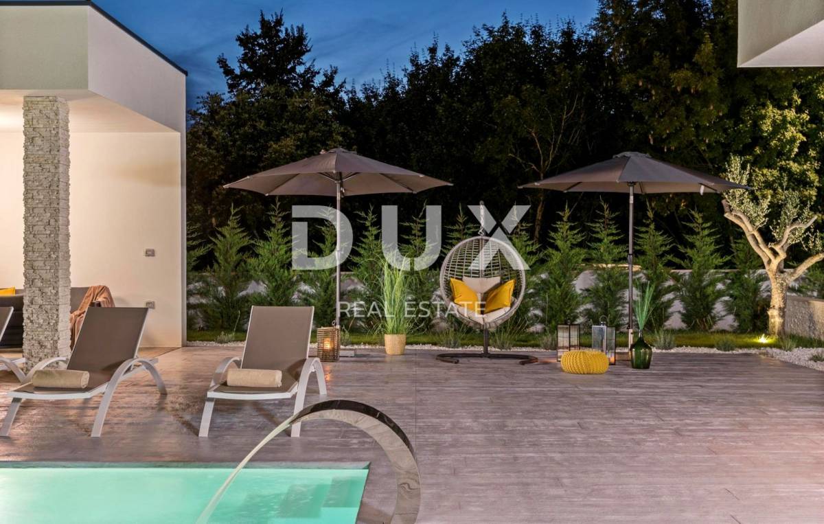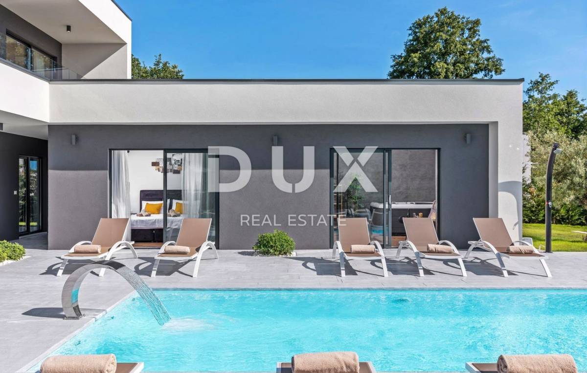 U pitomom susjedstvu u okolici grada Rovinja, okružena prirodom, obiteljskim kućama i kućama za odmor na prodaju je vila moderne arhitekture.
