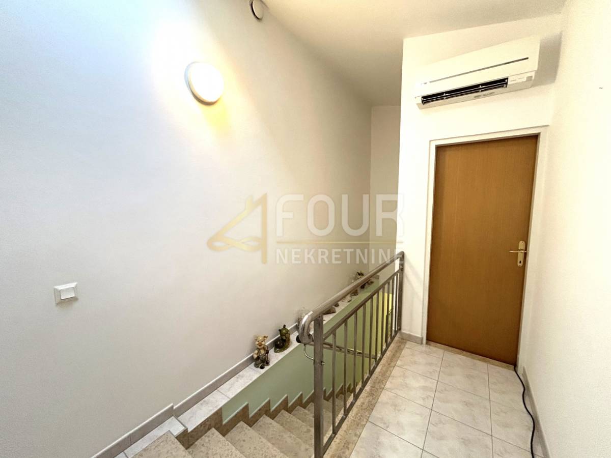 Prizemlje otvara ulazni prostor koji vodi prema kupaonici s jedne strane i otvorenom dnevnom dijelu s druge, gdje kuhinja, blagovaonica i boravak teku kao jedna cjelina. Iz tog dijela prolazi se u mali hodnik koji skriva stepenište prema katu. Na gornjoj etaži nalaze se drugo kupaonice i tri spavaće sobe; dvije su posebno prostrane, svaka s vlastitim walk-in prostorom, dok treća čuva jednostavniji raspored. Kuća ima garažu i dodatnu ostavu, a PVC stolarija i klima osiguravaju ugodan boravak tijekom cijele godine.