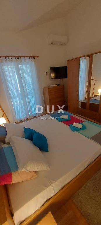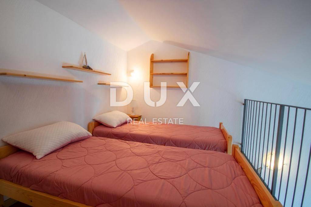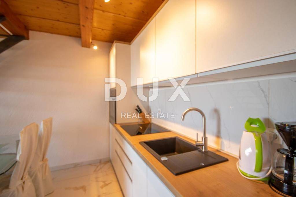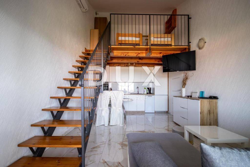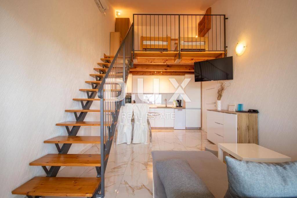 Stan se nalazi na drugom katu stambene zgrade koji se sastoji od ulaza, dnevnog djela s kuhinjom, jednom spavaćom sobom, kupatilom te loggiom-terasom od 14m2 s pogledom na more u dolljnjem djelu dok stepeništem u galeriji nalazimo još jednu spavaću sobu svojih 15m2