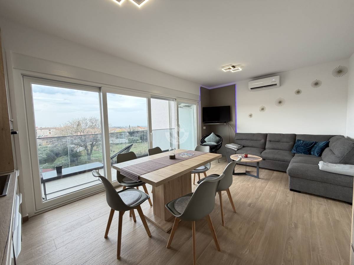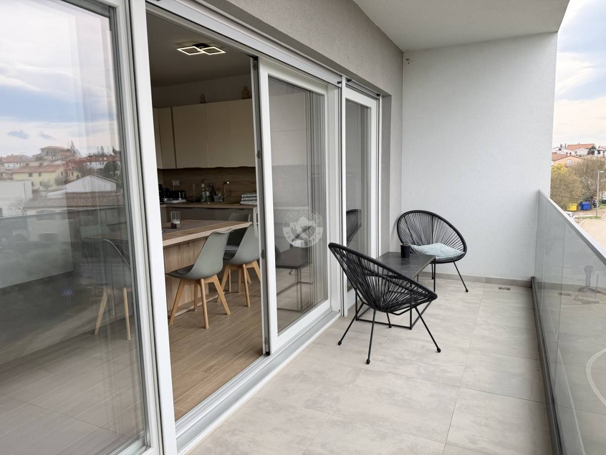 Na prodaju je vrhunski uređen i potpuno namješten trosoban stan smješten na 3. katu moderne zgrade s liftom, u mirnom i atraktivnom mjestu Tar, nedaleko od Poreča.