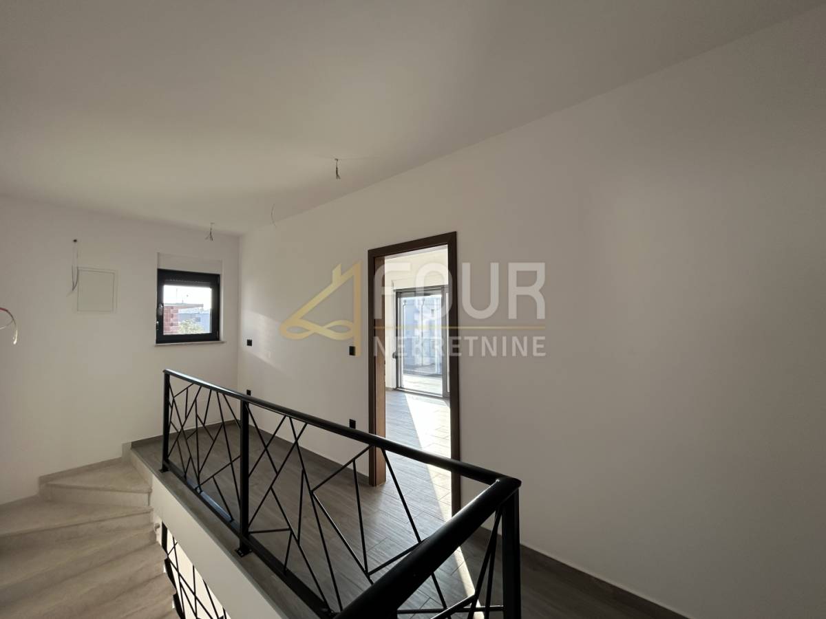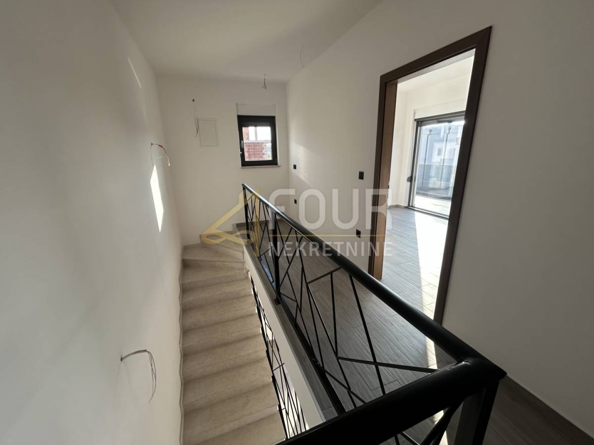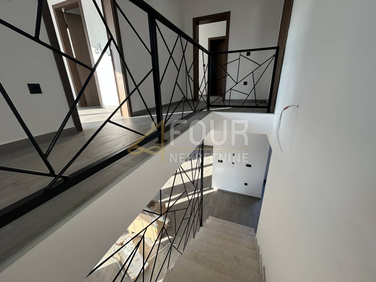 Unutarnje stubište vodi na kat na kojem se nalazi hodnik i još tri iznimno prostrane spavaće sobe, svaka sa svojom kupaonicom. Jedna soba ima manji balkon, dok preostale dvije izlaze na zajedničku veliku terasu. Cijela je kuća obložena keramičkim pločicama, vrlo svijetla i osunčana, uz iznimno komforne prostorije.