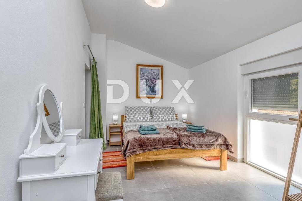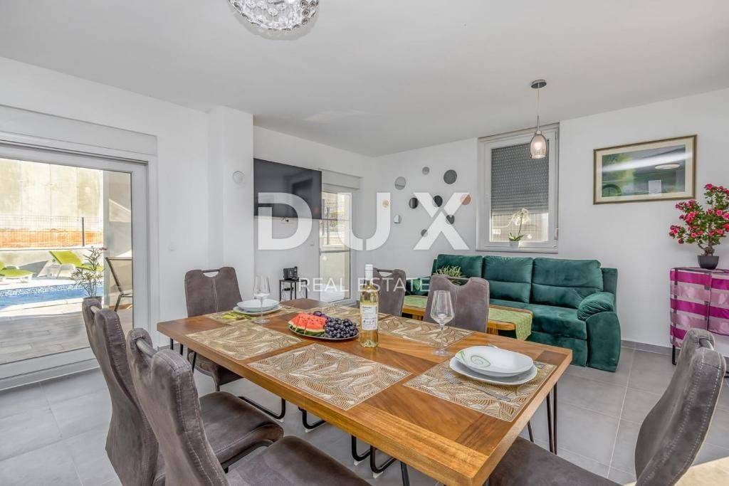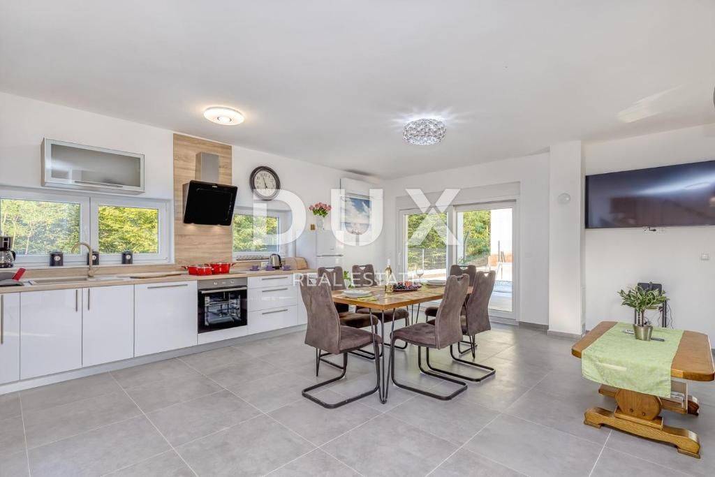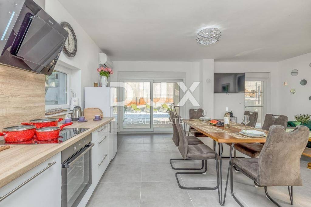 U prizemlju kuća, na samome ulazu nalazi se predvorje koje nas uvodi prema većem open space prostoru s komotnim dnevni boravkom, blagovaonom i moderno opremljenom kuhinjom. Ovaj prostor krase veće klizne staklene stijenke kroz koje se proteže pogled i pristup prema okućnici kuće i bazenu, te većoj natkrivenoj terasi idealnoj za opuštanje s prijateljima i obitelji. U prizemlju se dodatno nalaze izdvojena gostinjska kupatila i ostava.