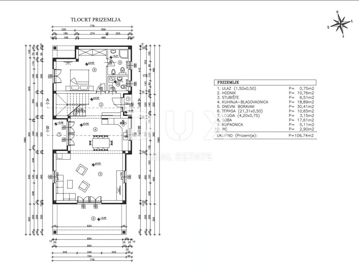 - Prizemlje: Prostrani dnevni boravak s kuhinjom i blagovaonom, gostinjski WC, spavaća soba s vlastitom kupaonicom i natkrivenim balkonom.