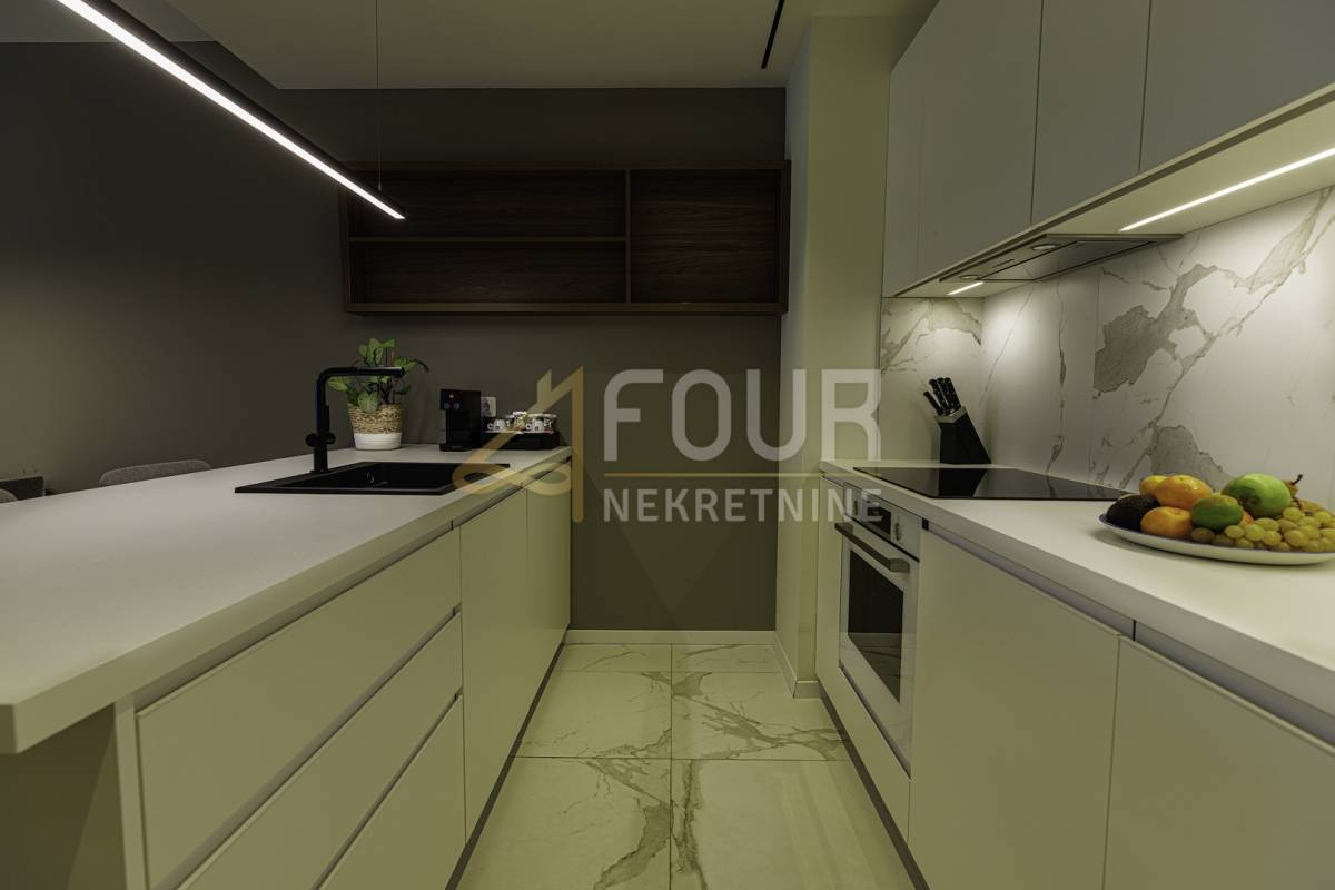 Kuhinja je potpuno opremljena modernim ugradbenim aparatima koji uključuju pećnicu, indukcijsku ploču za kuhanje, perilicu posuđa, napu te kombinirani hladnjak sa zamrzivačem. Namještaj je izrađen po mjeri - uključuje niske i visoke kuhinjske ormariće, kao i kuhinjski otok s radnom plohom od bijelog kvarca. Uz otok su postavljene i barske stolice, što dodatno doprinosi funkcionalnosti i modernom dizajnu prostora.