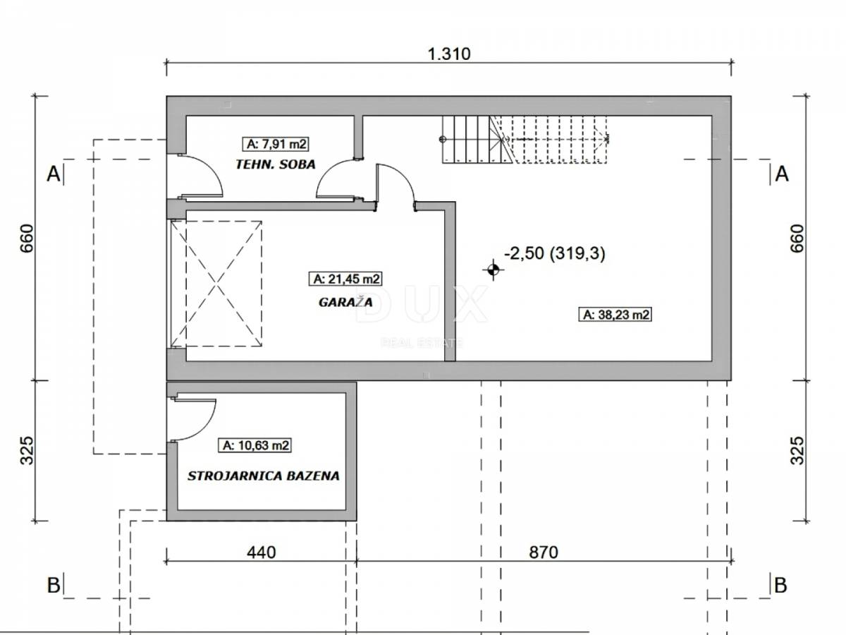 Suteren se sastoji od garaže, višenamjenske prostorije predviđene kao prostor za druženje, biljar prostoriju, teretanu ili wellness zonu, tehničke prostorije i strojarnice bazena.