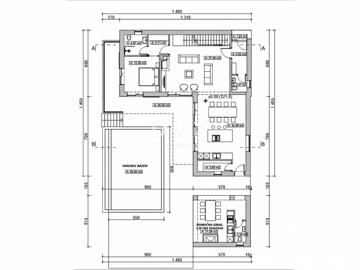 Okućnica je ambijentalno i hortikulturno uređena i ograđena a savršen sklad zaokružuju dodatni sadržaji kao pomoćni objekt koji sadrži ljetnu kuhinju s toaletom te bazen sa sunčalištem.