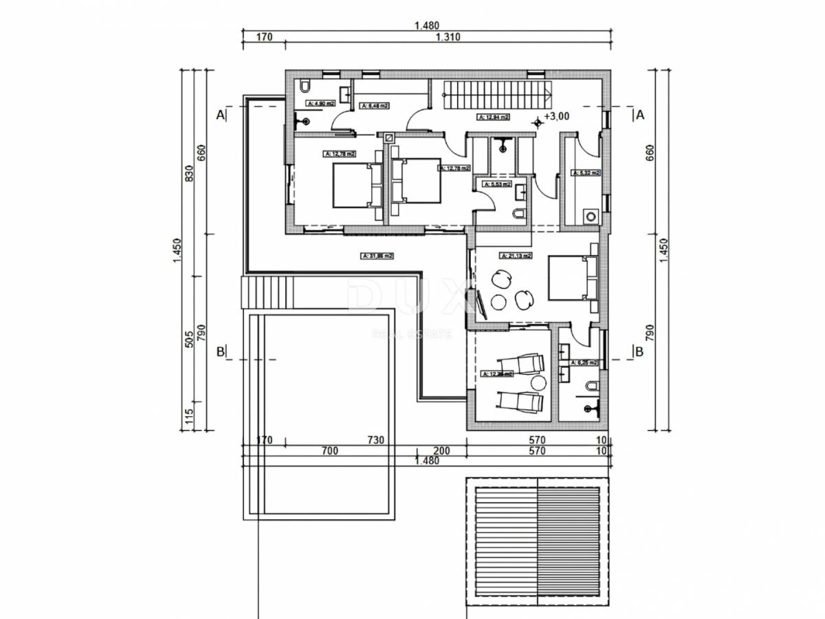 Kat se sastoji od predsoblja, spremišta i tri spavaće sobe s vlastitim kupaonicama a sve sobe imaju pristup balkonu.