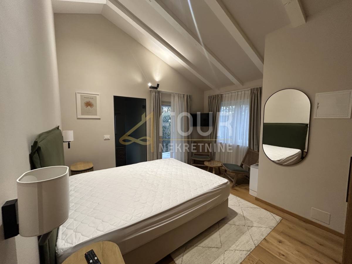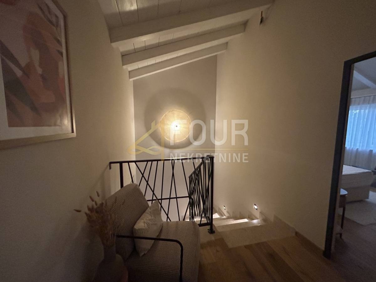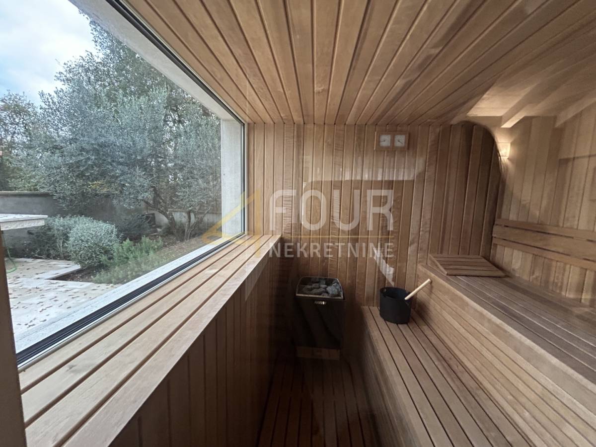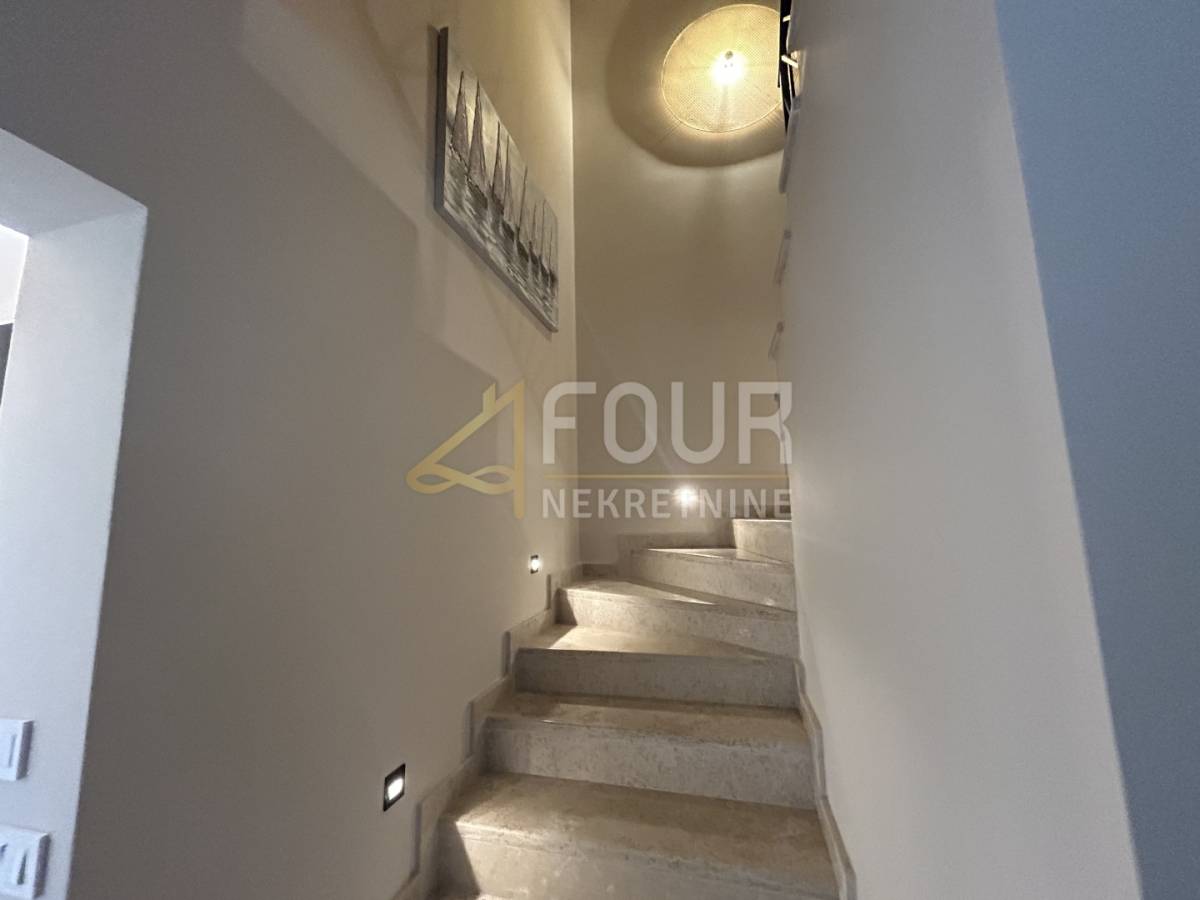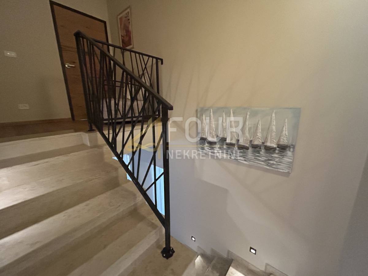 U prizemlju se nalazi prostrani dnevni boravak s blagovaonicom i modernom kuhinjom, sve s direktnim izlazom na natkrivenu terasu. Na istoj etaži smještene su i dvije spavaće sobe, obje s vlastitim kupaonicama, od kojih se u jednu ulazi iz dnevnog boravka. Tu su još hodnik, spremište, gostinjski toalet, lounge zona s izlazom na terasu te sauna koja prostoru daje poseban doživljaj privatnog wellnessa. Na katu se nalaze još dvije elegantne spavaće sobe, svaka sa svojom kupaonicom, a jedna ima i vlastiti balkon s pogledom na prirodu i more.