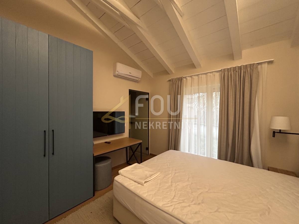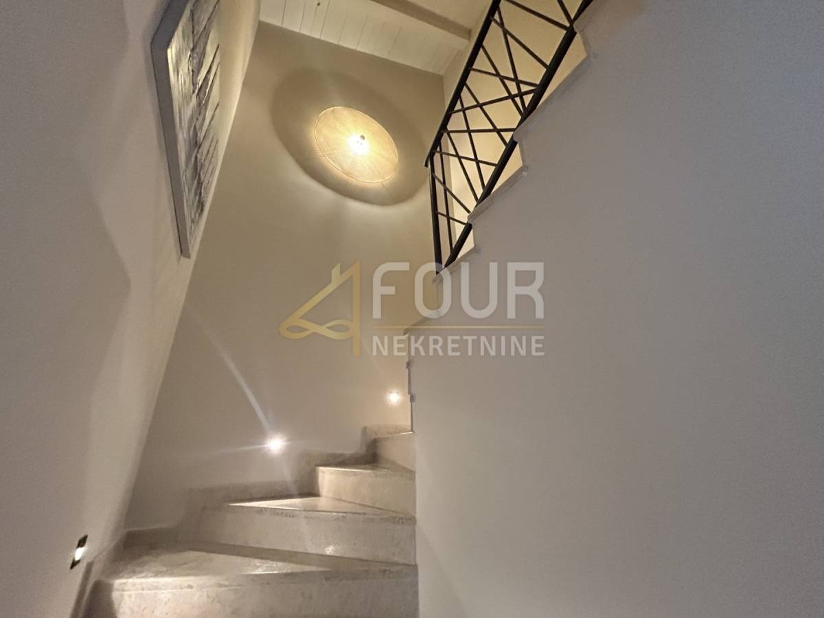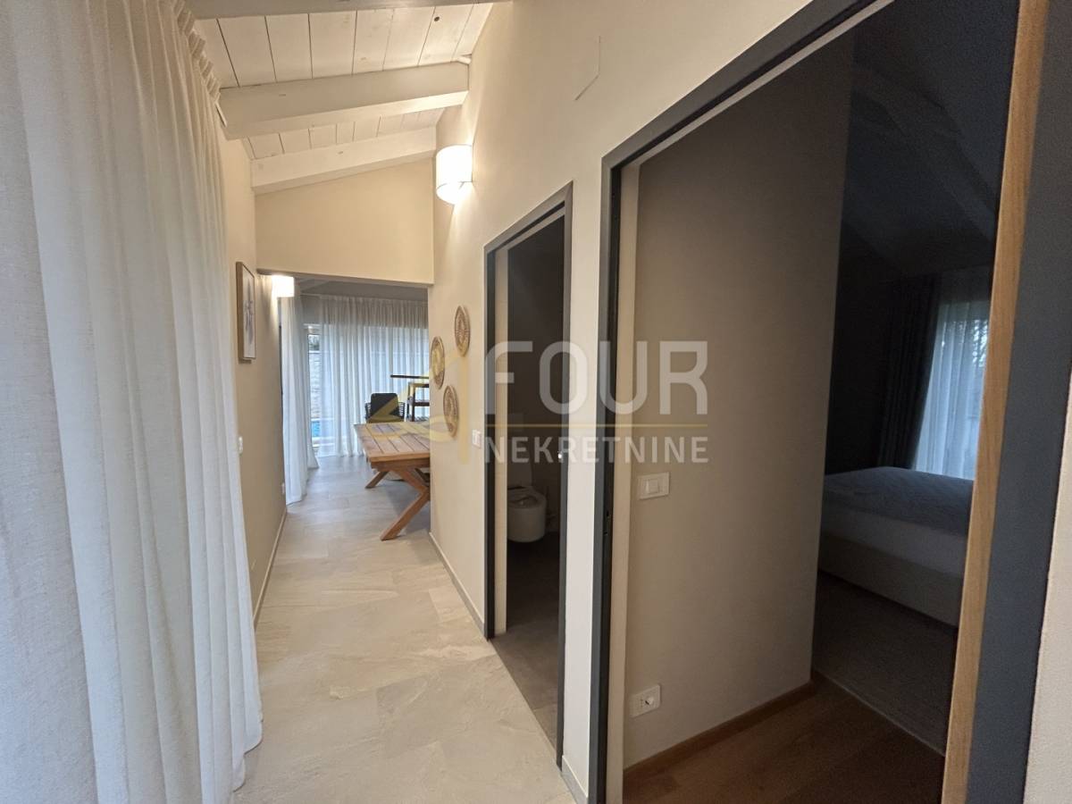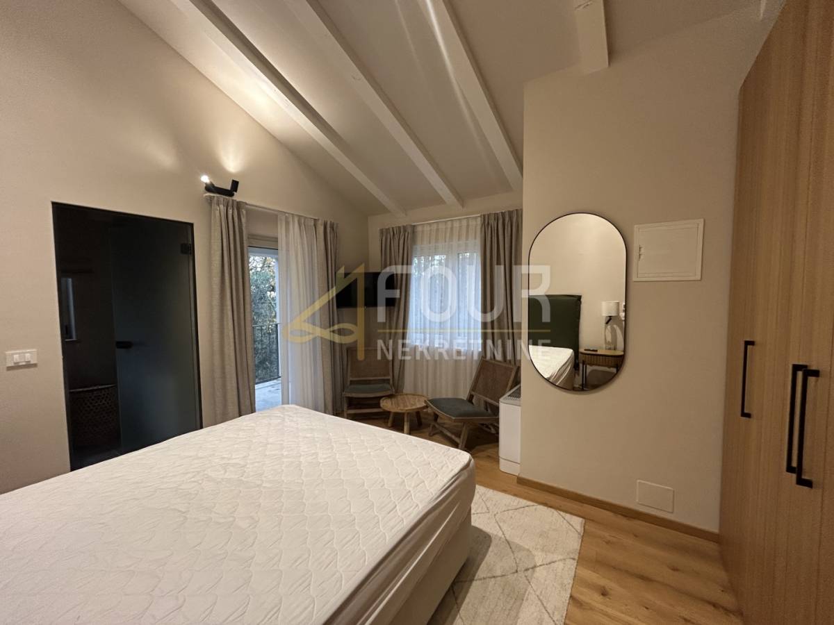 U prizemlju se nalazi prostrani dnevni boravak s blagovaonicom i modernom kuhinjom, sve s direktnim izlazom na natkrivenu terasu. Na istoj etaži smještene su i dvije spavaće sobe, obje s vlastitim kupaonicama, od kojih se u jednu ulazi iz dnevnog boravka. Tu su još hodnik, spremište, gostinjski toalet, lounge zona s izlazom na terasu te sauna koja prostoru daje poseban doživljaj privatnog wellnessa. Na katu se nalaze još dvije elegantne spavaće sobe, svaka sa svojom kupaonicom, a jedna ima i vlastiti balkon s pogledom na prirodu i more.