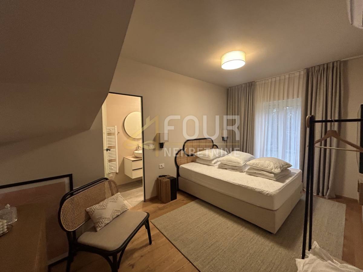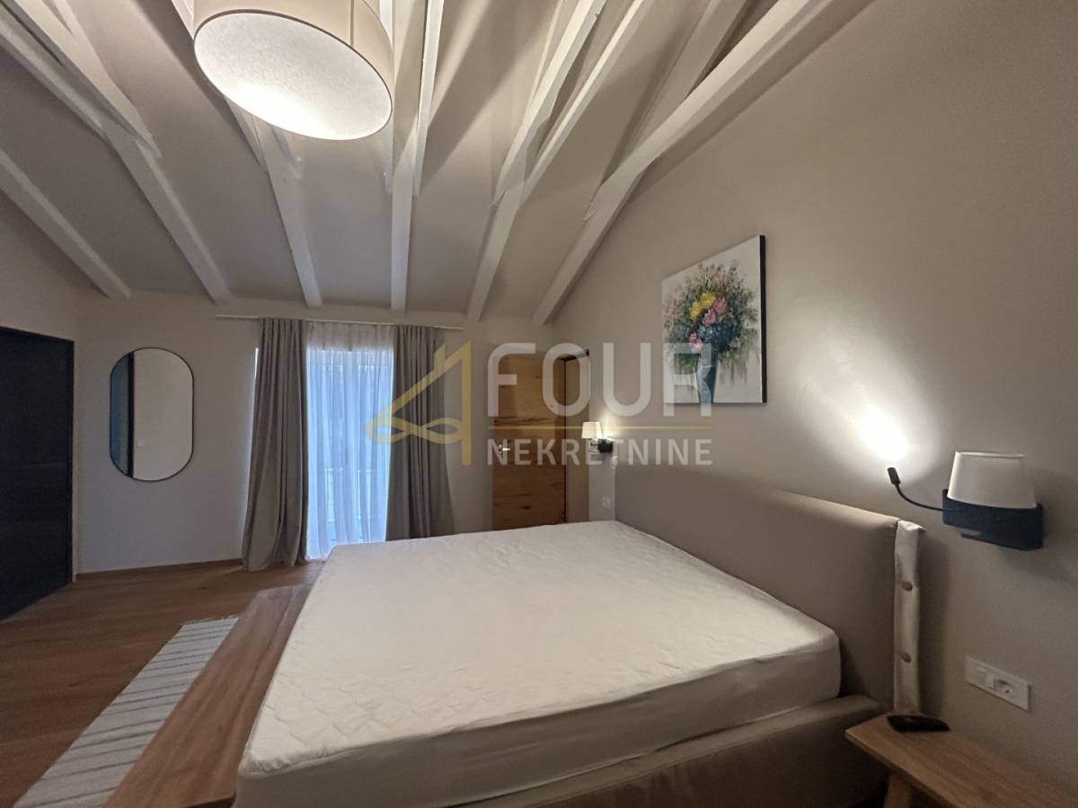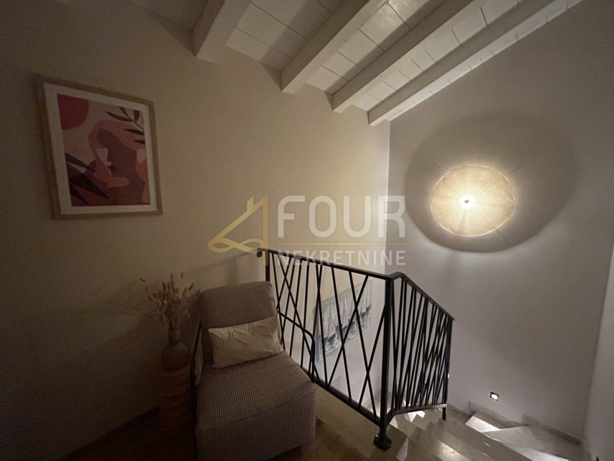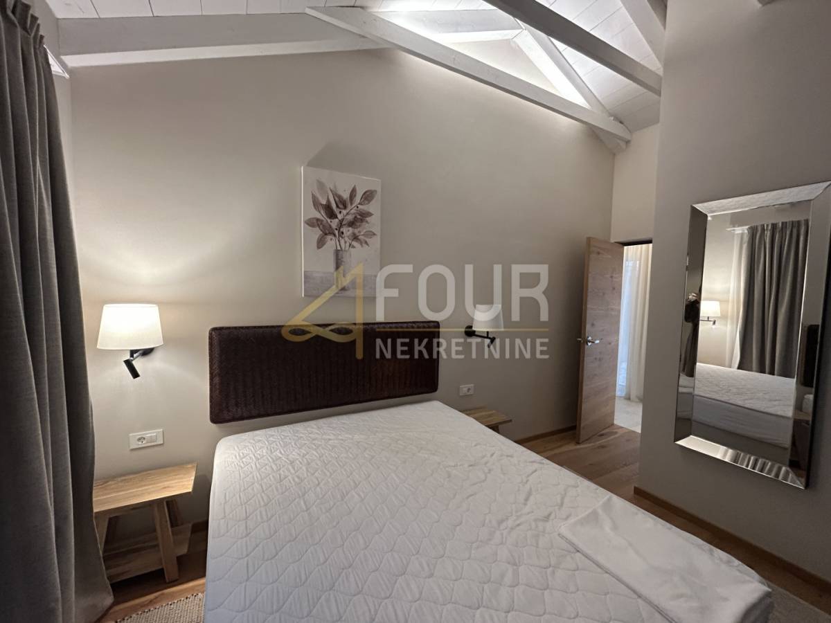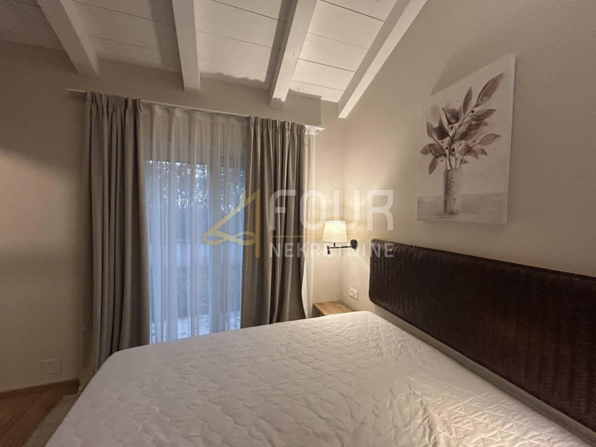 U prizemlju se nalazi prostrani dnevni boravak s blagovaonicom i modernom kuhinjom, sve s direktnim izlazom na natkrivenu terasu. Na istoj etaži smještene su i dvije spavaće sobe, obje s vlastitim kupaonicama, od kojih se u jednu ulazi iz dnevnog boravka. Tu su još hodnik, spremište, gostinjski toalet, lounge zona s izlazom na terasu te sauna koja prostoru daje poseban doživljaj privatnog wellnessa. Na katu se nalaze još dvije elegantne spavaće sobe, svaka sa svojom kupaonicom, a jedna ima i vlastiti balkon s pogledom na prirodu i more.