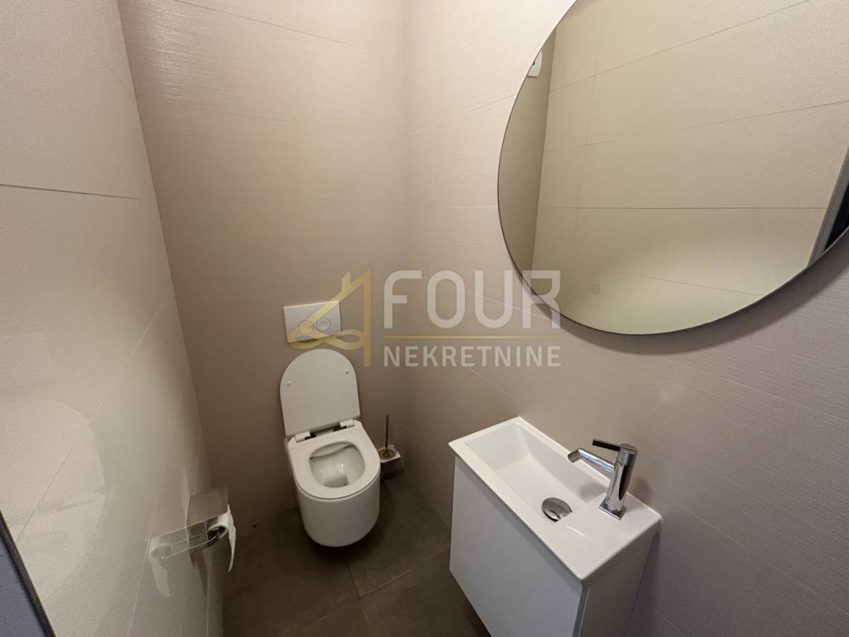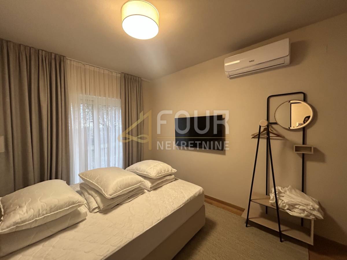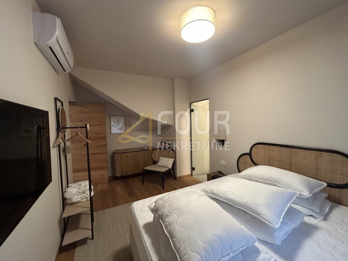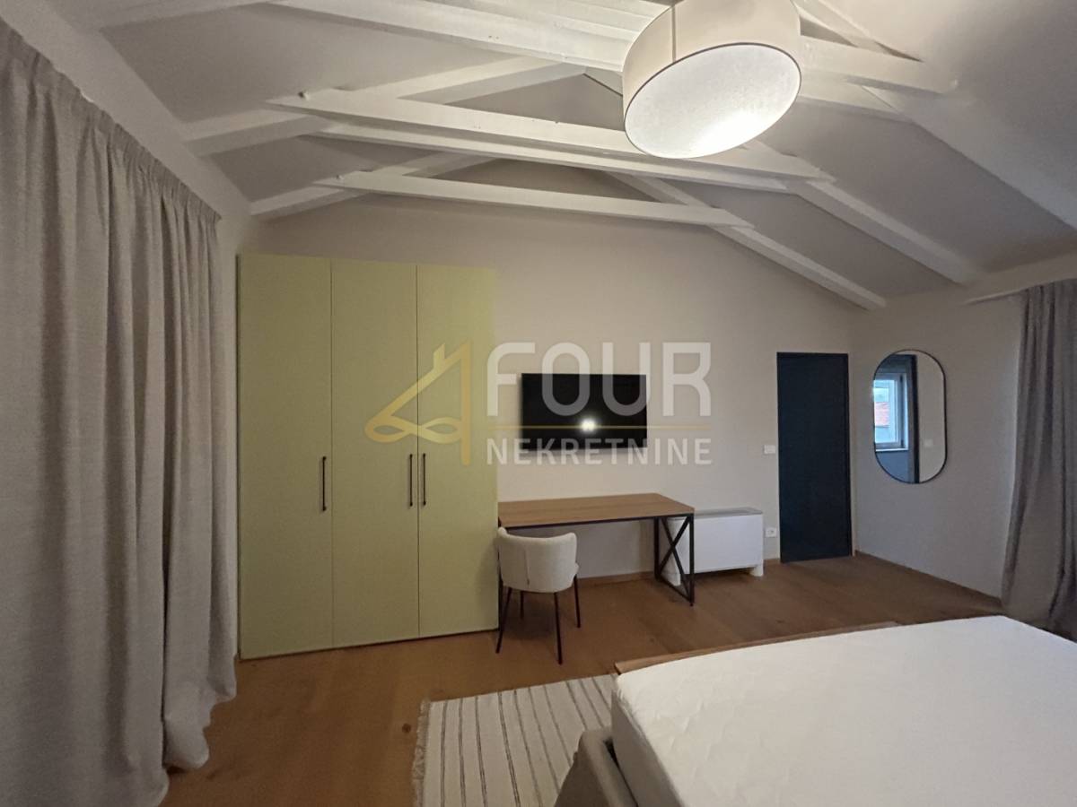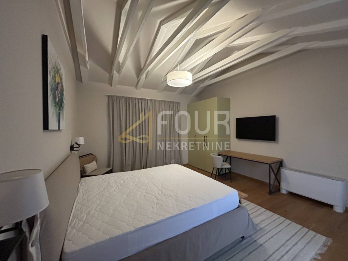 U prizemlju se nalazi prostrani dnevni boravak s blagovaonicom i modernom kuhinjom, sve s direktnim izlazom na natkrivenu terasu. Na istoj etaži smještene su i dvije spavaće sobe, obje s vlastitim kupaonicama, od kojih se u jednu ulazi iz dnevnog boravka. Tu su još hodnik, spremište, gostinjski toalet, lounge zona s izlazom na terasu te sauna koja prostoru daje poseban doživljaj privatnog wellnessa. Na katu se nalaze još dvije elegantne spavaće sobe, svaka sa svojom kupaonicom, a jedna ima i vlastiti balkon s pogledom na prirodu i more.