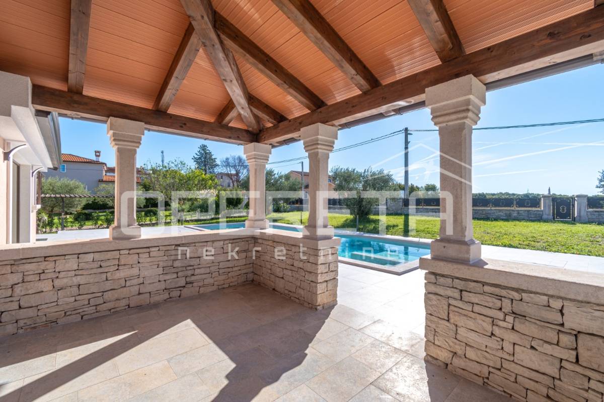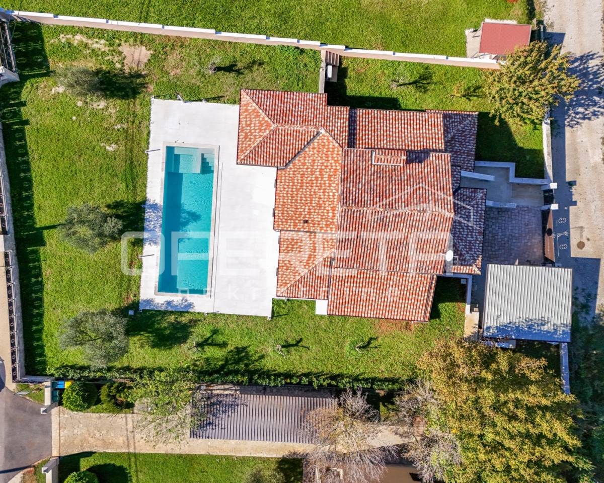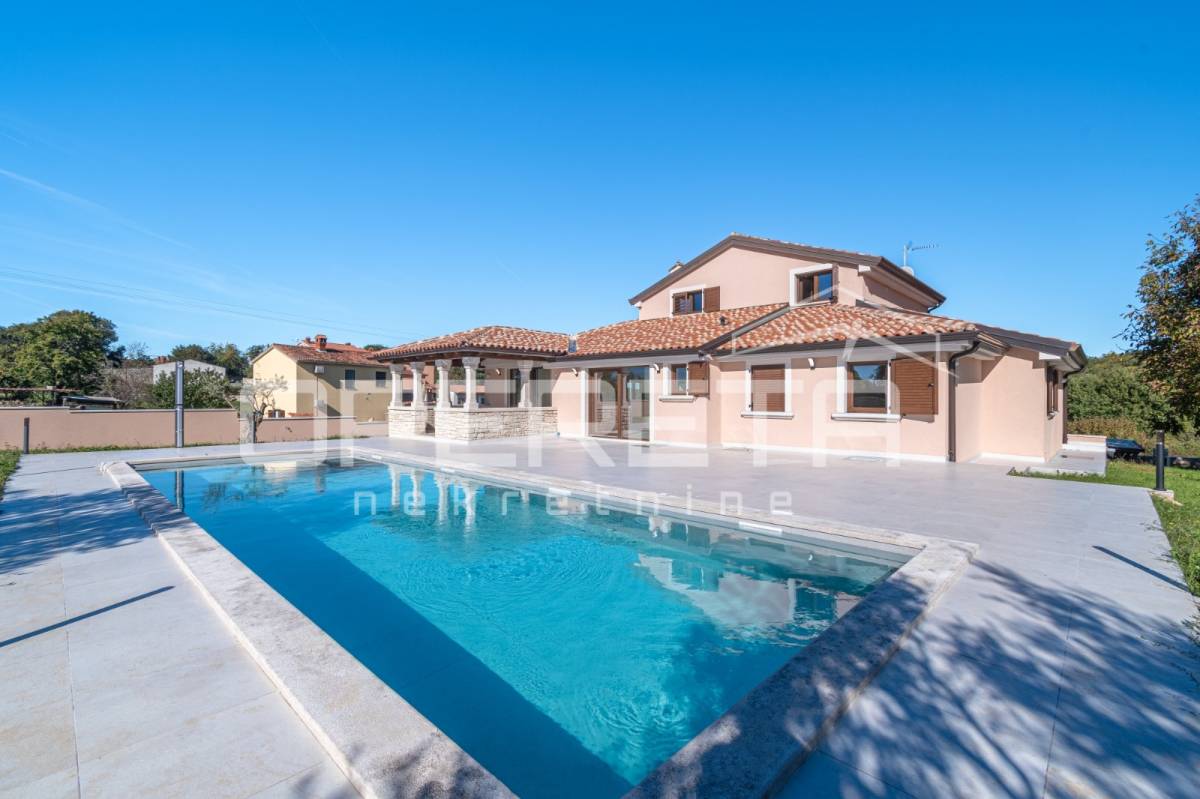 Vanjski dio vile odiše mirnoćom i skladom – tu se nalazi bazen od 50 m² sa sunčalištem i vanjskim tušem, masline starije od 60 godina te sustav automatskog navodnjavanja travnjaka. Prostrano dvorište osigurava potpunu privatnost, a uređenje mediteranskim biljem stvara ambijent savršen za uživanje u istarskom suncu.