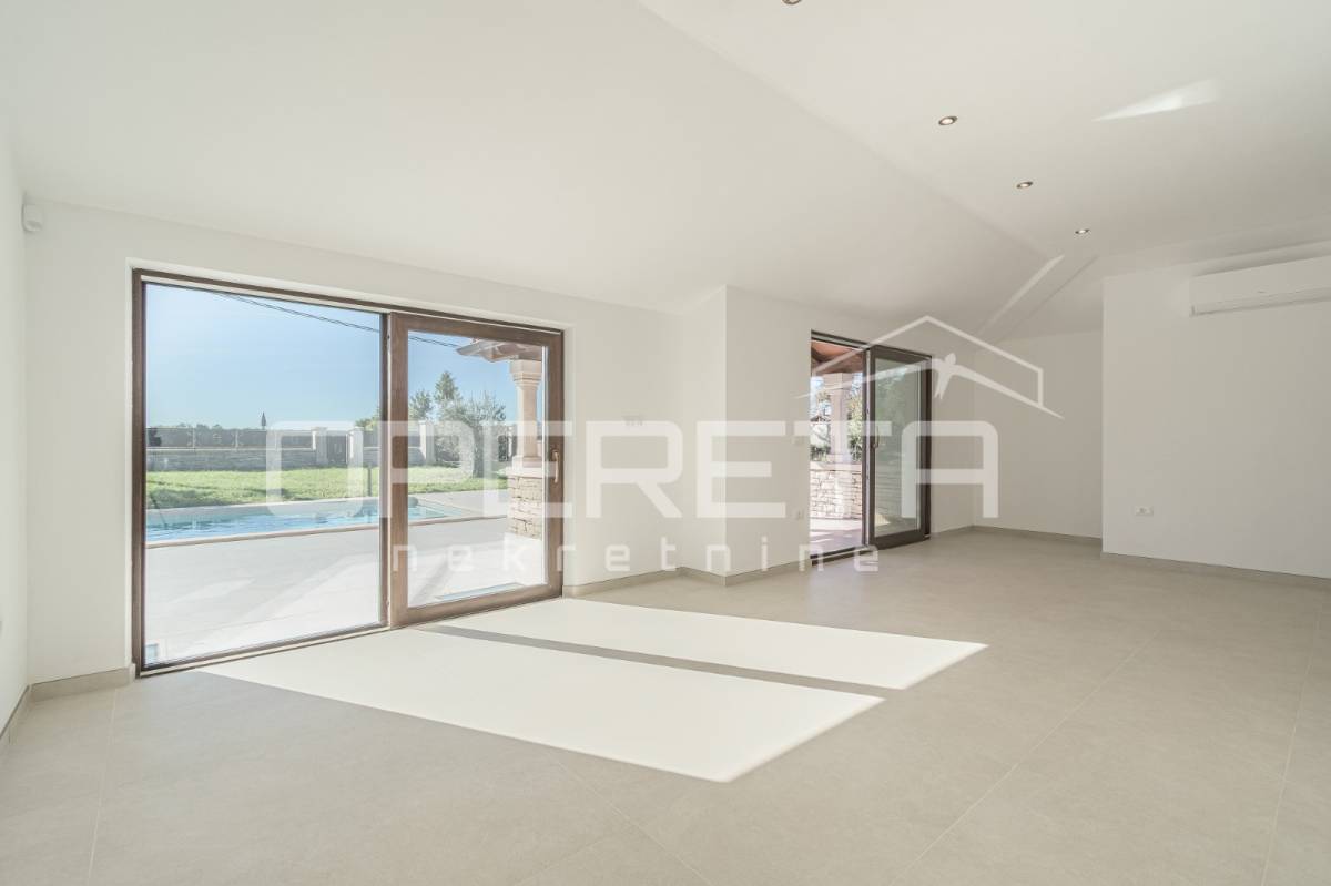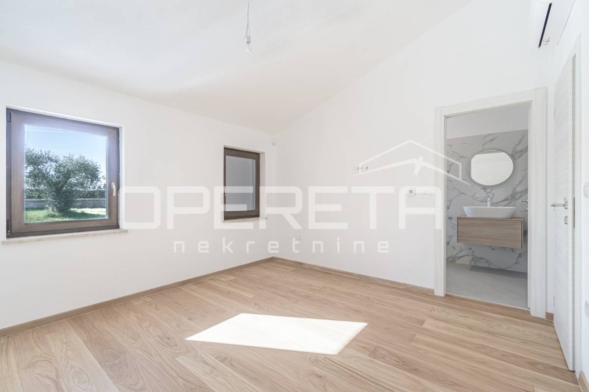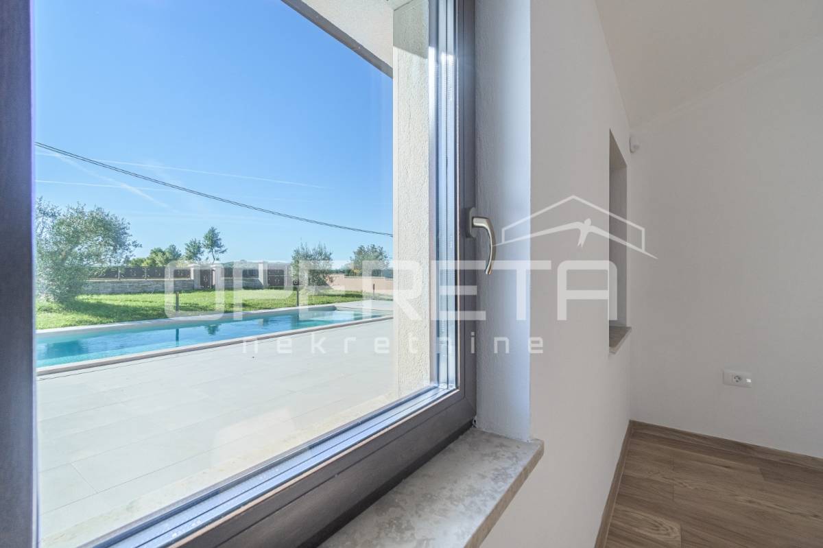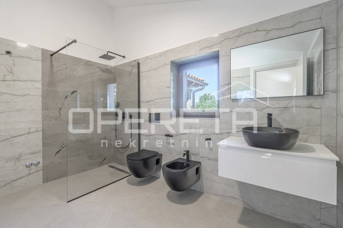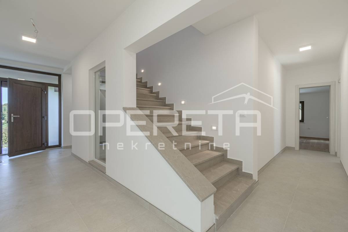 Prvi kat obuhvaća ulazni prostor, tri spavaće sobe, svaka s vlastitom kupaonicom, prostrani dnevni boravak otvorenog plana koji se spaja s kuhinjom i blagovaonicom te izlazi na terasu i bazen, kao i jedno zajedničko kupatilo. Na drugom katu smještena je glavna spavaća soba s privatnom kupaonicom i garderobnim prostorom, koja čini savršeno intimno utočište. Grijanje je riješeno podnim sustavom u svim prostorijama, uz dodatnu udobnost klima uređaja i kamina.