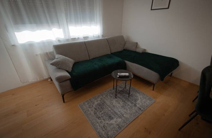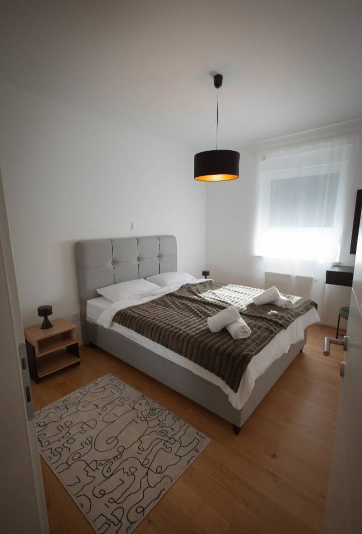 U Osijeku u Donjem Gradu iznajmljuje se moderan dvosobni stan koji se nalazi na drugom katu u stambenoj zgradi sa ukupno četiri kata stambene površine 55 m2.