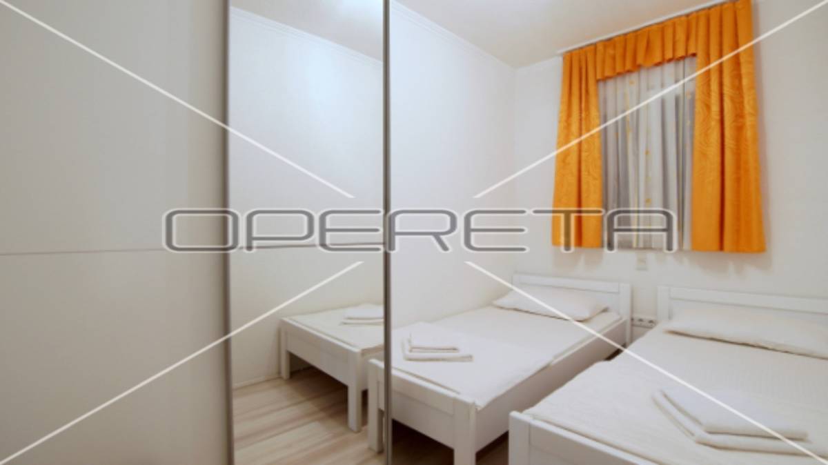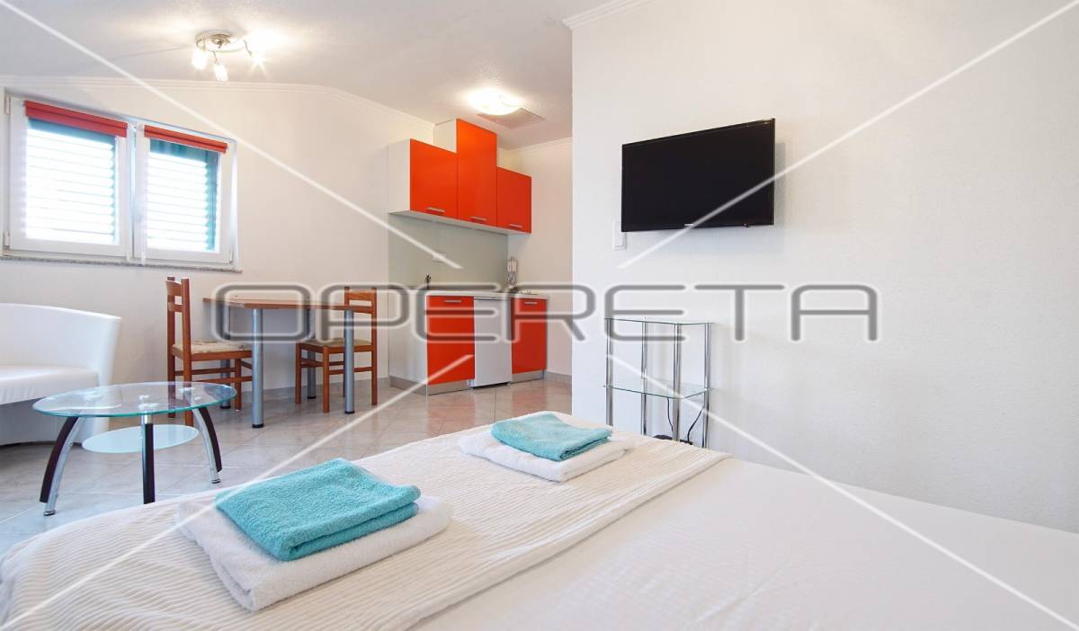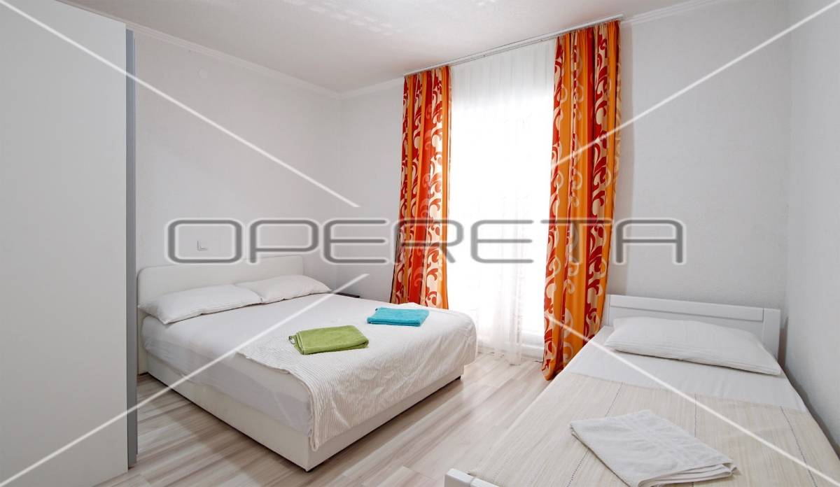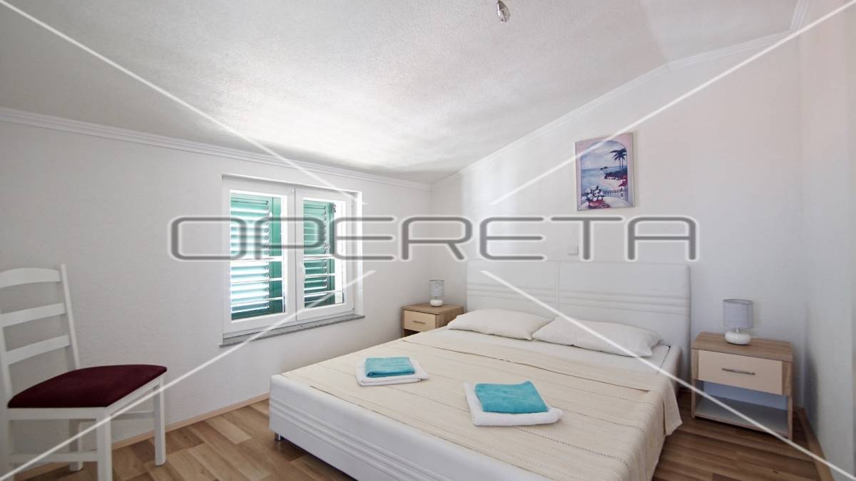 Zgrada s 8 odvojenih apartmana, okućnicom i parkingom smještena je stotinjak metara do mora, u mirnoj obiteljskoj ulici.