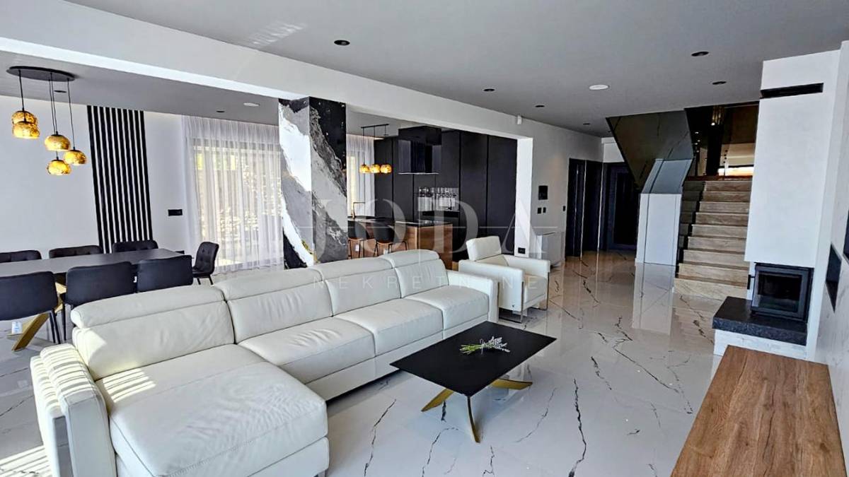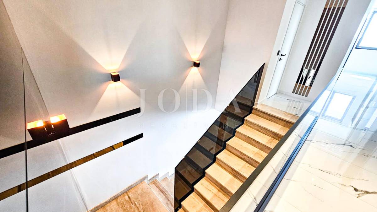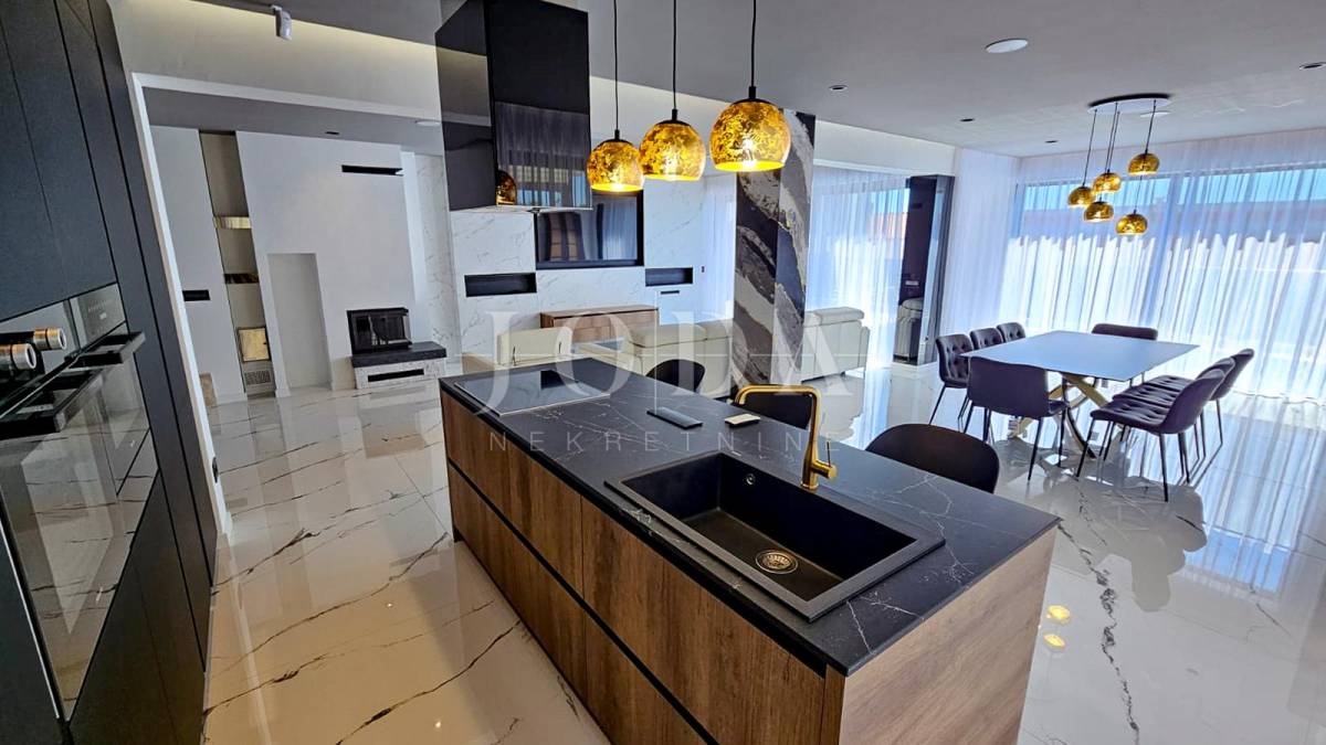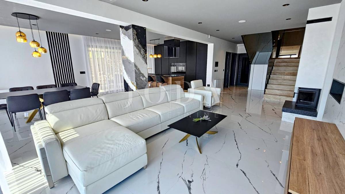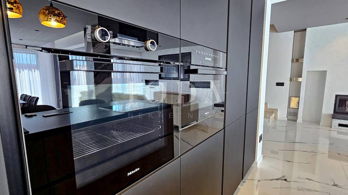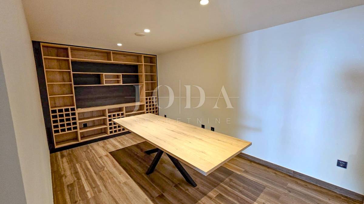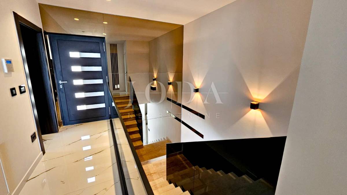 Kuća je odlično projektirana i funkcionalno raspoređena: ima 5 spavaćih soba, svaka sa svojom kupaonicom, radni prostor, wellness zonu, vinski podrum te prostrani dnevni boravak i kuhinju otvorenog koncepta, koji se otvaranjem kliznih stijena stapaju s vanjskim terasama u jedinstvenu cjelinu.