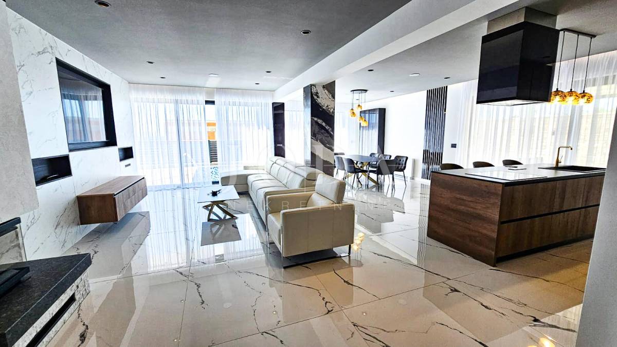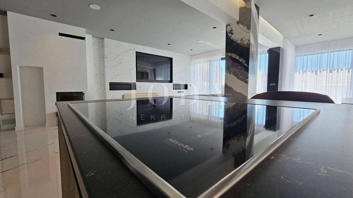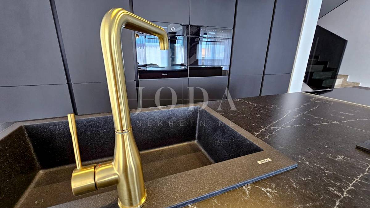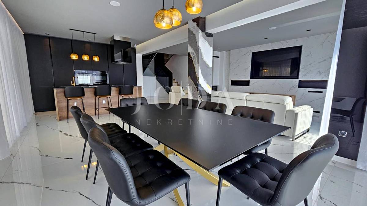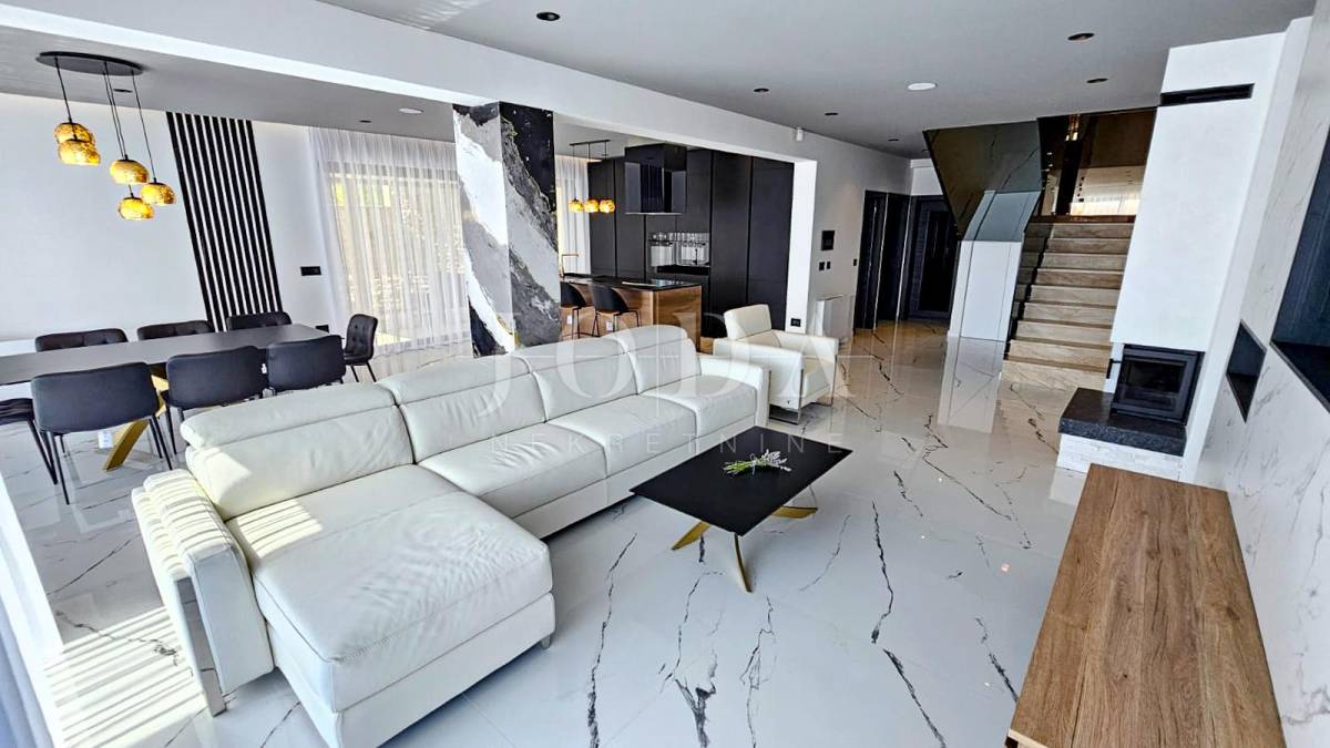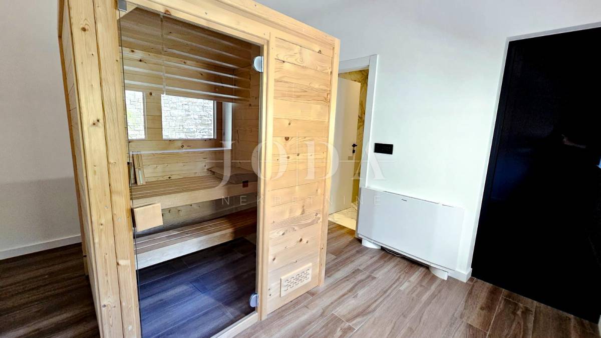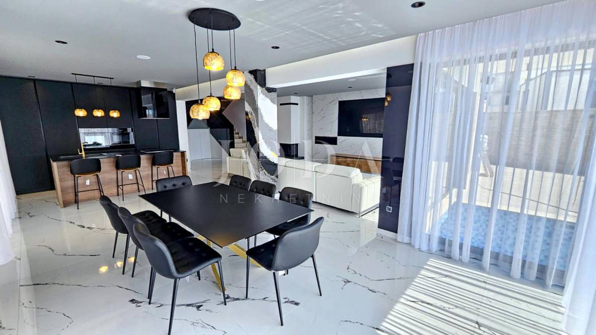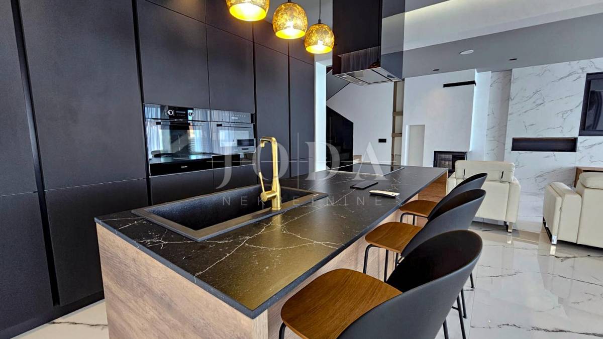 Kuća je odlično projektirana i funkcionalno raspoređena: ima 5 spavaćih soba, svaka sa svojom kupaonicom, radni prostor, wellness zonu, vinski podrum te prostrani dnevni boravak i kuhinju otvorenog koncepta, koji se otvaranjem kliznih stijena stapaju s vanjskim terasama u jedinstvenu cjelinu.