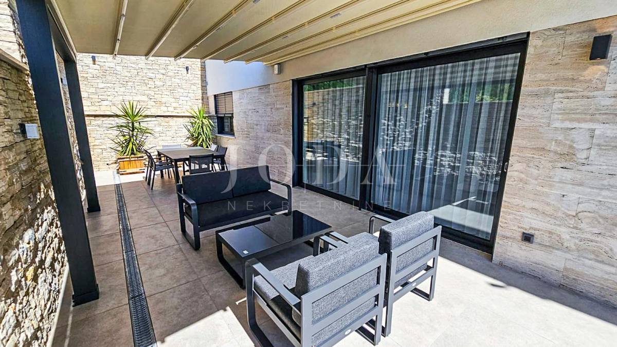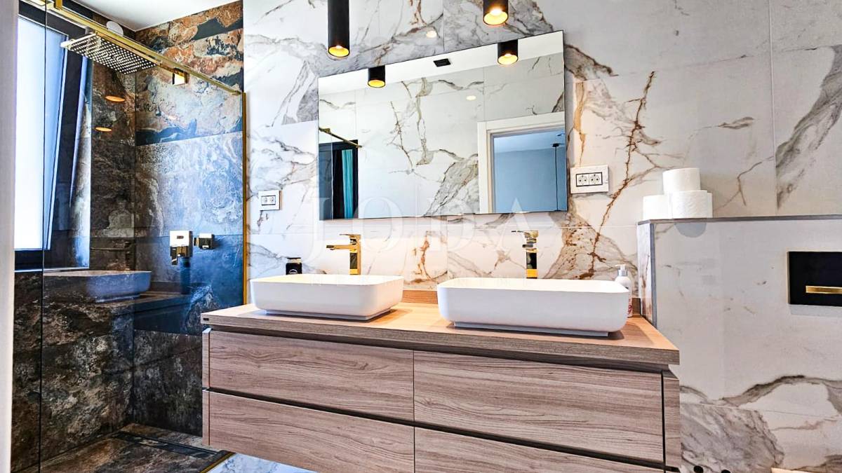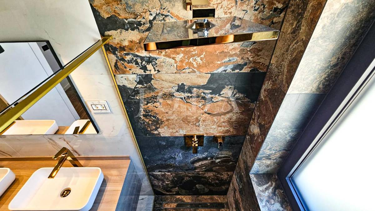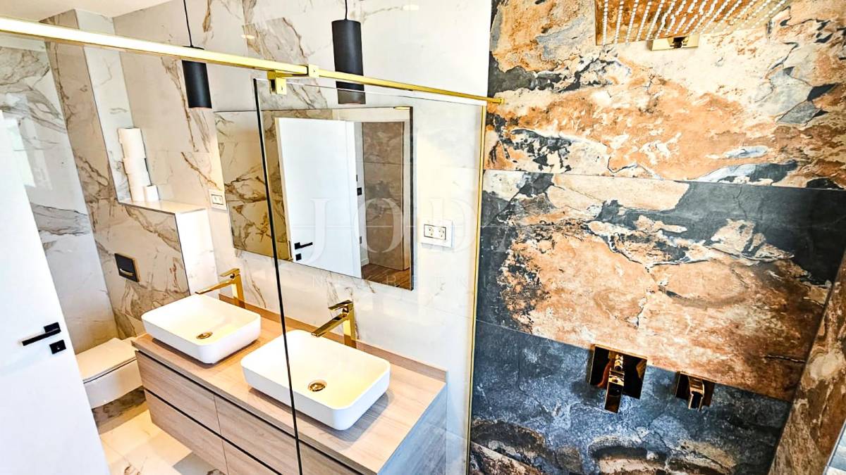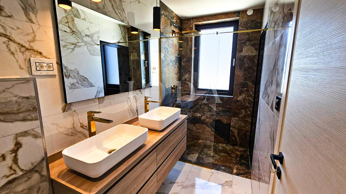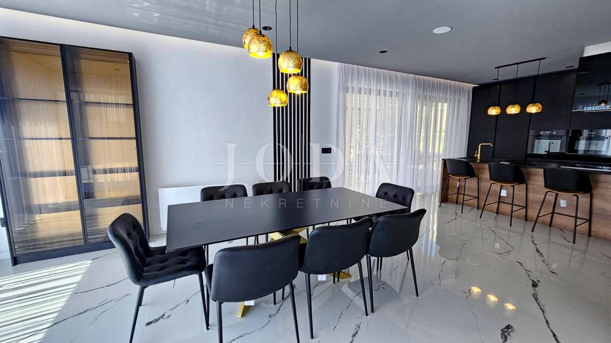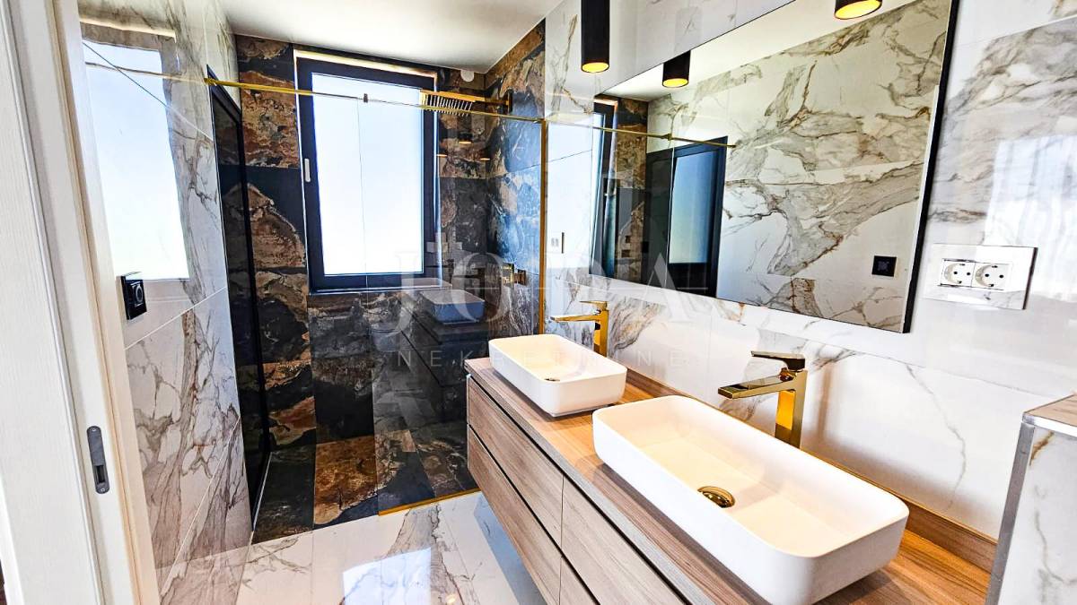 Kuća je odlično projektirana i funkcionalno raspoređena: ima 5 spavaćih soba, svaka sa svojom kupaonicom, radni prostor, wellness zonu, vinski podrum te prostrani dnevni boravak i kuhinju otvorenog koncepta, koji se otvaranjem kliznih stijena stapaju s vanjskim terasama u jedinstvenu cjelinu.