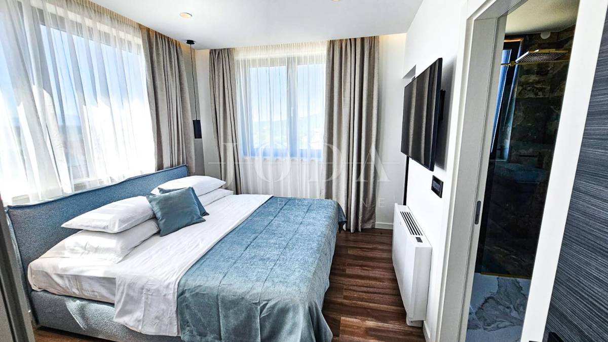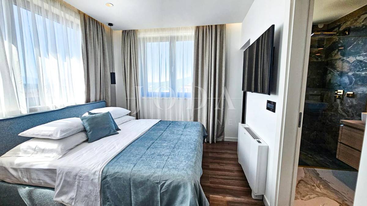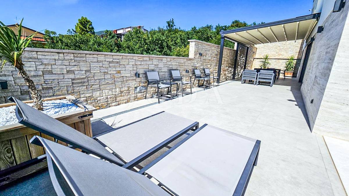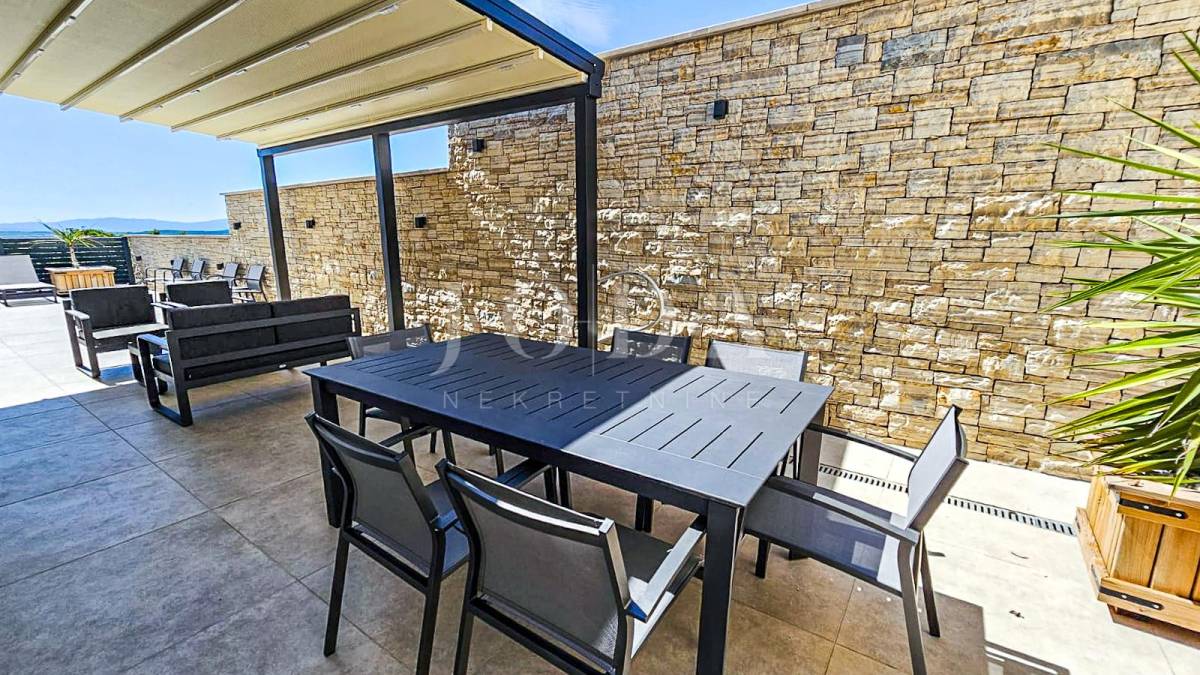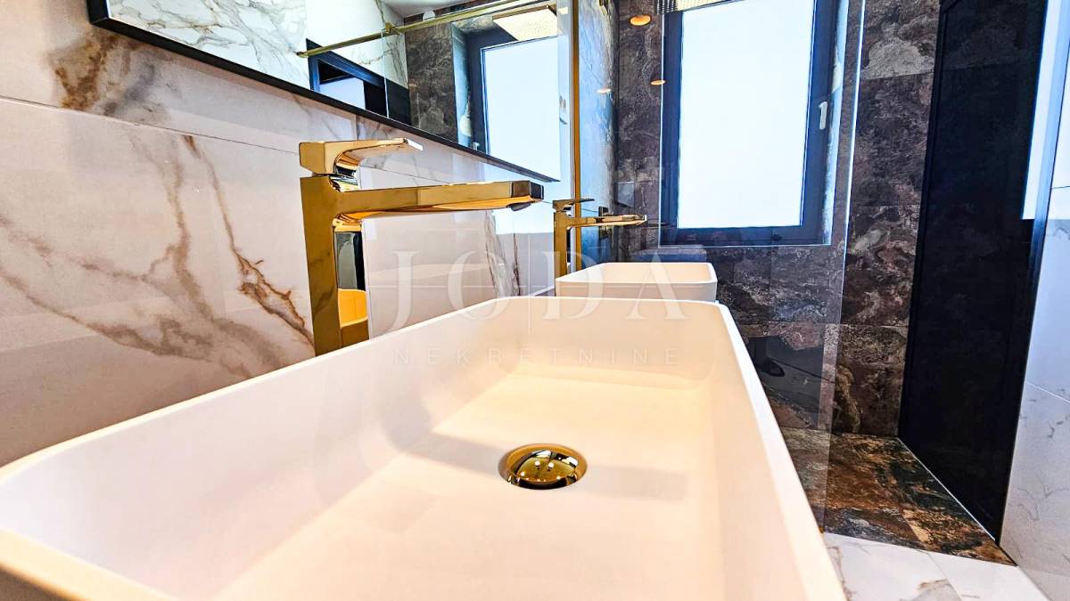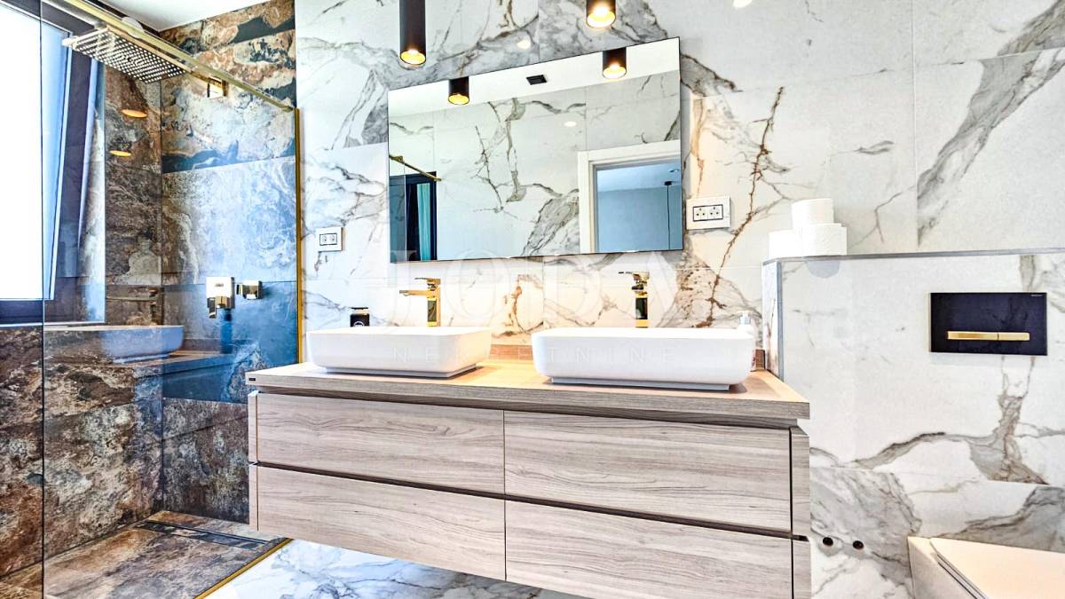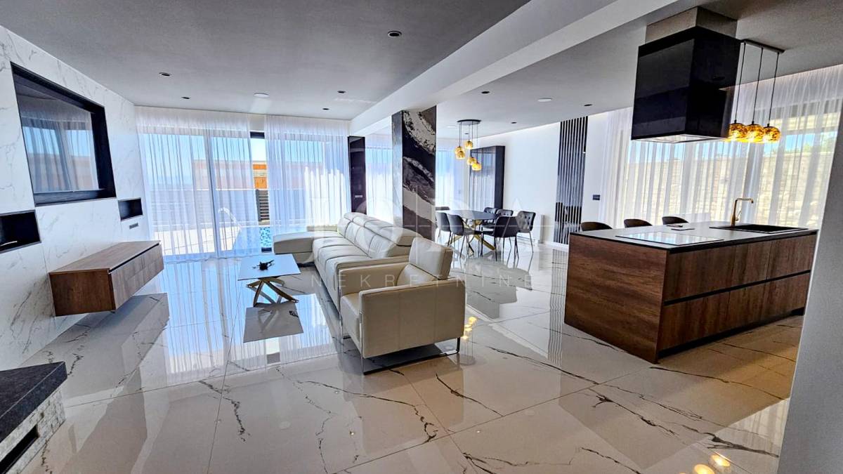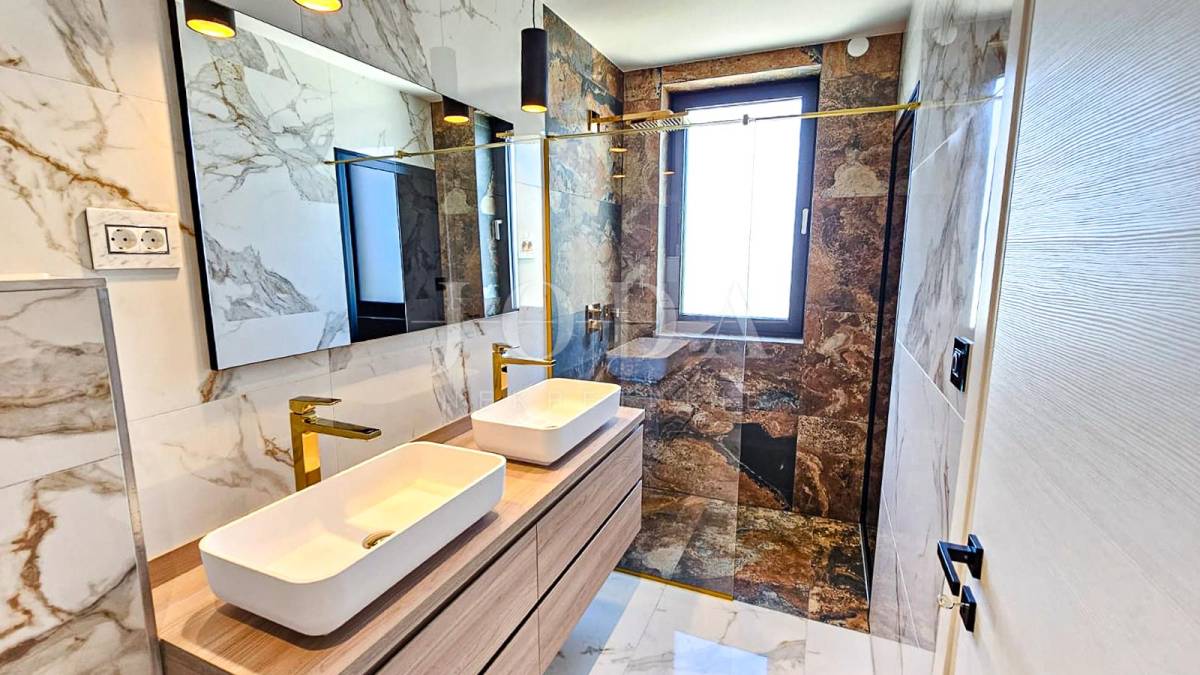 Kuća je odlično projektirana i funkcionalno raspoređena: ima 5 spavaćih soba, svaka sa svojom kupaonicom, radni prostor, wellness zonu, vinski podrum te prostrani dnevni boravak i kuhinju otvorenog koncepta, koji se otvaranjem kliznih stijena stapaju s vanjskim terasama u jedinstvenu cjelinu.