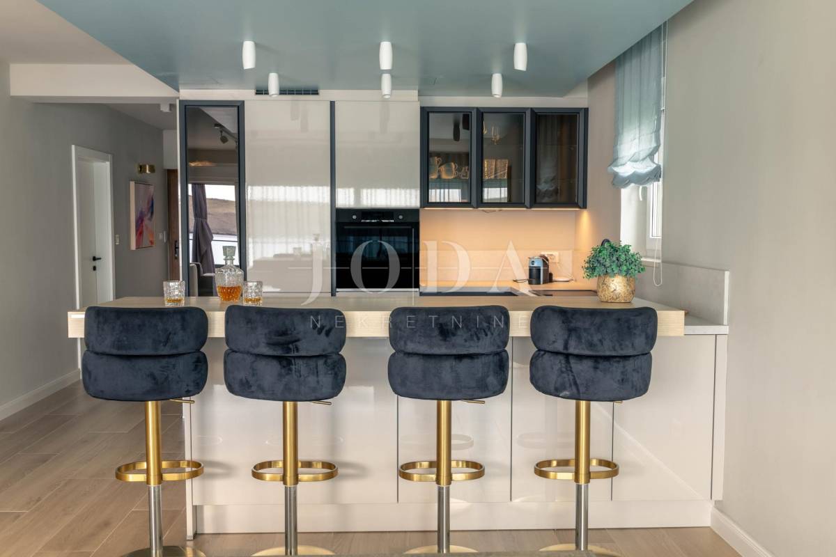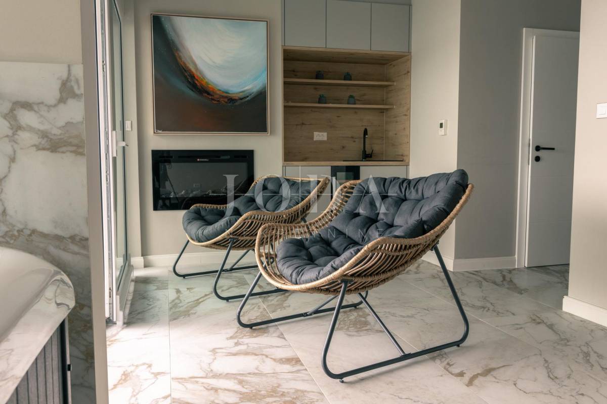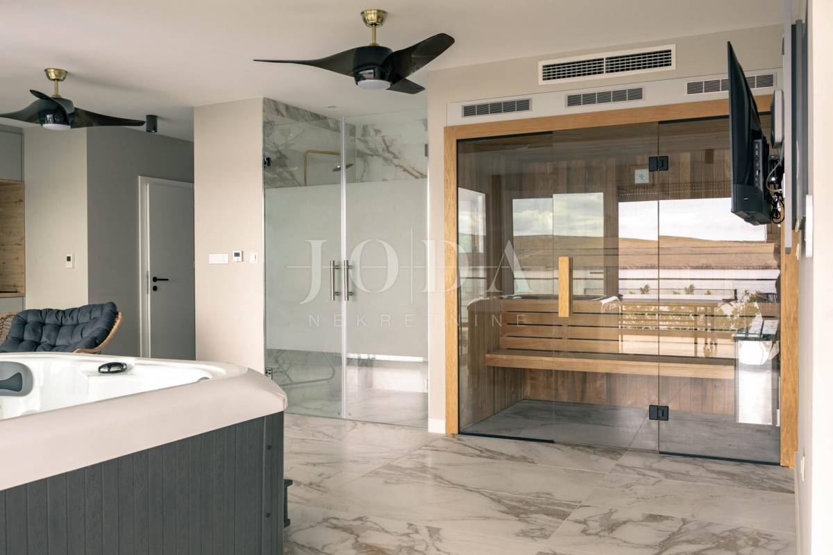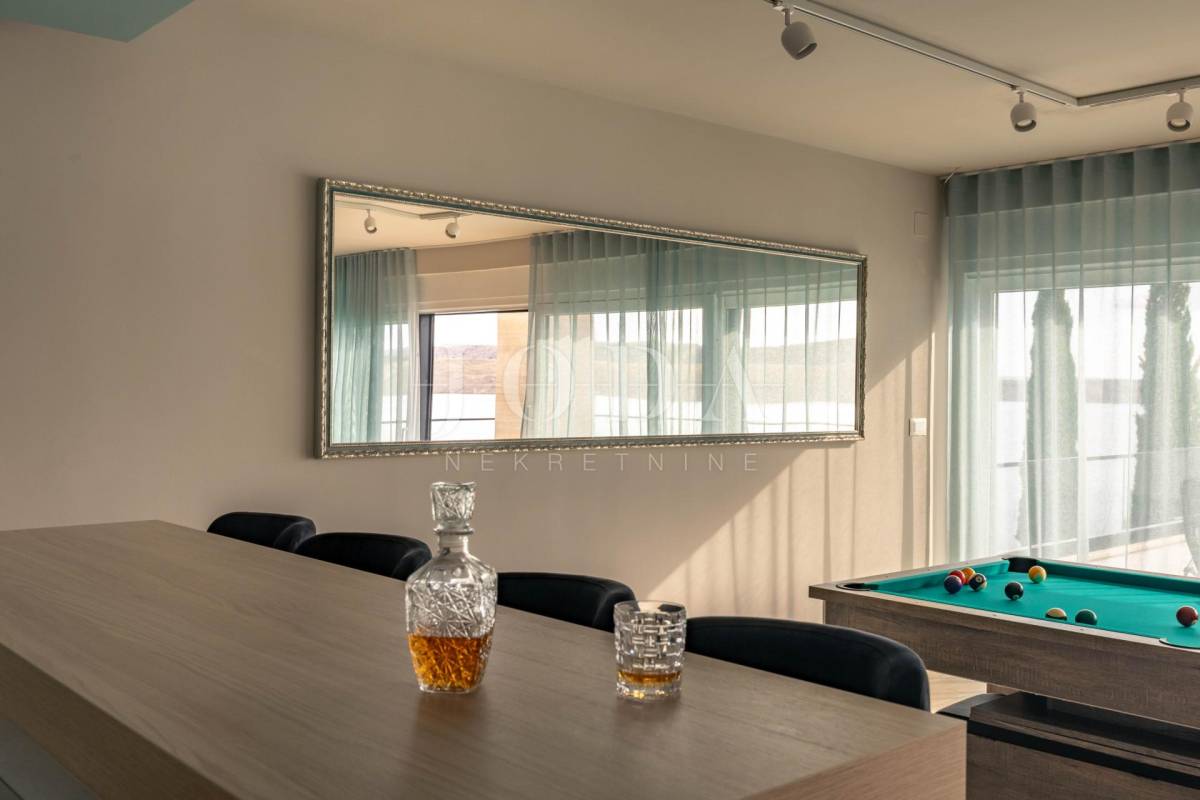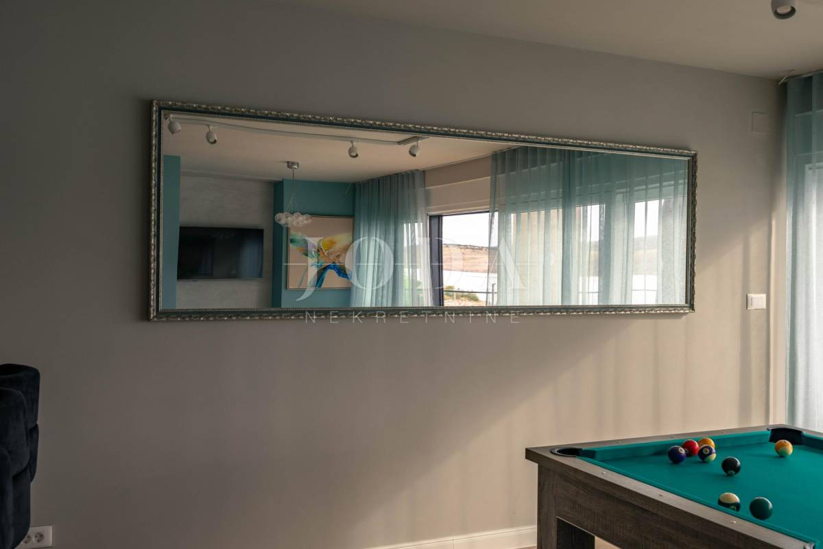 Moderan veliki dnevni boravak s kuhinjom i barom. Zamišljeno kao salon u kojem se nalazi biljar koji se može pretvoriti u blagovaonski stol. Velika terasa s prekrasnim pogledom i kaminom. Kupaona s Wc-om. Hodnik iz kojeg se ulazi u 2 spavaće sobe od kojih jedna ima svoju skrivenu kupaonu s kadom. Povrsina ca. 130 m2