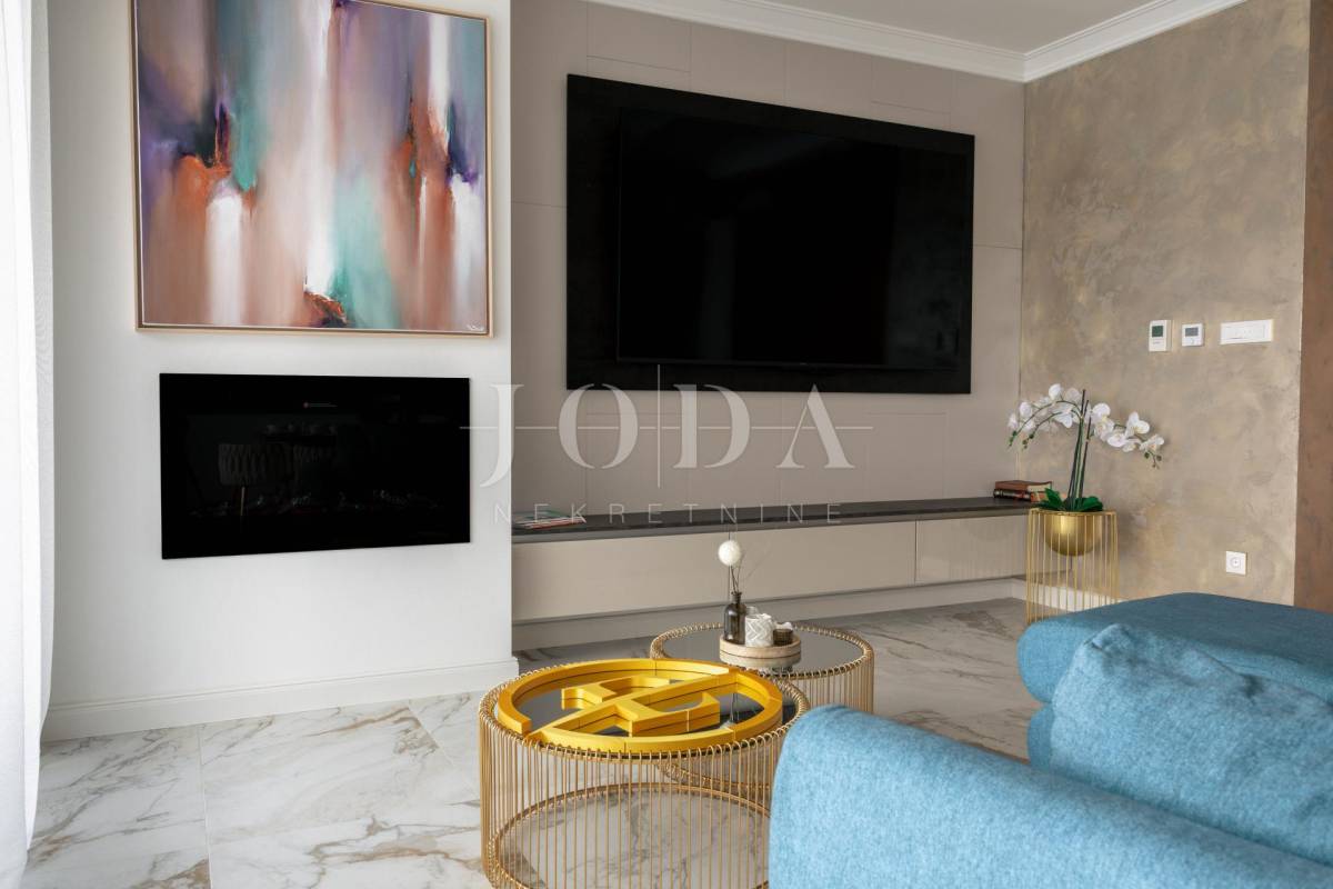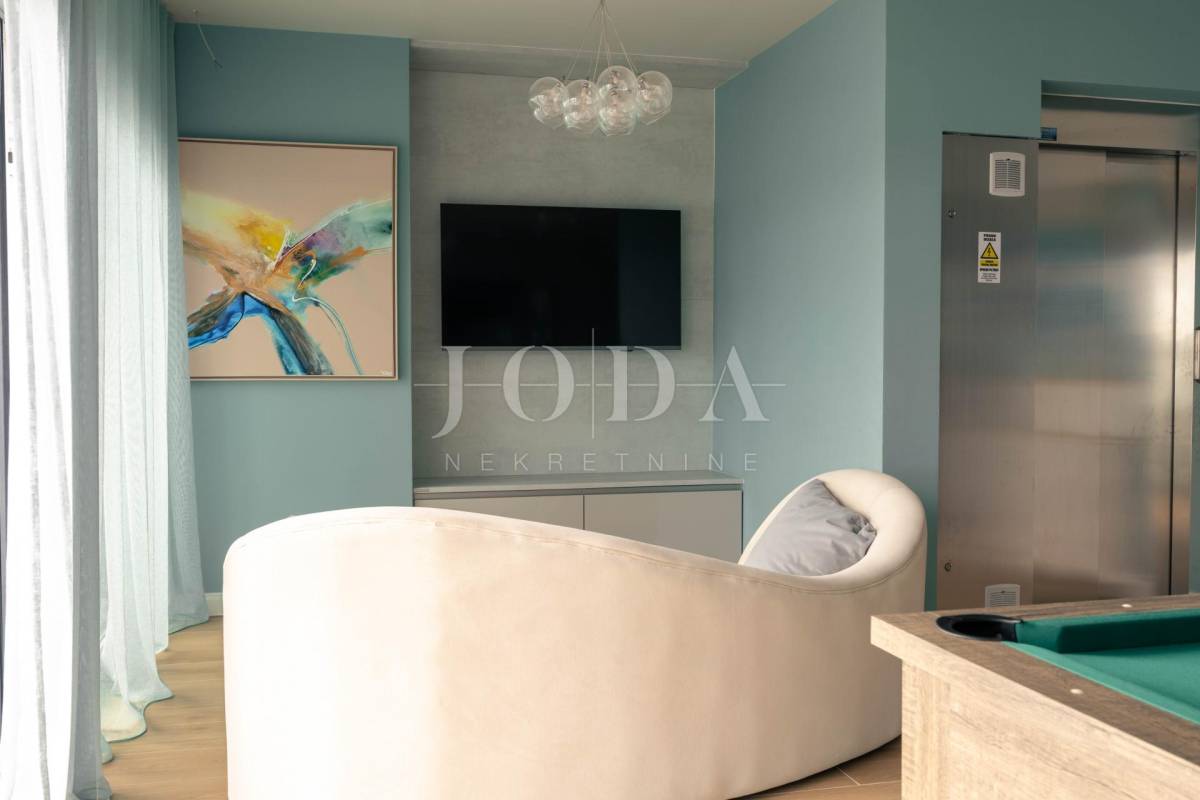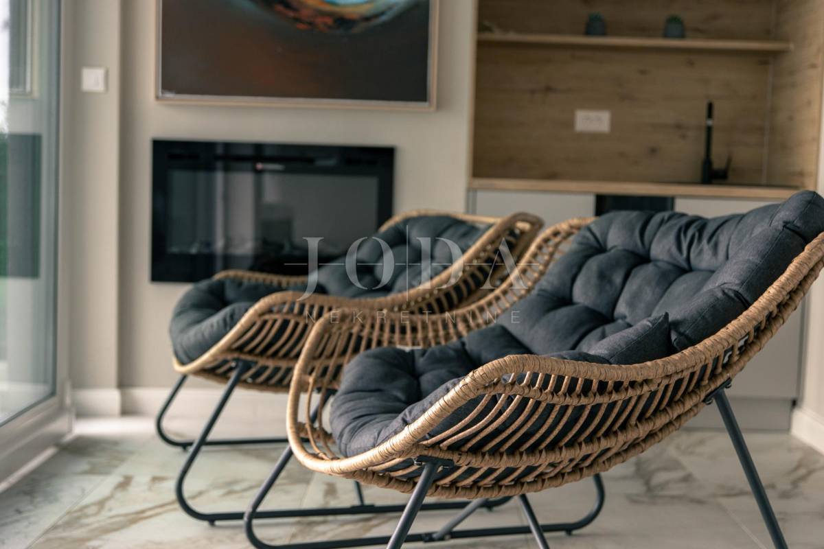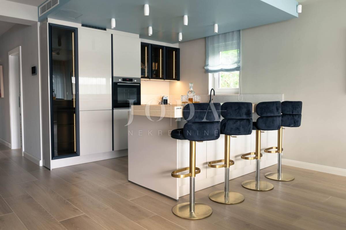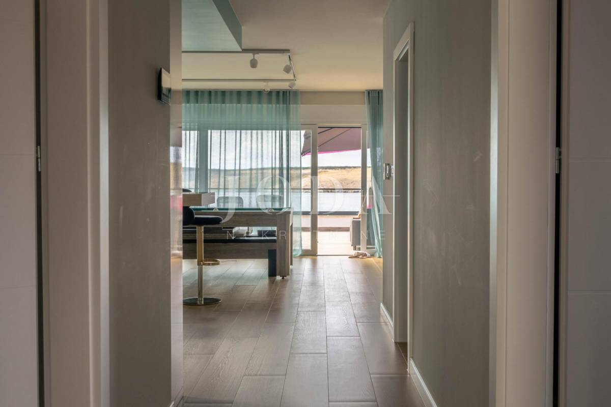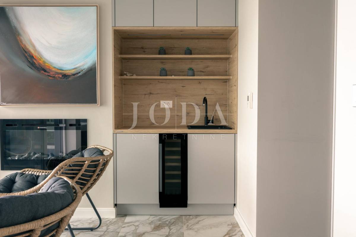 Moderan veliki dnevni boravak s kuhinjom i barom. Zamišljeno kao salon u kojem se nalazi biljar koji se može pretvoriti u blagovaonski stol. Velika terasa s prekrasnim pogledom i kaminom. Kupaona s Wc-om. Hodnik iz kojeg se ulazi u 2 spavaće sobe od kojih jedna ima svoju skrivenu kupaonu s kadom. Povrsina ca. 130 m2