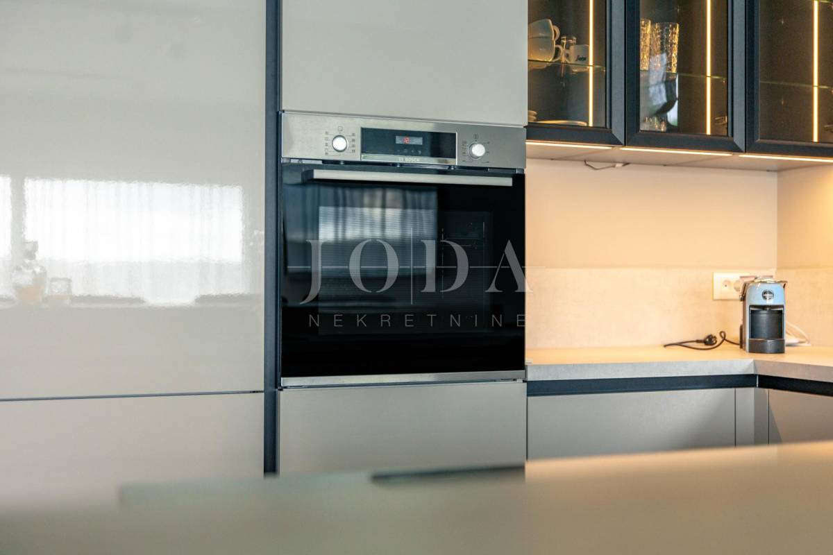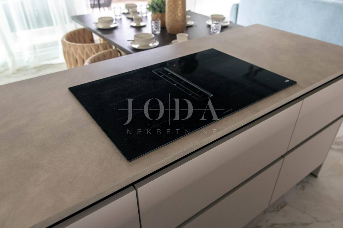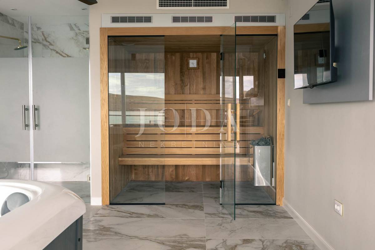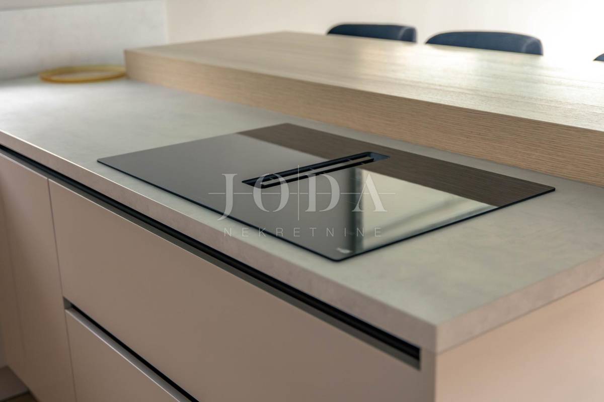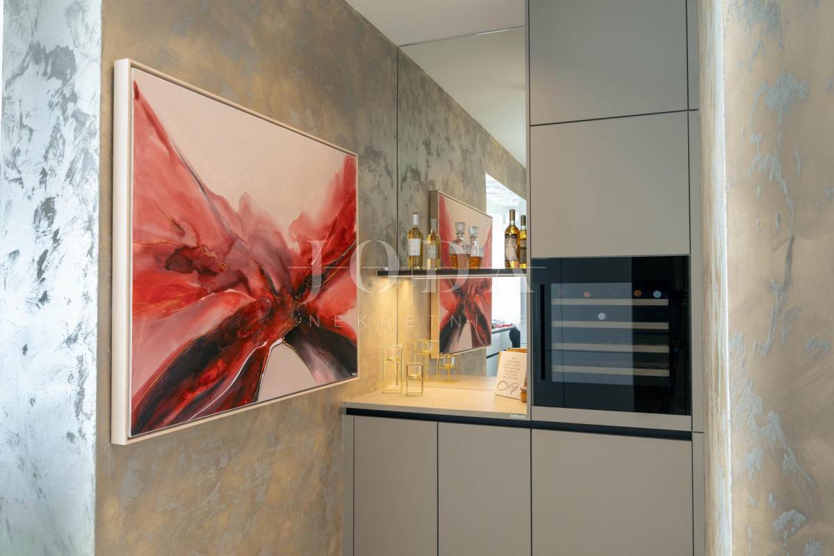 Moderan veliki dnevni boravak s kuhinjom i barom. Zamišljeno kao salon u kojem se nalazi biljar koji se može pretvoriti u blagovaonski stol. Velika terasa s prekrasnim pogledom i kaminom. Kupaona s Wc-om. Hodnik iz kojeg se ulazi u 2 spavaće sobe od kojih jedna ima svoju skrivenu kupaonu s kadom. Povrsina ca. 130 m2
