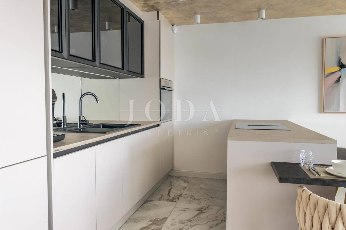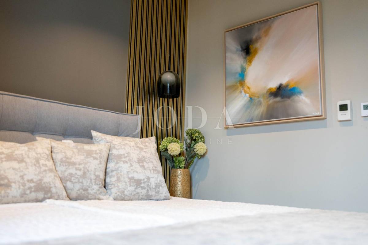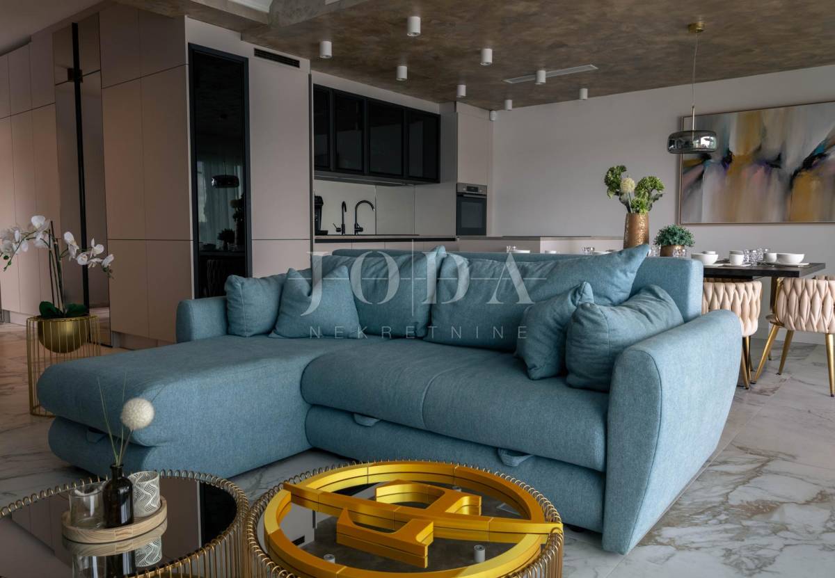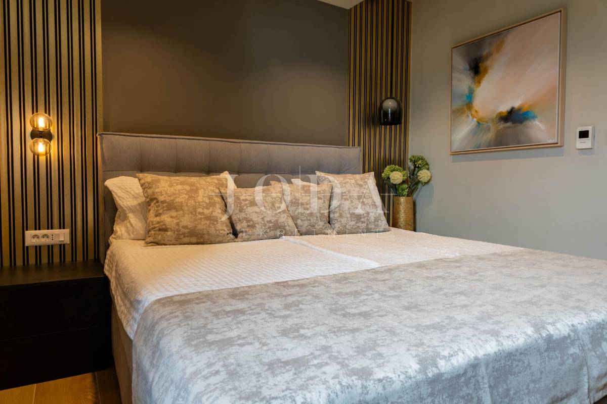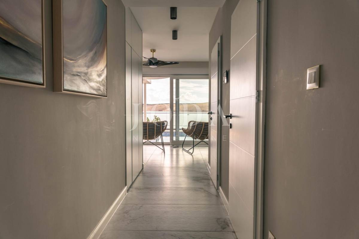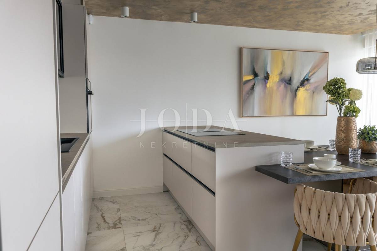 Moderan veliki dnevni boravak s kuhinjom i barom. Zamišljeno kao salon u kojem se nalazi biljar koji se može pretvoriti u blagovaonski stol. Velika terasa s prekrasnim pogledom i kaminom. Kupaona s Wc-om. Hodnik iz kojeg se ulazi u 2 spavaće sobe od kojih jedna ima svoju skrivenu kupaonu s kadom. Povrsina ca. 130 m2