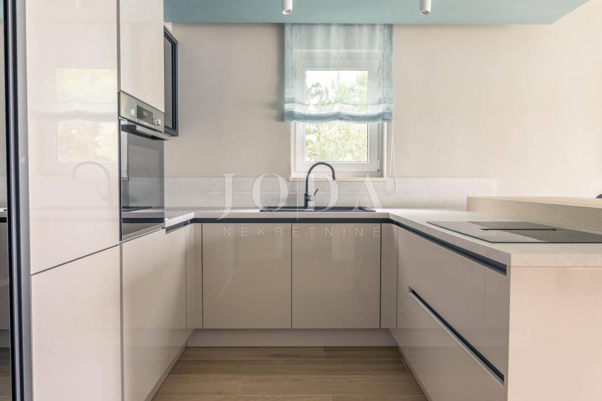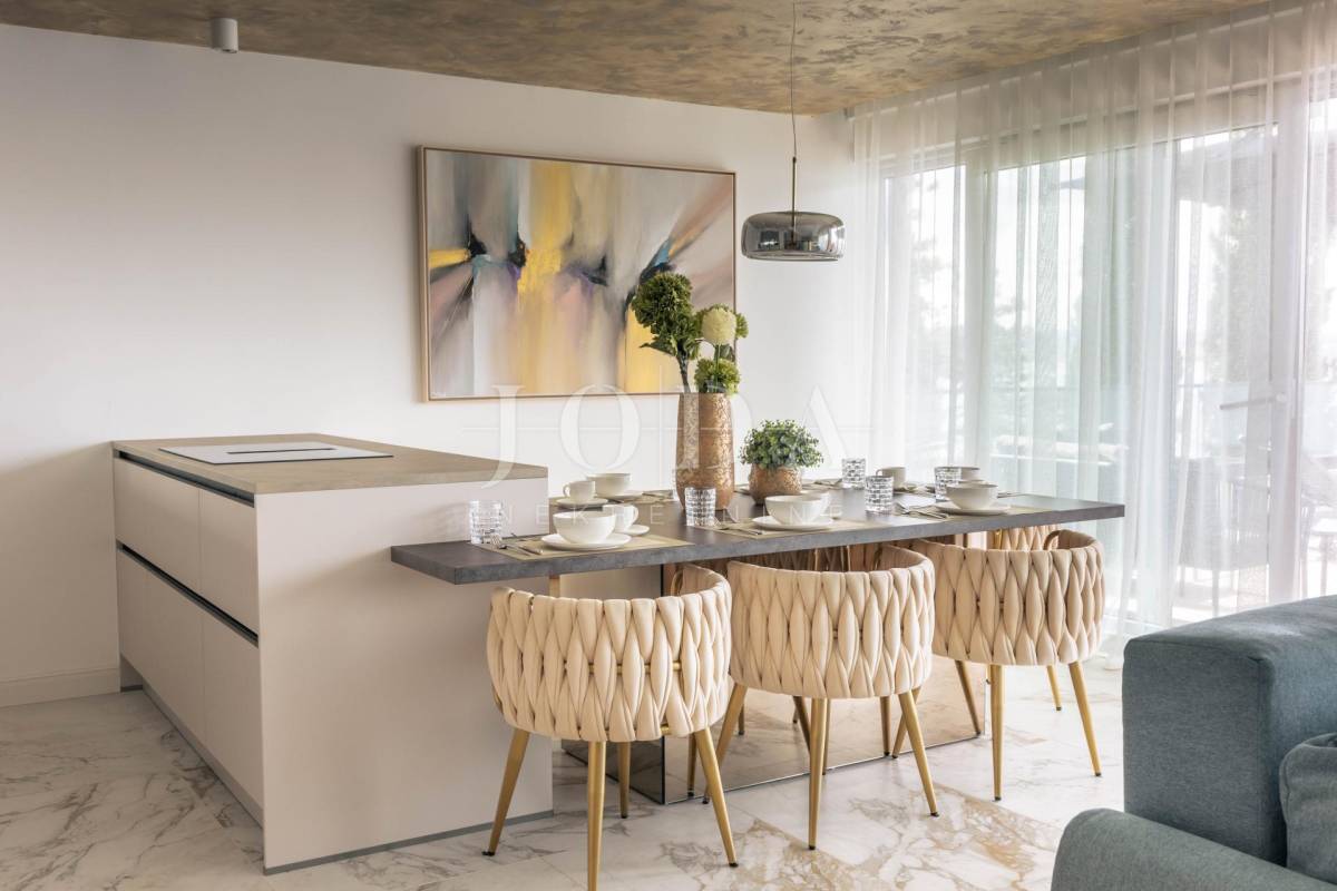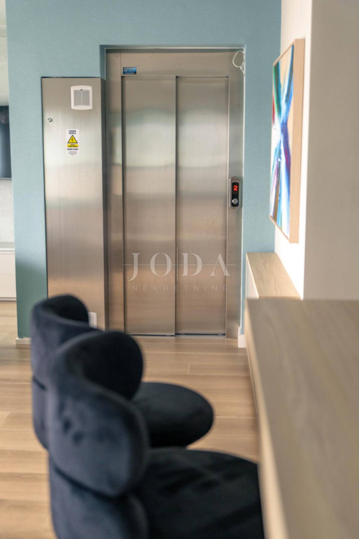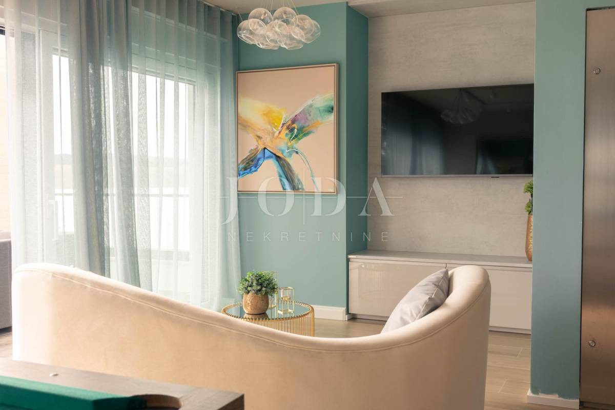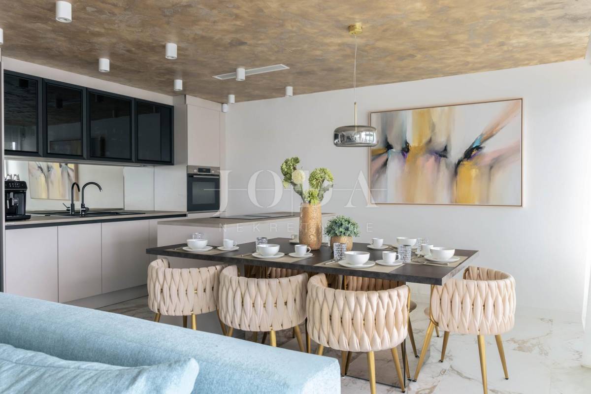 Moderan veliki dnevni boravak s kuhinjom i barom. Zamišljeno kao salon u kojem se nalazi biljar koji se može pretvoriti u blagovaonski stol. Velika terasa s prekrasnim pogledom i kaminom. Kupaona s Wc-om. Hodnik iz kojeg se ulazi u 2 spavaće sobe od kojih jedna ima svoju skrivenu kupaonu s kadom. Povrsina ca. 130 m2