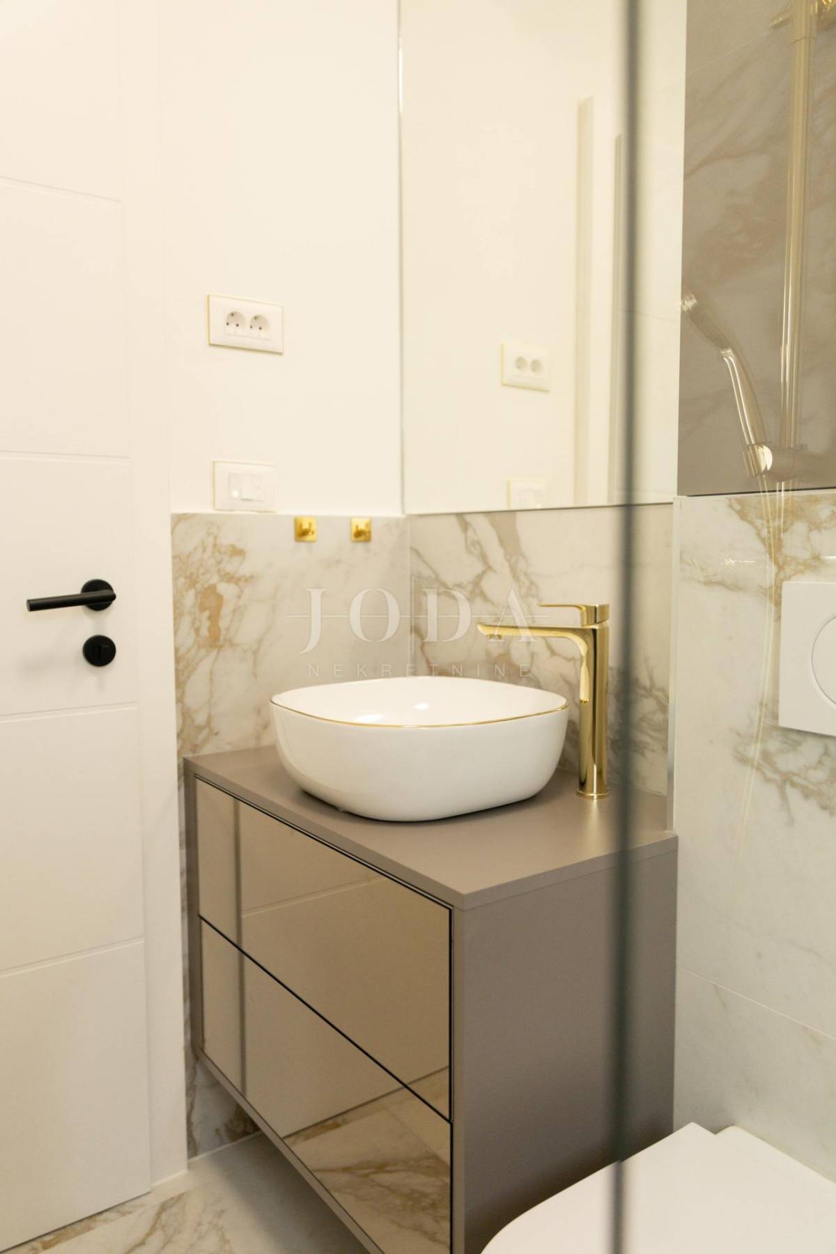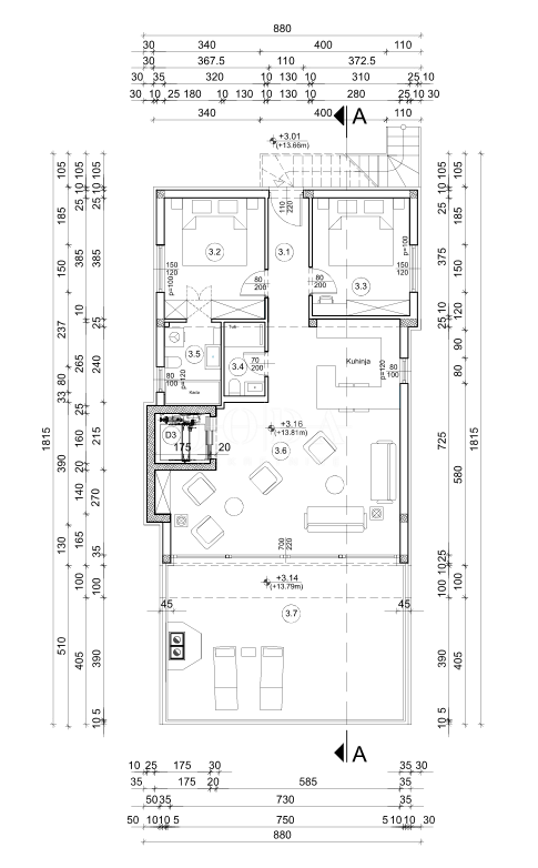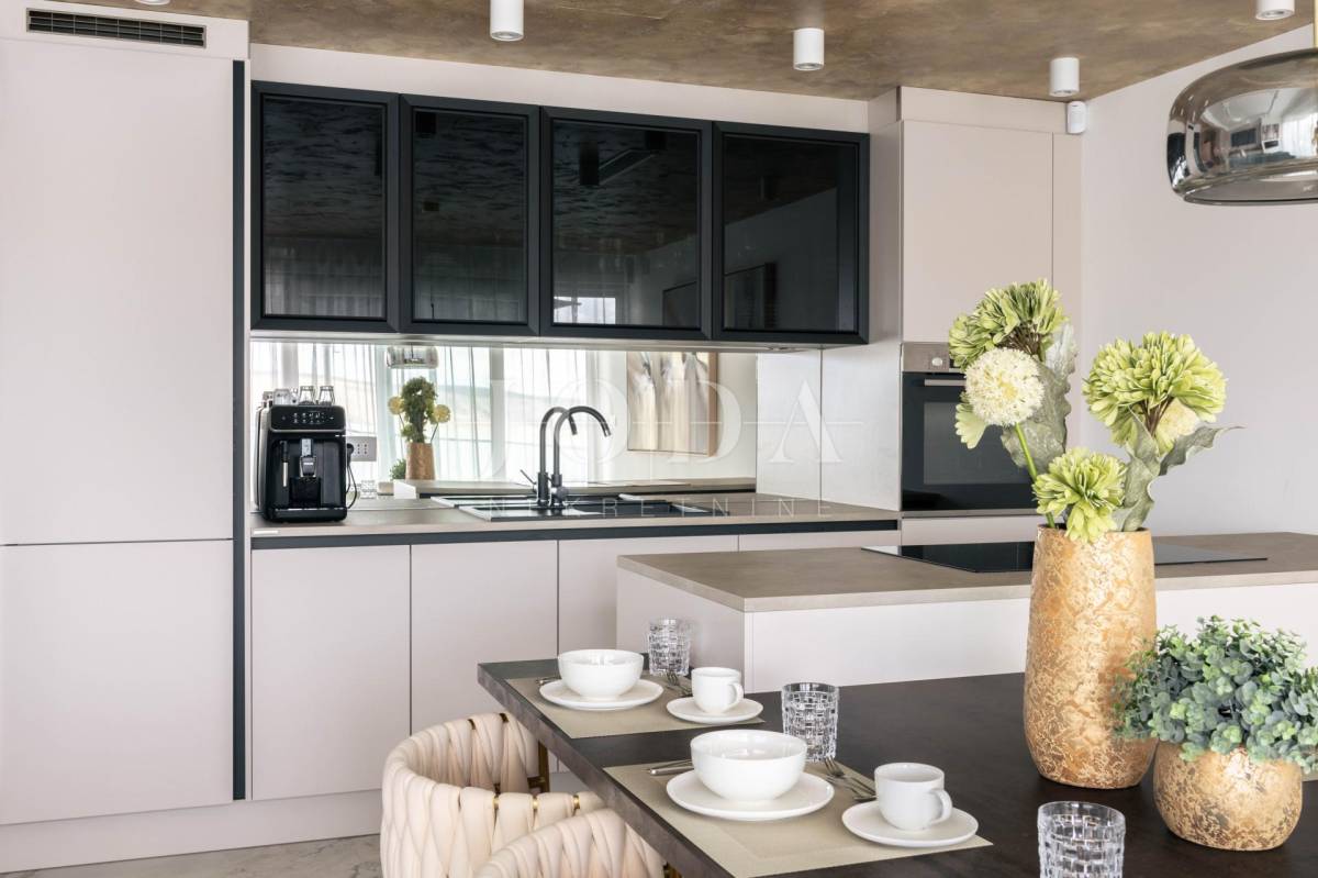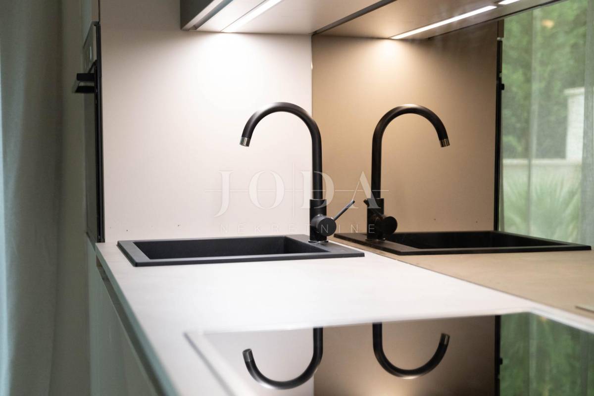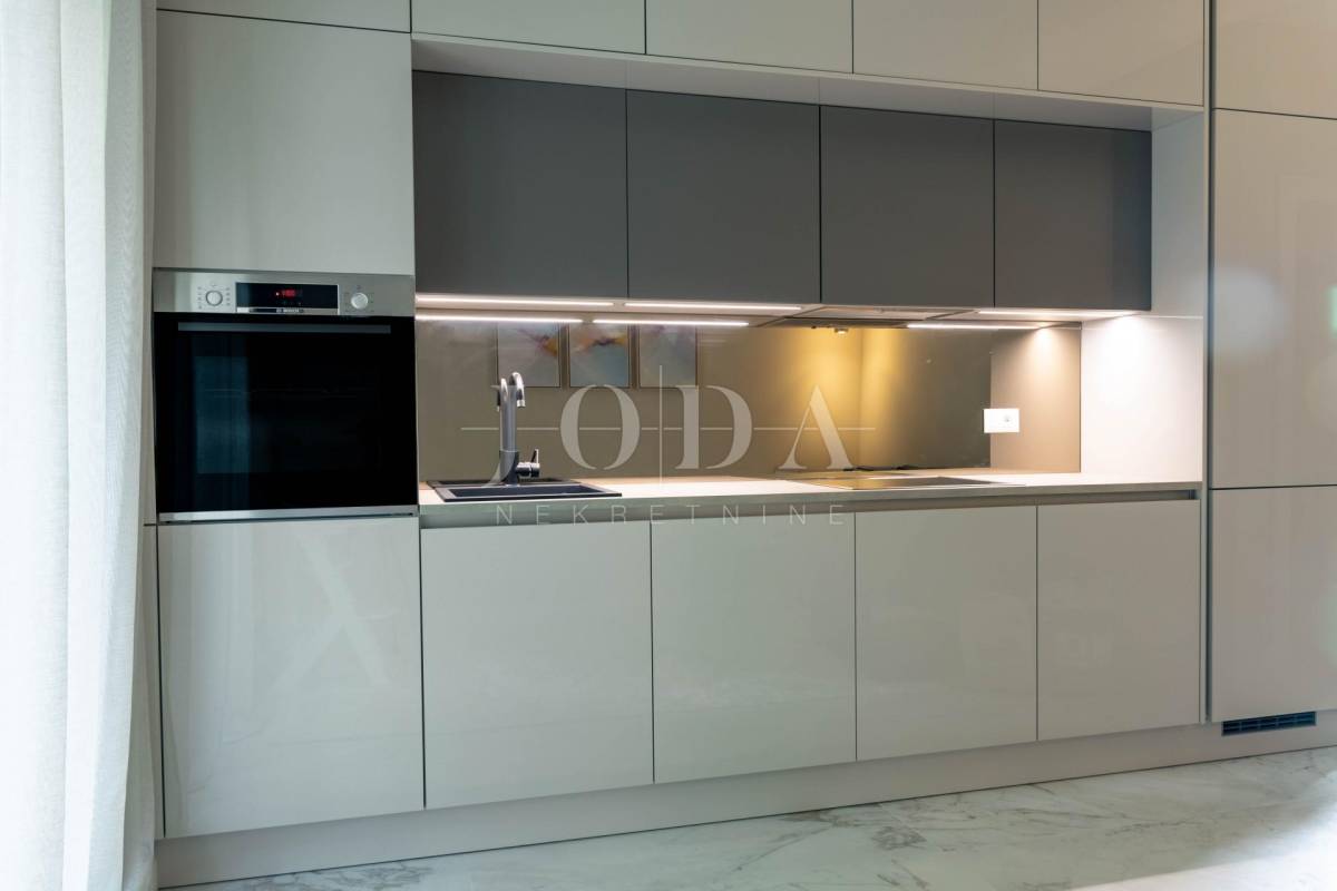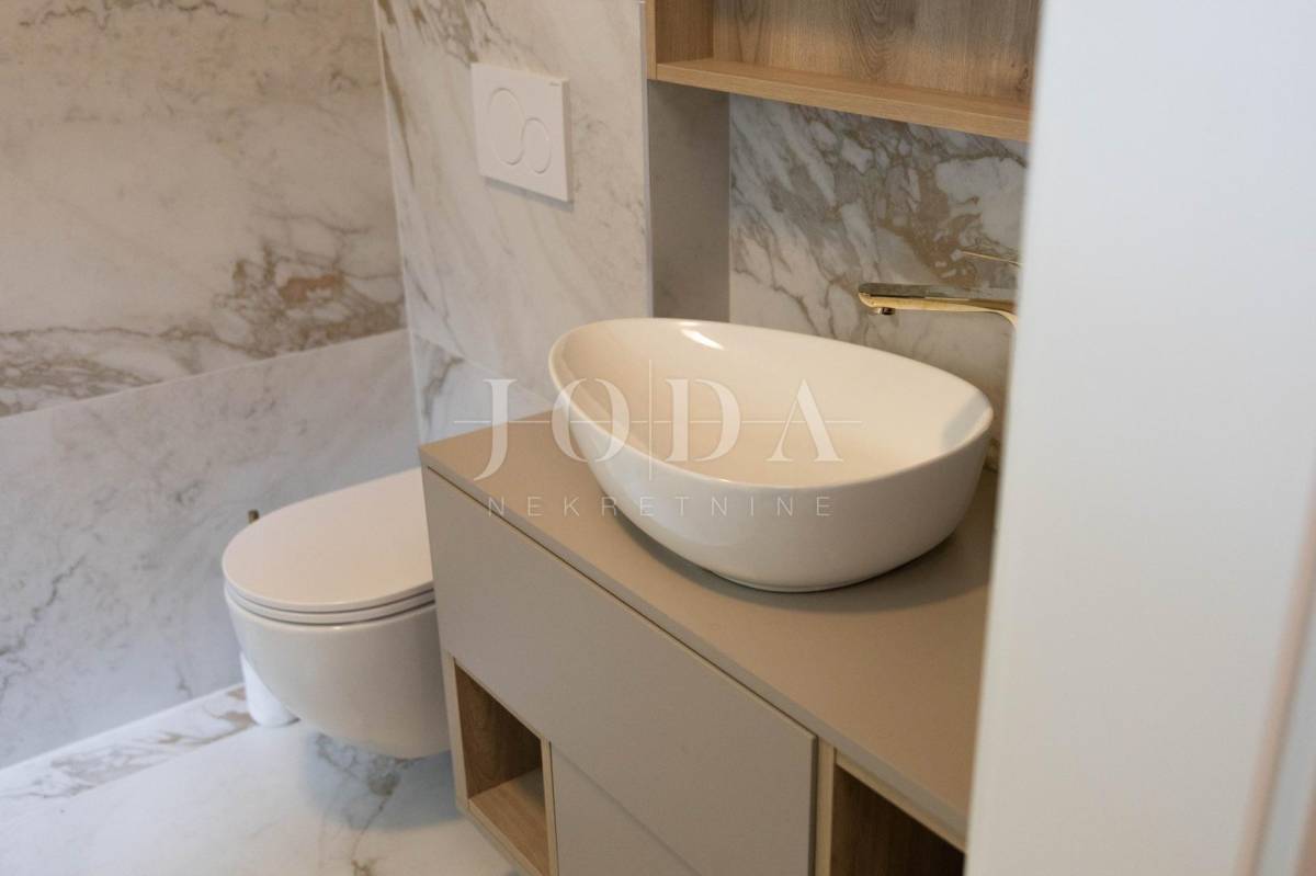 Moderan veliki dnevni boravak s kuhinjom i barom. Zamišljeno kao salon u kojem se nalazi biljar koji se može pretvoriti u blagovaonski stol. Velika terasa s prekrasnim pogledom i kaminom. Kupaona s Wc-om. Hodnik iz kojeg se ulazi u 2 spavaće sobe od kojih jedna ima svoju skrivenu kupaonu s kadom. Povrsina ca. 130 m2