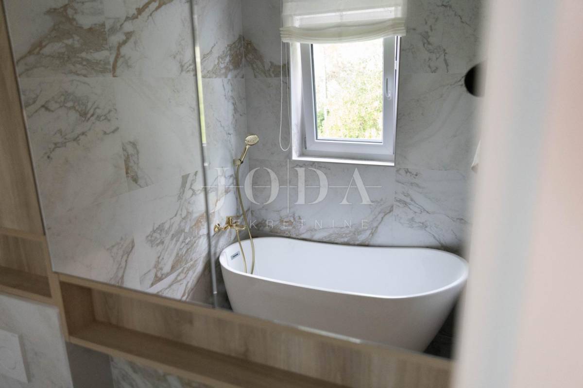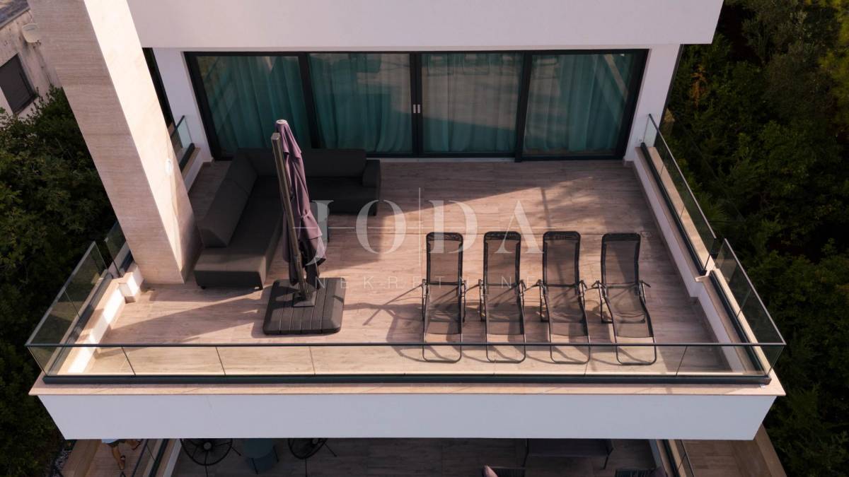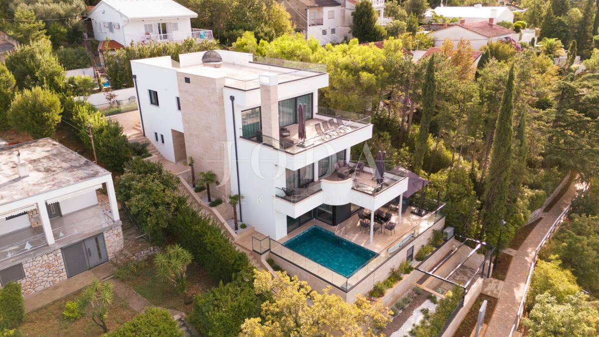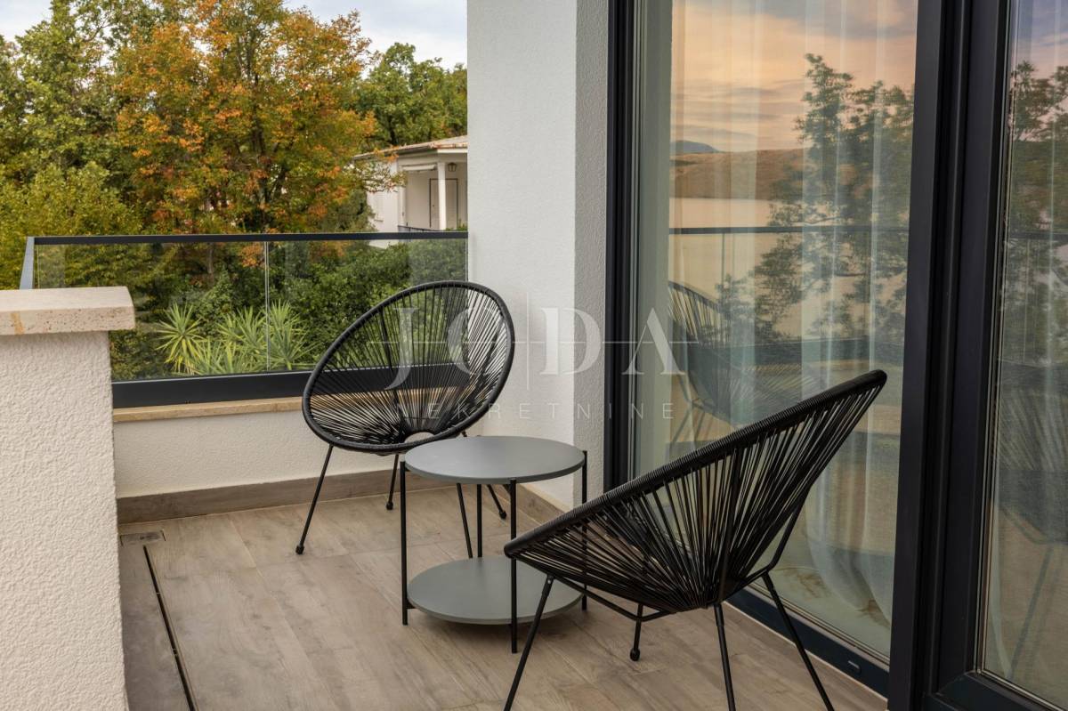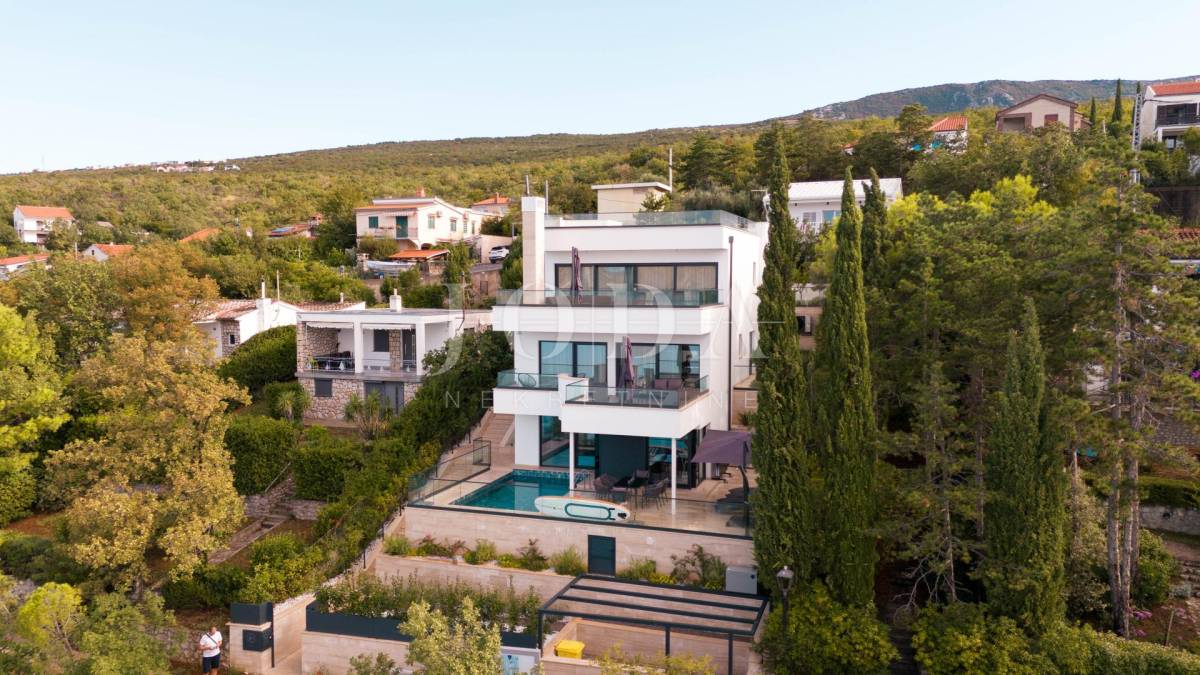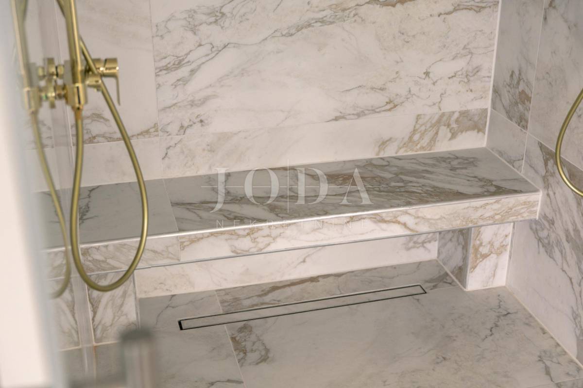 Velika Terasa s koje se pruža pogled na more, otok Krk i krčki most. Ugradbeni ormari sa skrivenim vratima. Iza skrivenih vrata nalazi WC. Druga skrivena vrata vode u spavaću sobu sa svojom kupaonom i kadom, te izlazom na malu terasu s koje se također pruža lijep pogled na more. Sve u zelenilu i miru! Ukupno ca. 80 m2 površine.