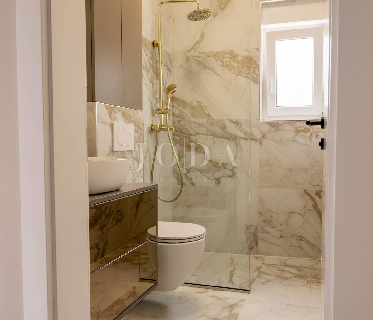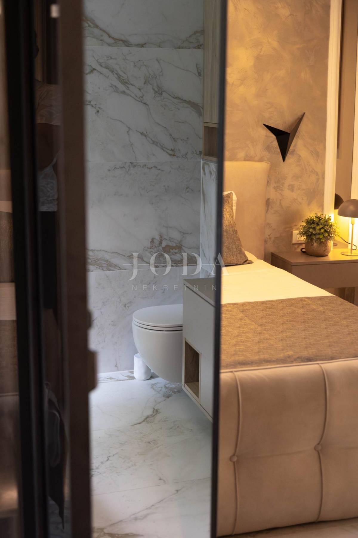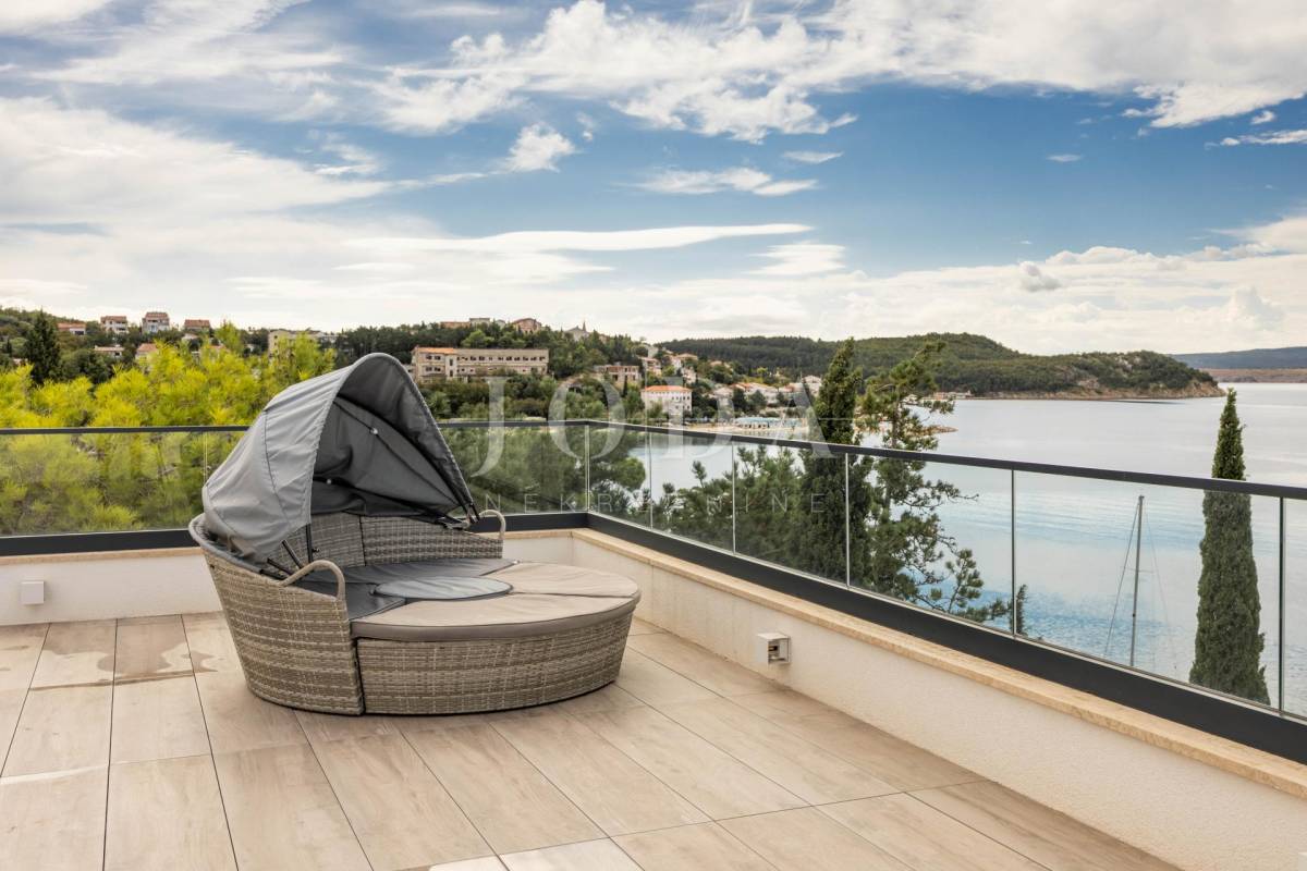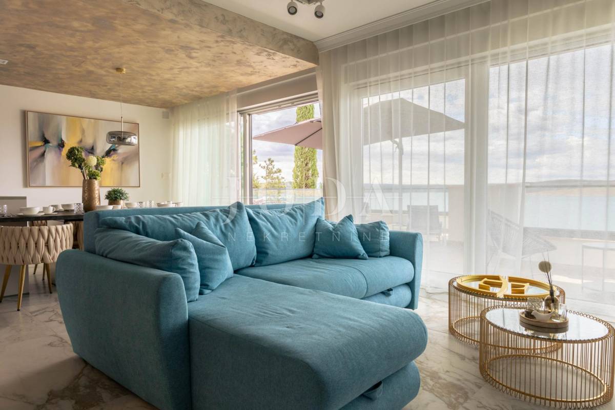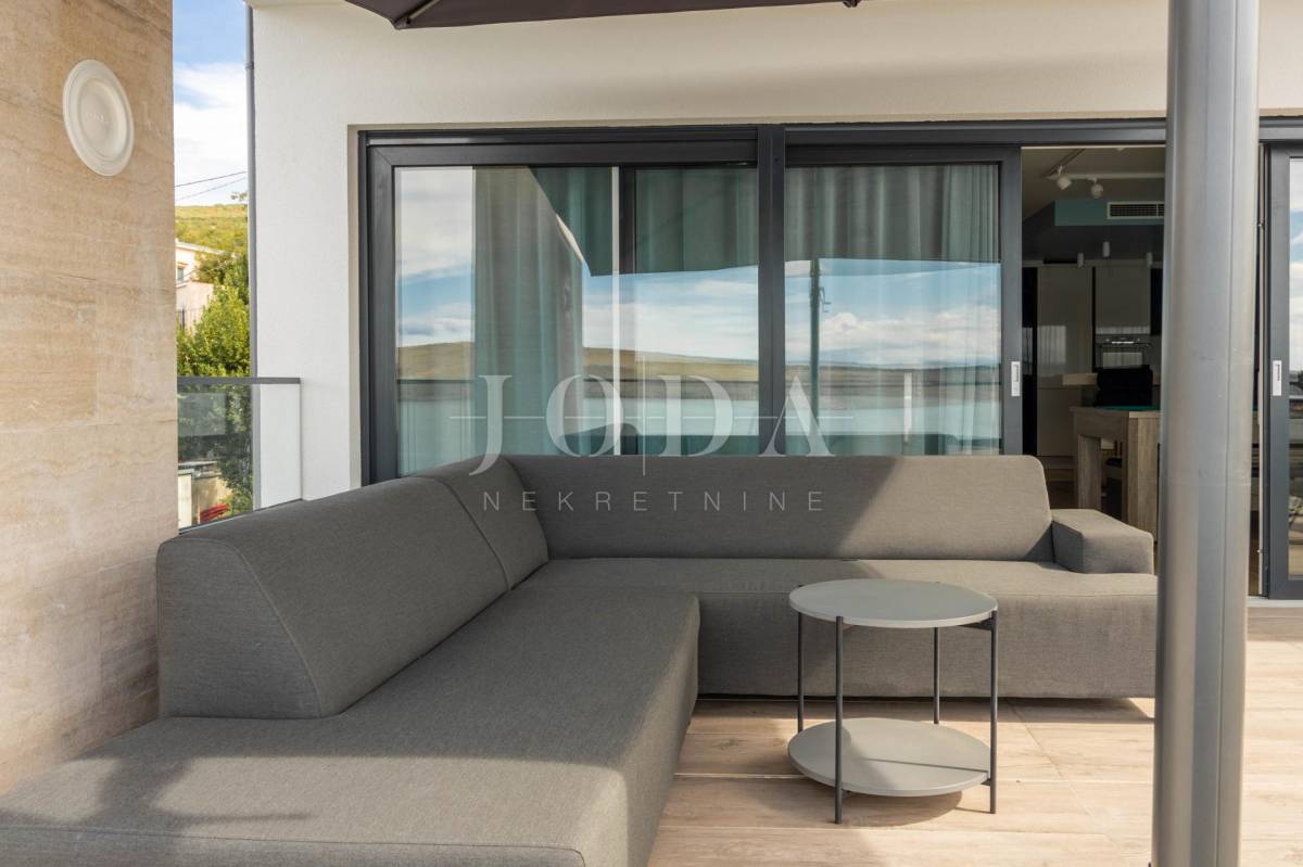 Velika Terasa s koje se pruža pogled na more, otok Krk i krčki most. Ugradbeni ormari sa skrivenim vratima. Iza skrivenih vrata nalazi WC. Druga skrivena vrata vode u spavaću sobu sa svojom kupaonom i kadom, te izlazom na malu terasu s koje se također pruža lijep pogled na more. Sve u zelenilu i miru! Ukupno ca. 80 m2 površine.