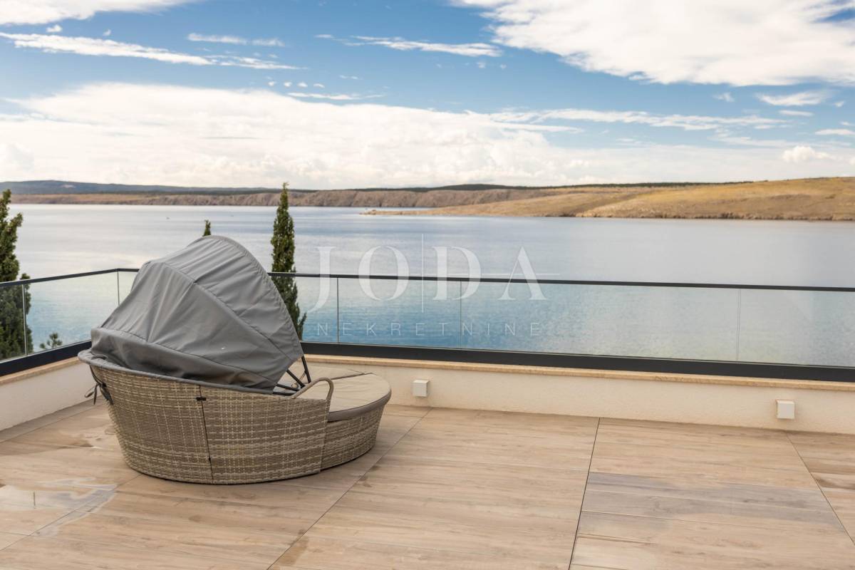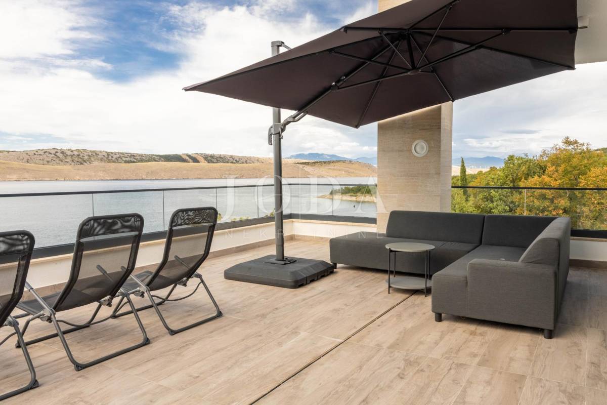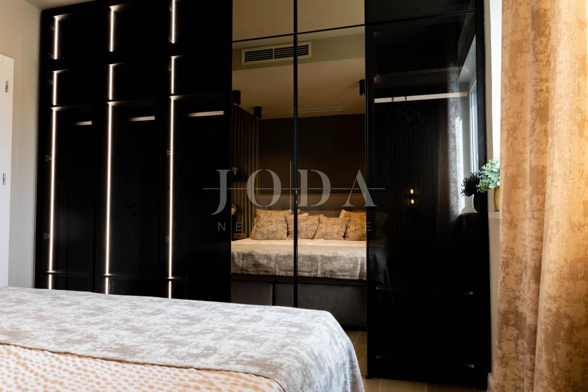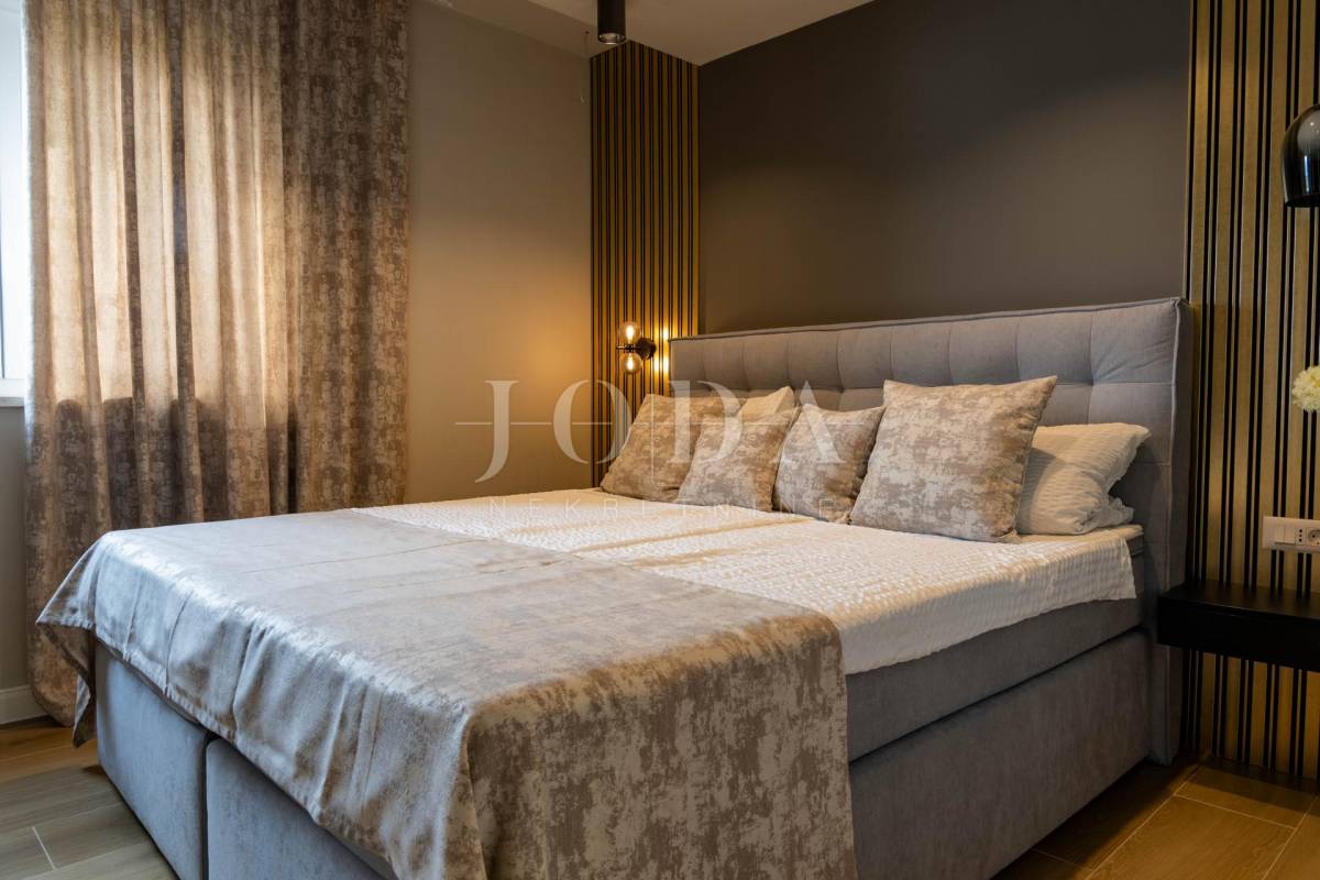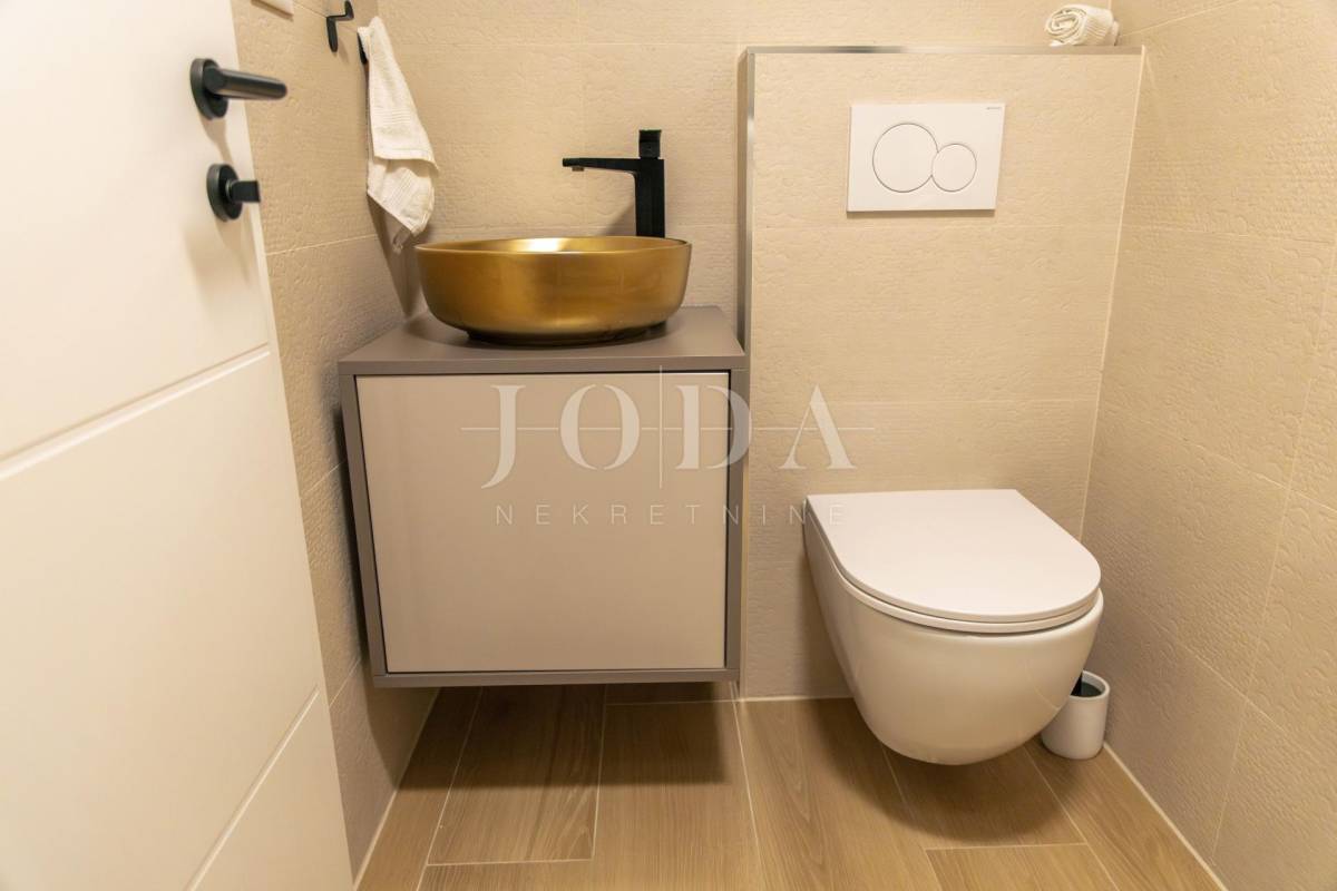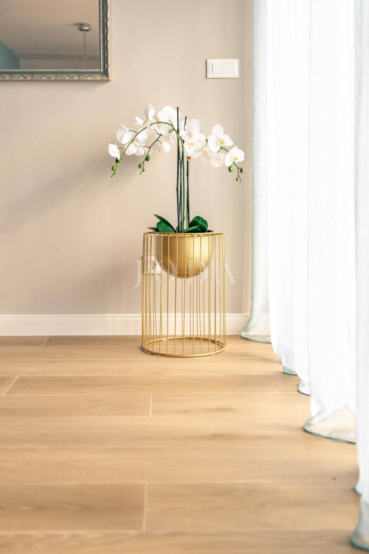 Velika Terasa s koje se pruža pogled na more, otok Krk i krčki most. Ugradbeni ormari sa skrivenim vratima. Iza skrivenih vrata nalazi WC. Druga skrivena vrata vode u spavaću sobu sa svojom kupaonom i kadom, te izlazom na malu terasu s koje se također pruža lijep pogled na more. Sve u zelenilu i miru! Ukupno ca. 80 m2 površine.