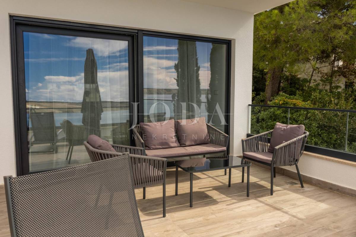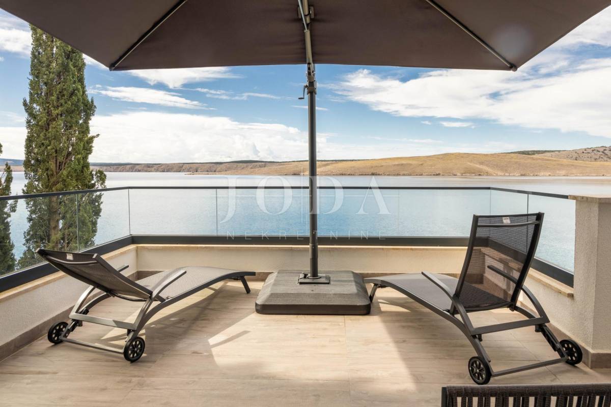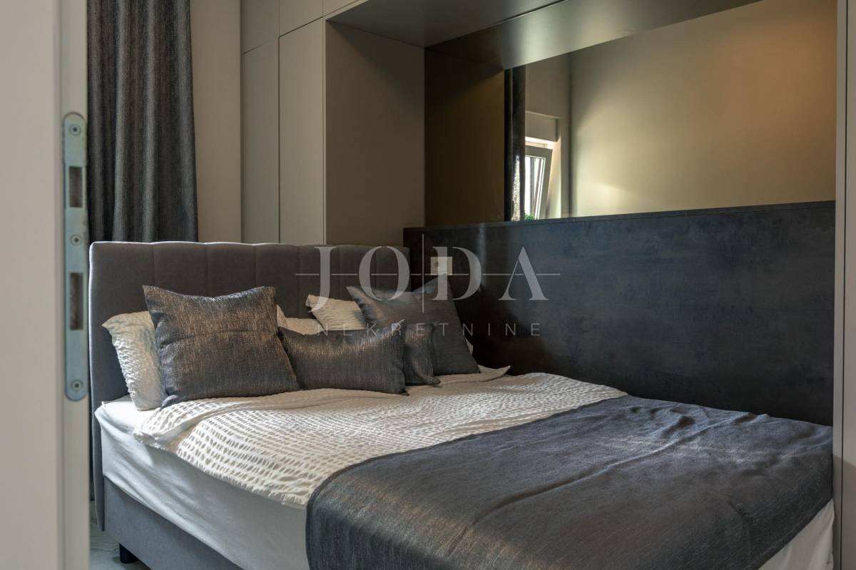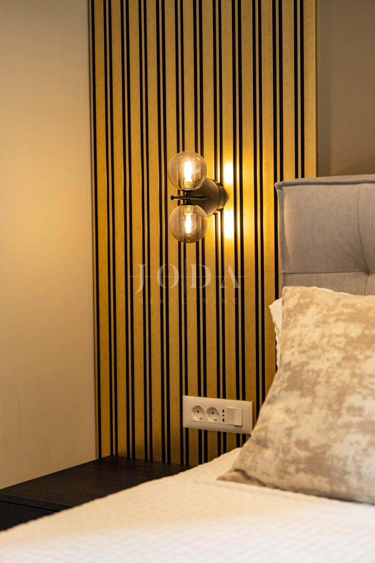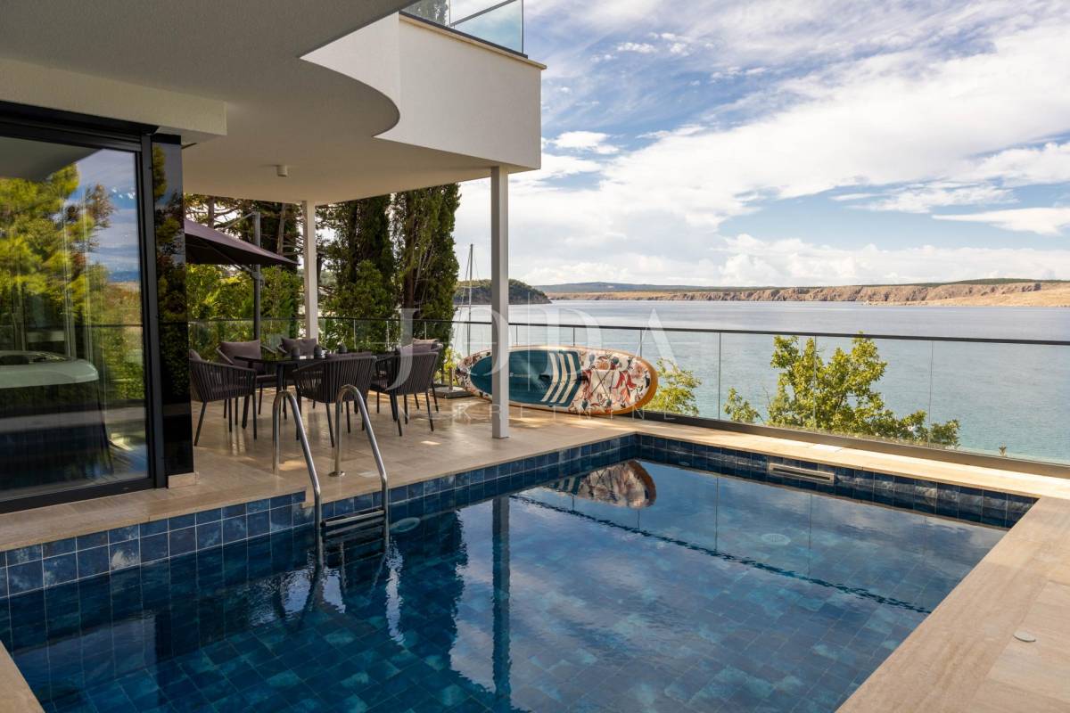 Velika Terasa s koje se pruža pogled na more, otok Krk i krčki most. Ugradbeni ormari sa skrivenim vratima. Iza skrivenih vrata nalazi WC. Druga skrivena vrata vode u spavaću sobu sa svojom kupaonom i kadom, te izlazom na malu terasu s koje se također pruža lijep pogled na more. Sve u zelenilu i miru! Ukupno ca. 80 m2 površine.