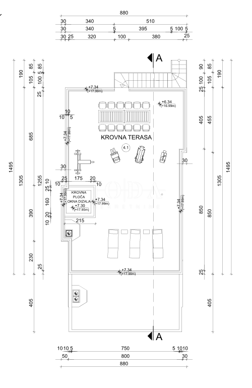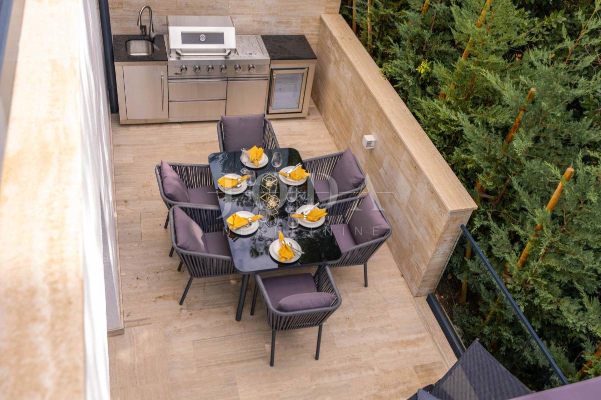Krovna Terasa od ca. 105 m2 s vanjskim pristupom i prekrasnim pogledom. Priključak vode i struje i moguucniost za razne sadrzaje, od Jacuzzia; Mini Bara, Teretane ili slicno.
