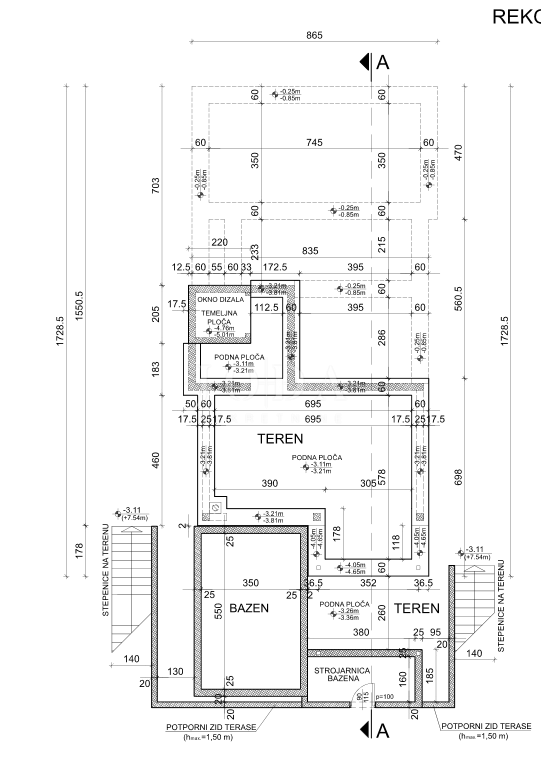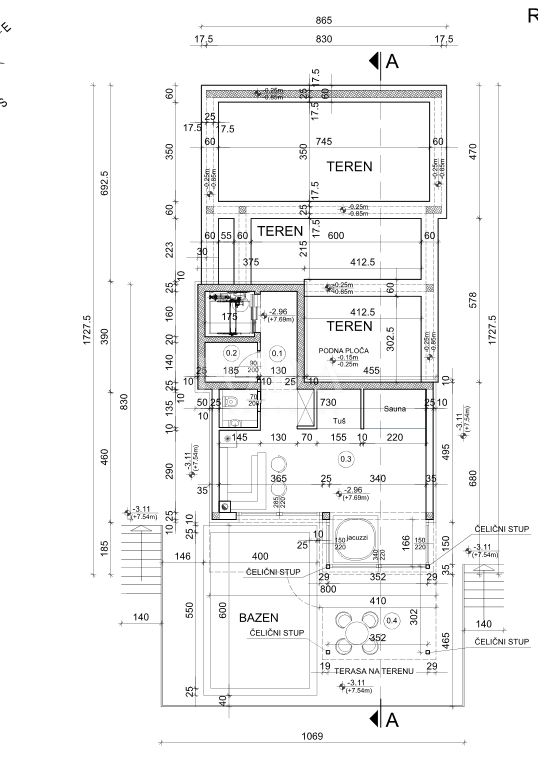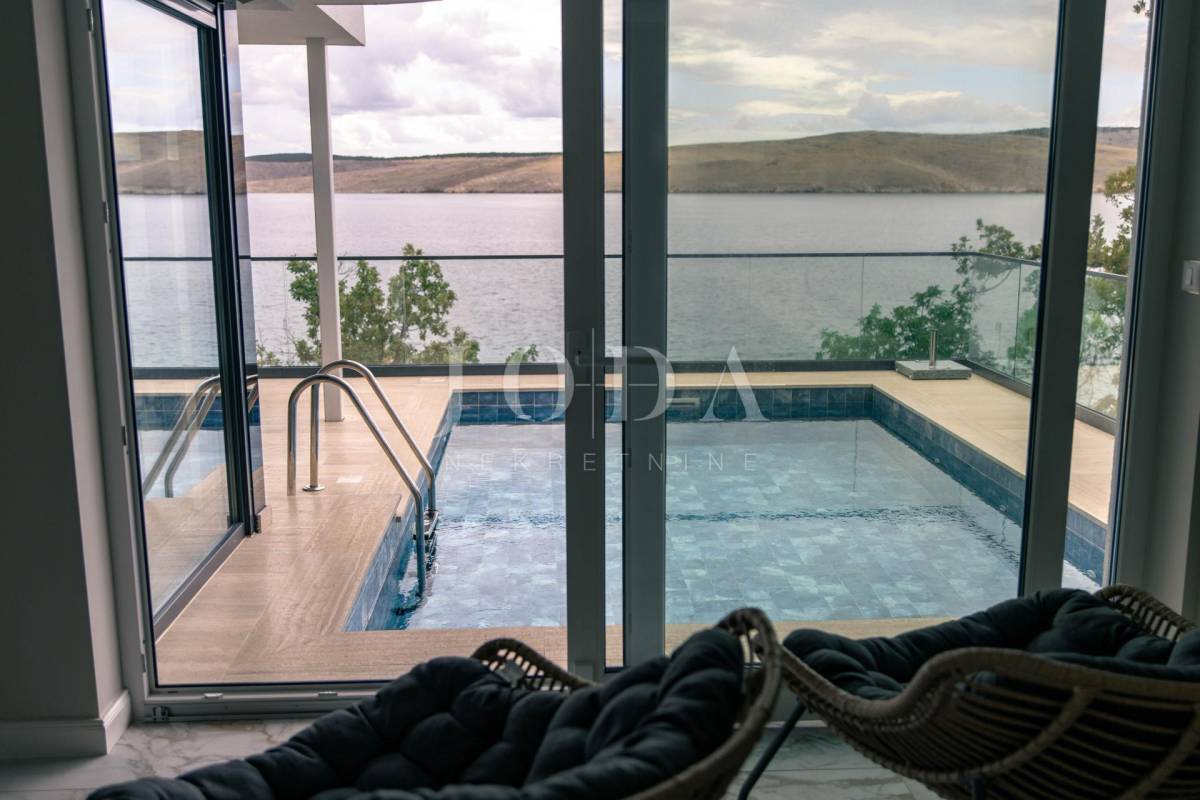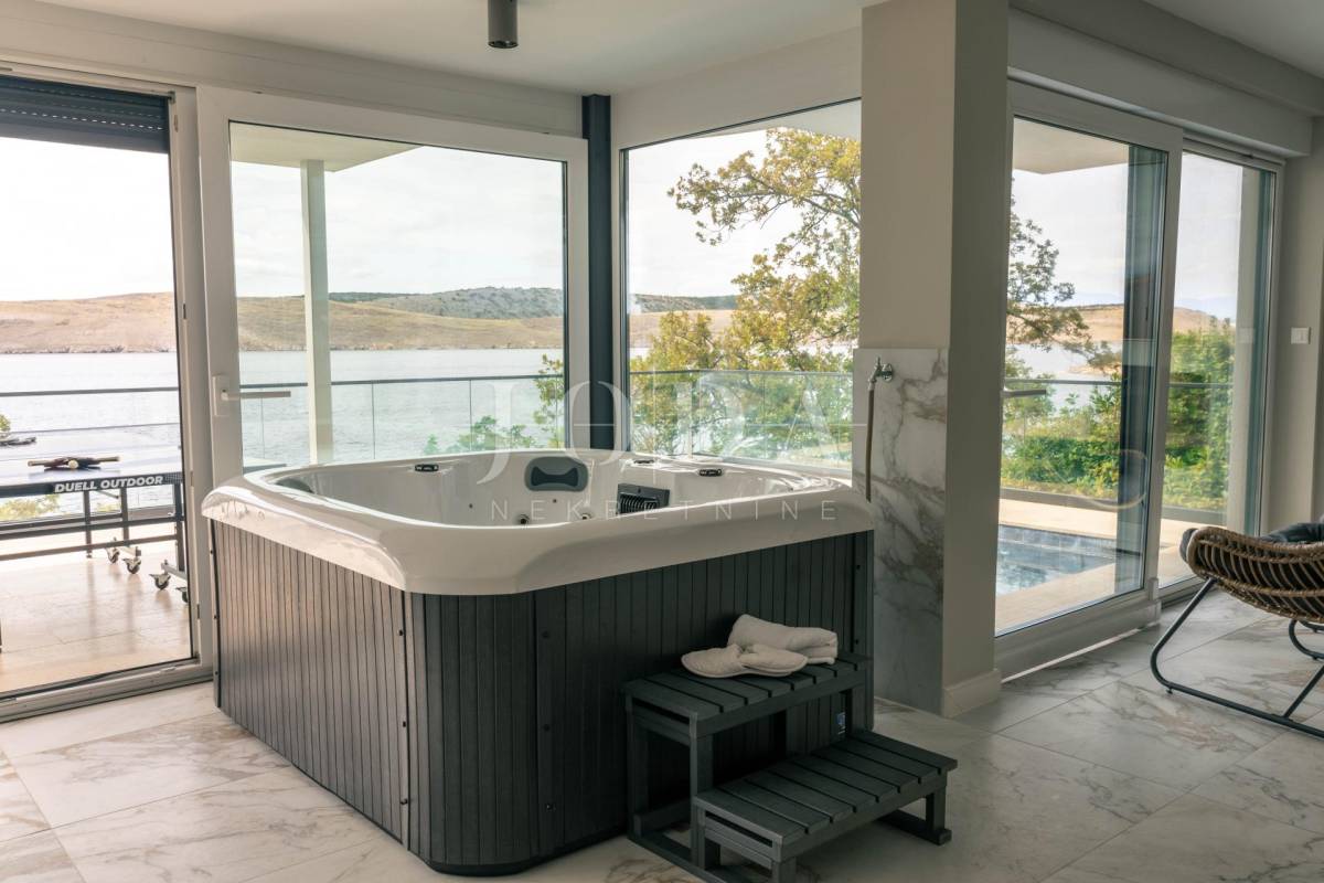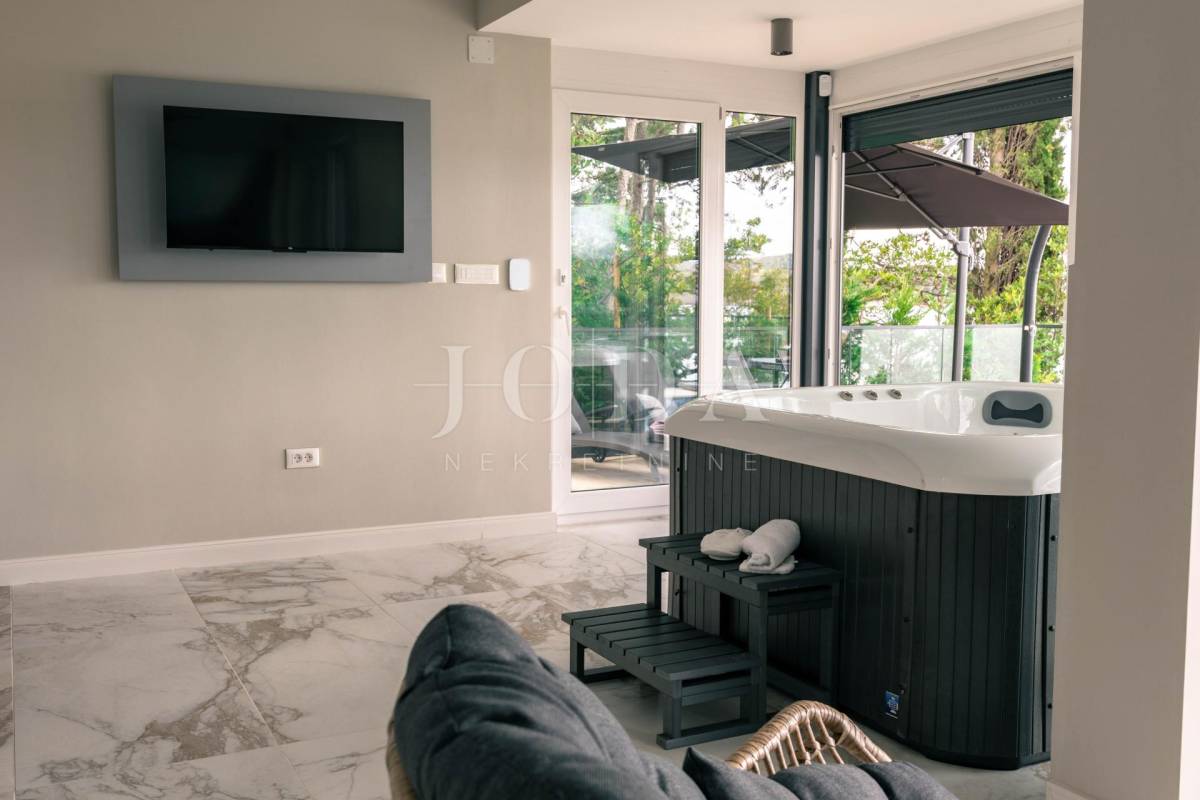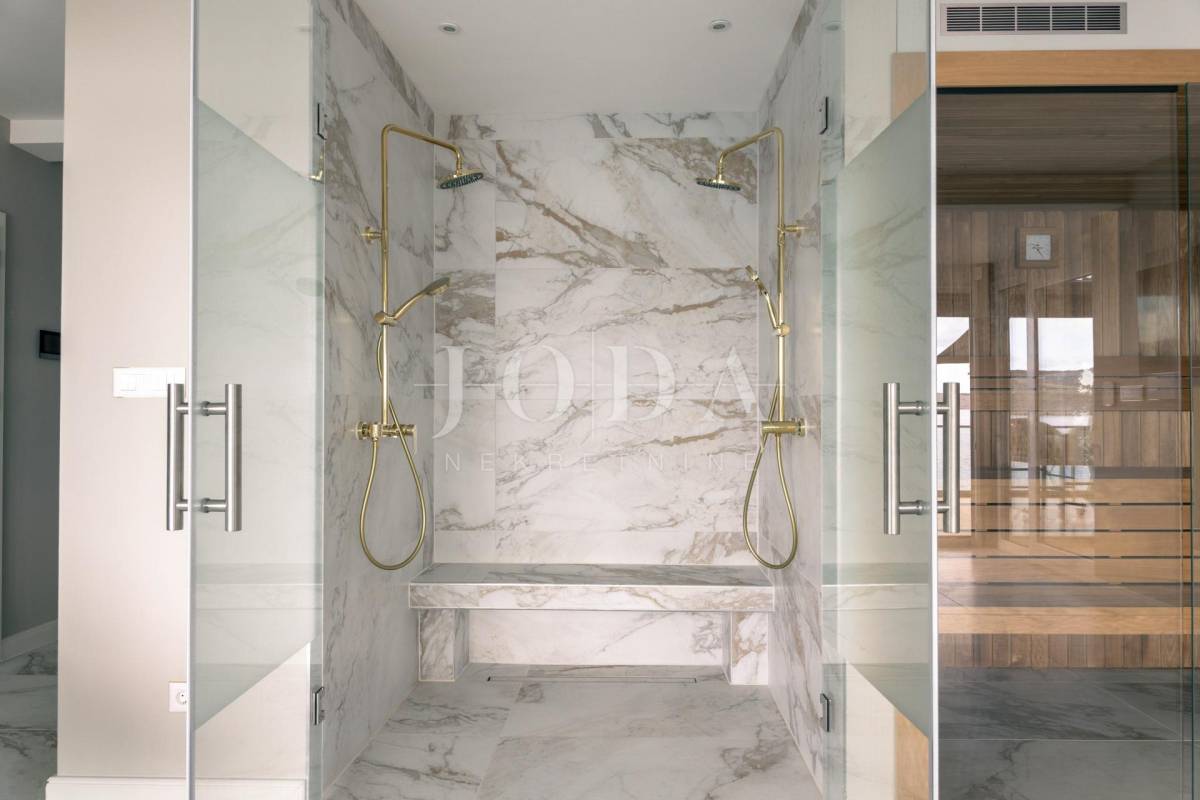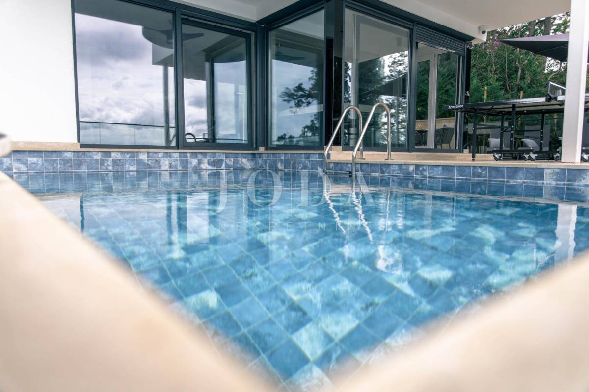 Ulaz po kamenim stepenicama do prve etaže "WELLNESS" na kojoj se nalazi bazen ( djelomično natkriven, s zagrijavanjem vode i masažama ), vanjski tuš i velika terasa djelomično natkrivena. Ljetna moderna vanjska kuhinja.