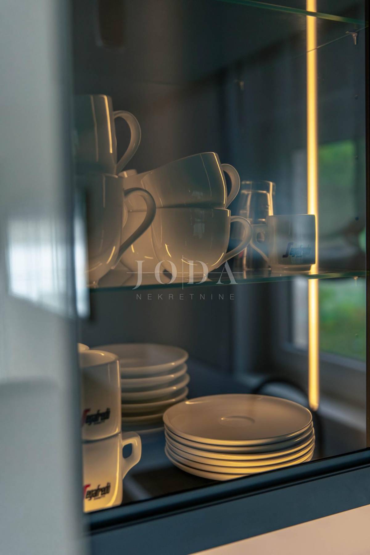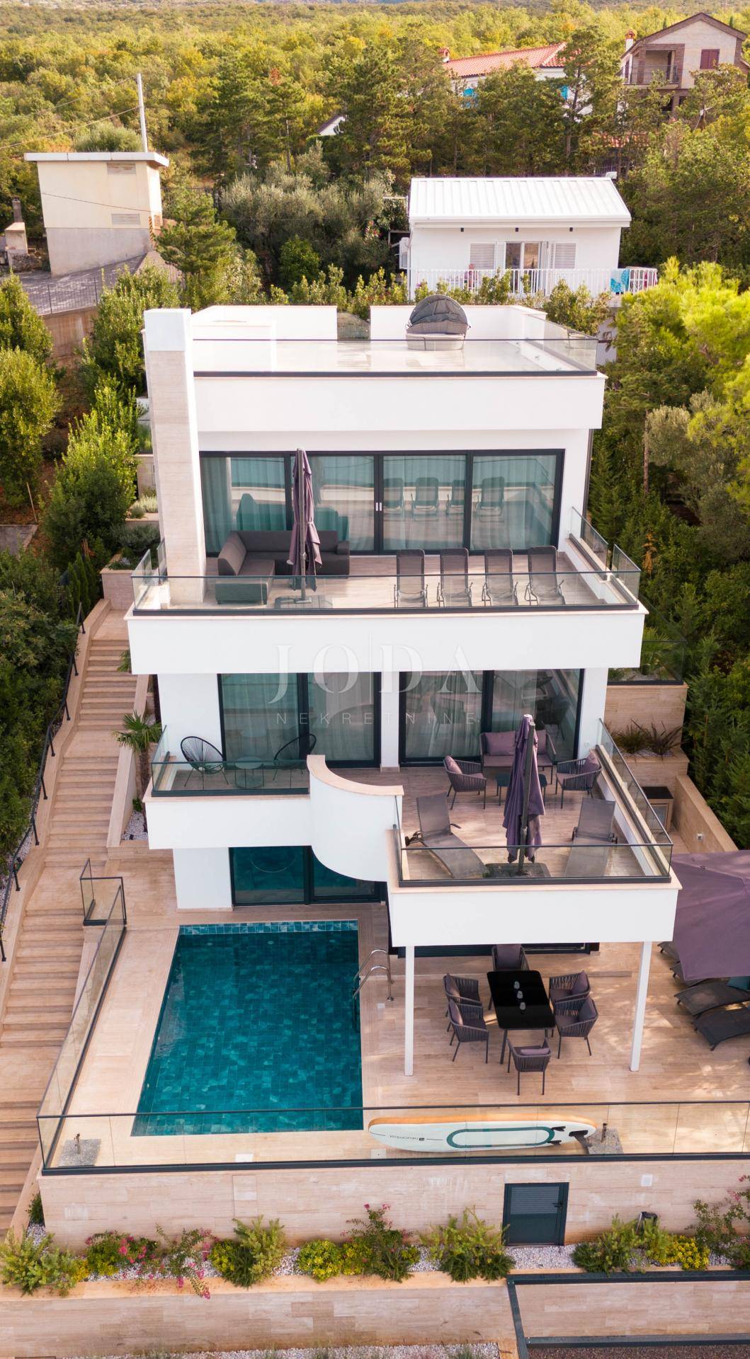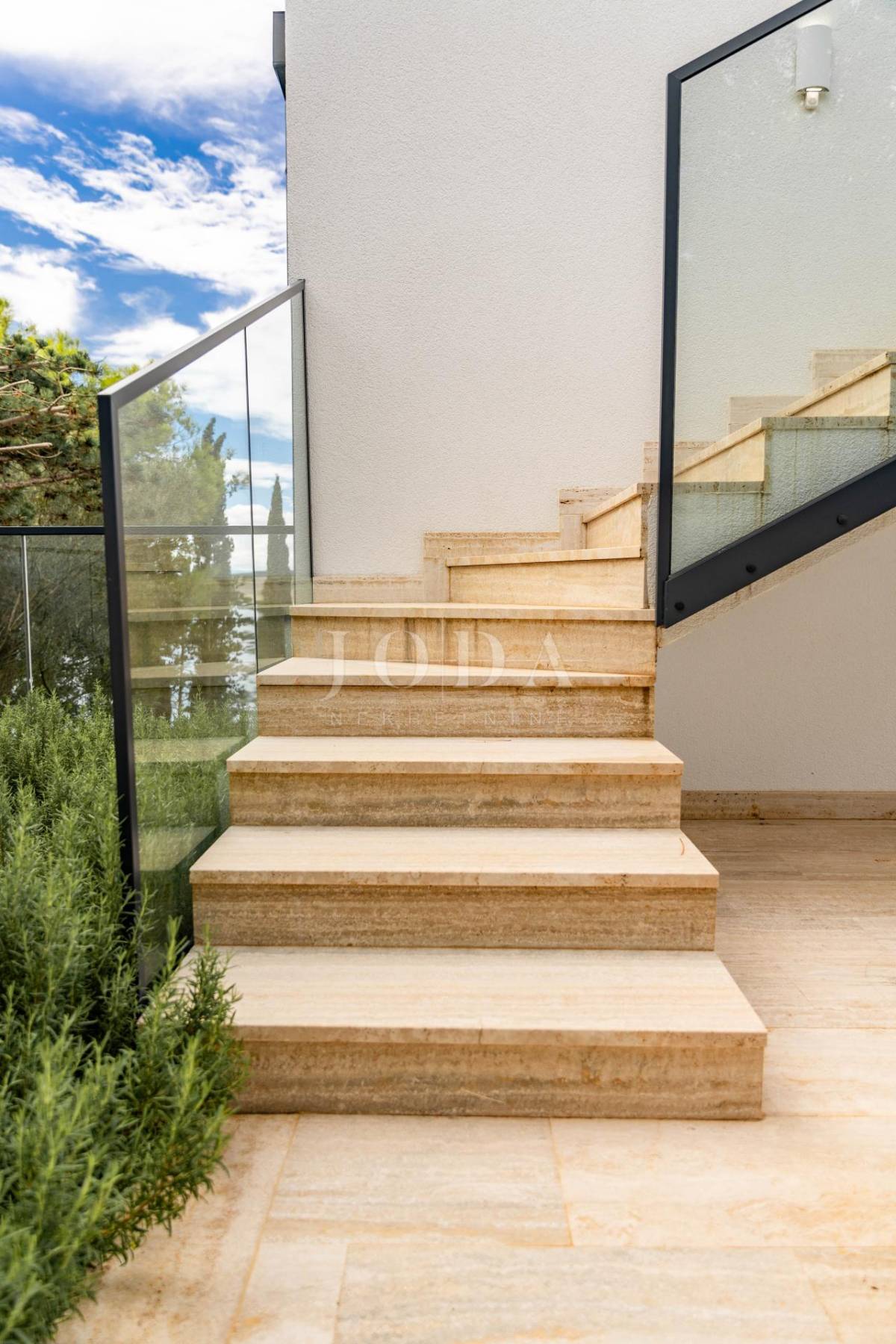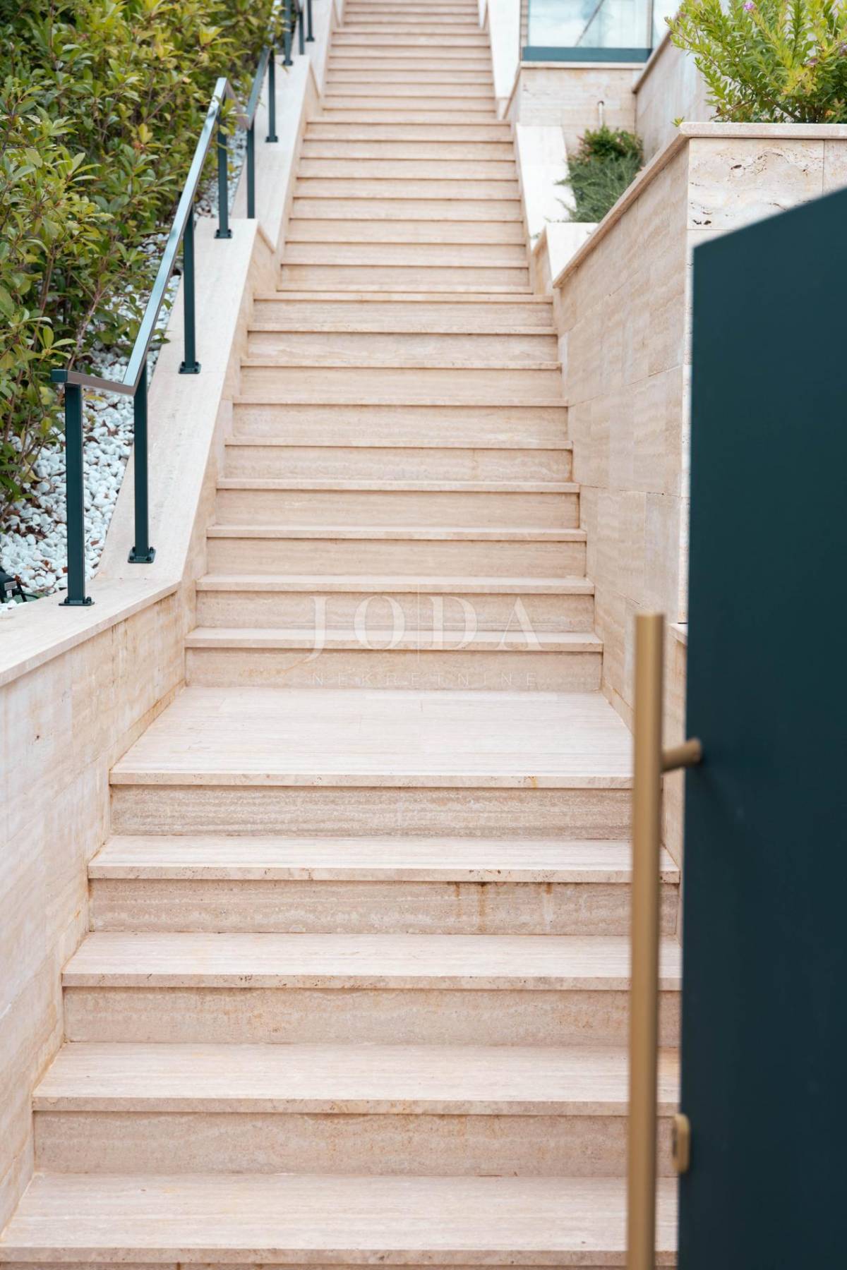 Villa je velikim dijelom u Kamenu (Traventino kamen uvezen iz Rima). Ostatak kuce je u bijeloj fasadi. Stolarija izvana u antracit boji, unutra bijela. Velike staklene stijene i elektricne roletne.Video Nadzor, grijanje, hladjenje, rasvjeta i ostalo na aplikaciji.